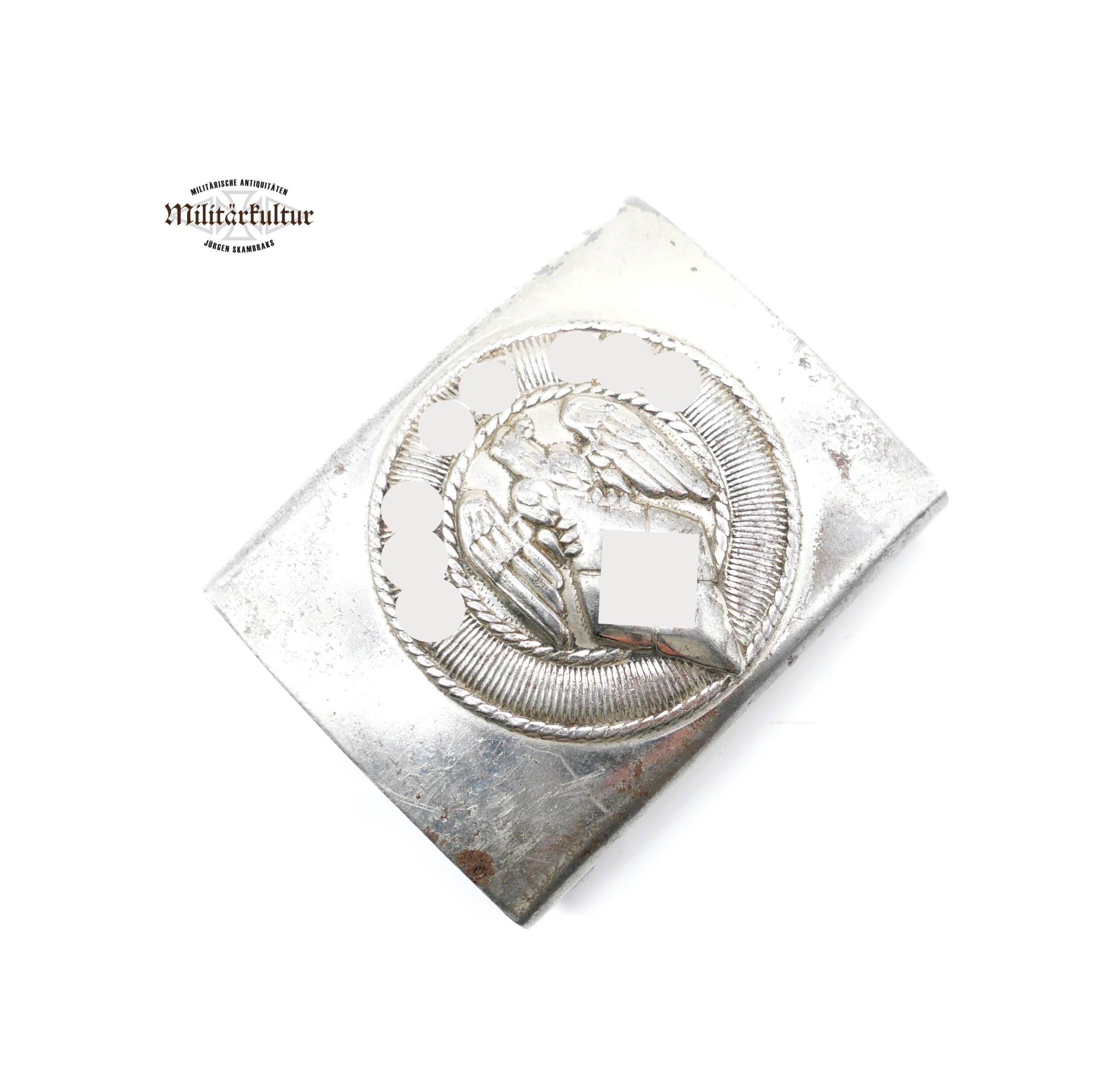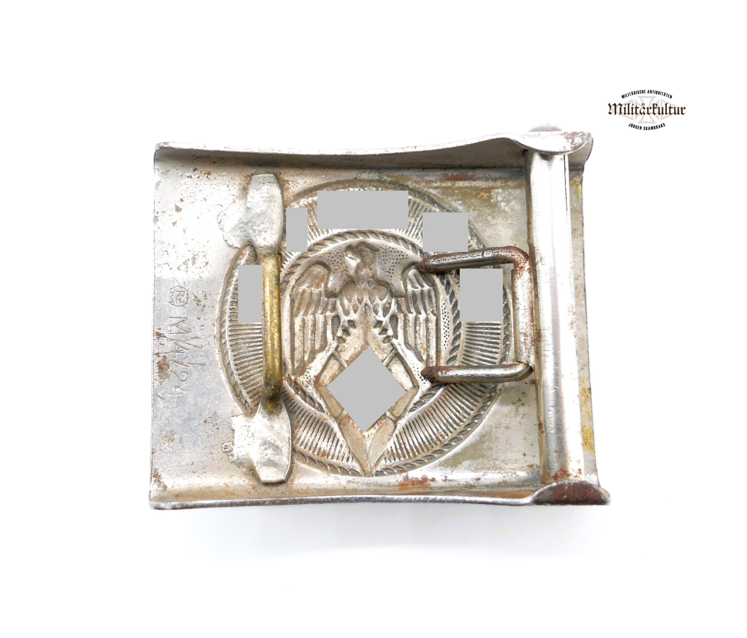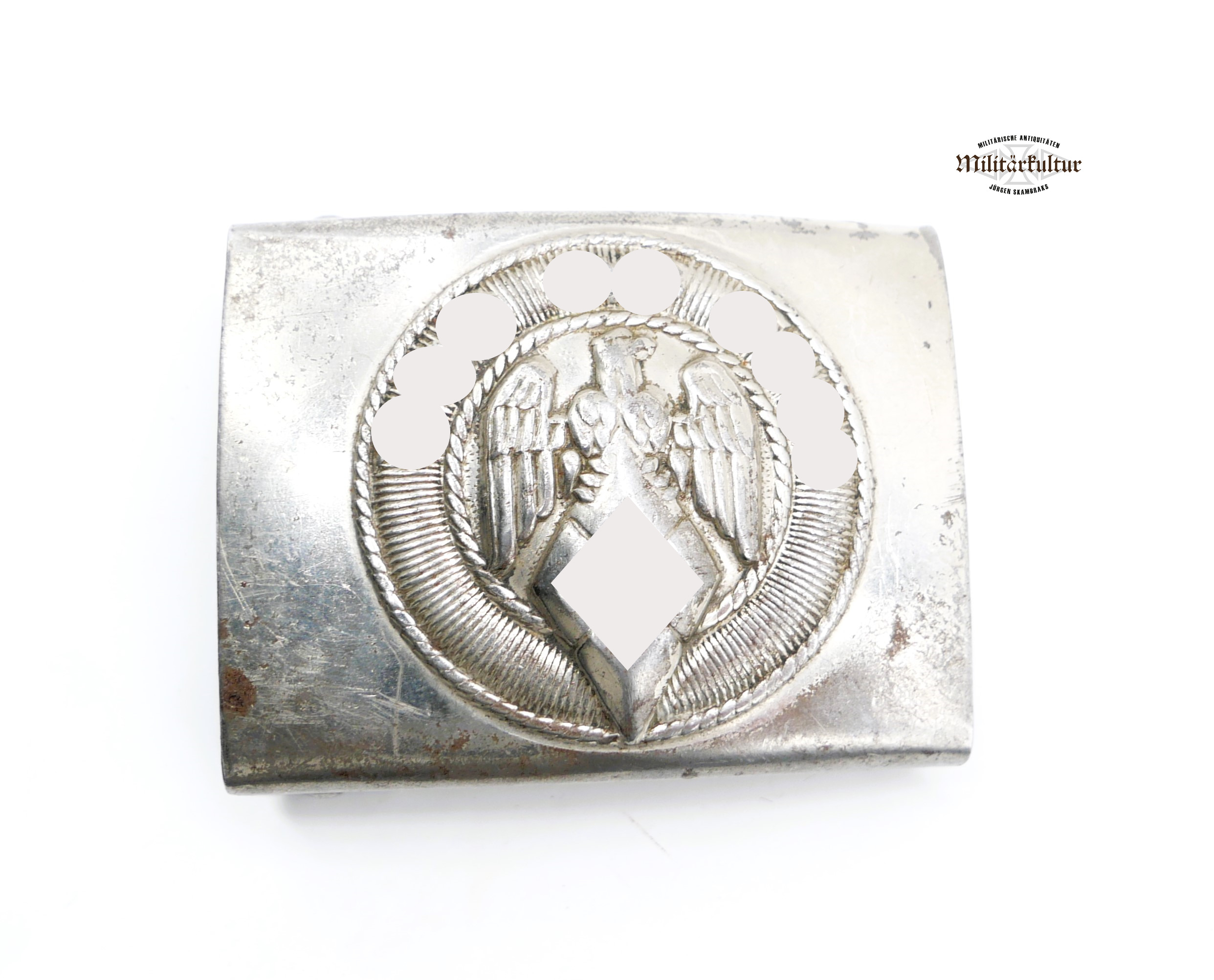 HJ (Hitlerjugend) Koppelschloss – Hersteller M4/24 (Friedrich Linden, Lüdenscheid). Eisen vernickelt. Hakenfang wurde wohl mal nachgelötet. Getragener Zustand.