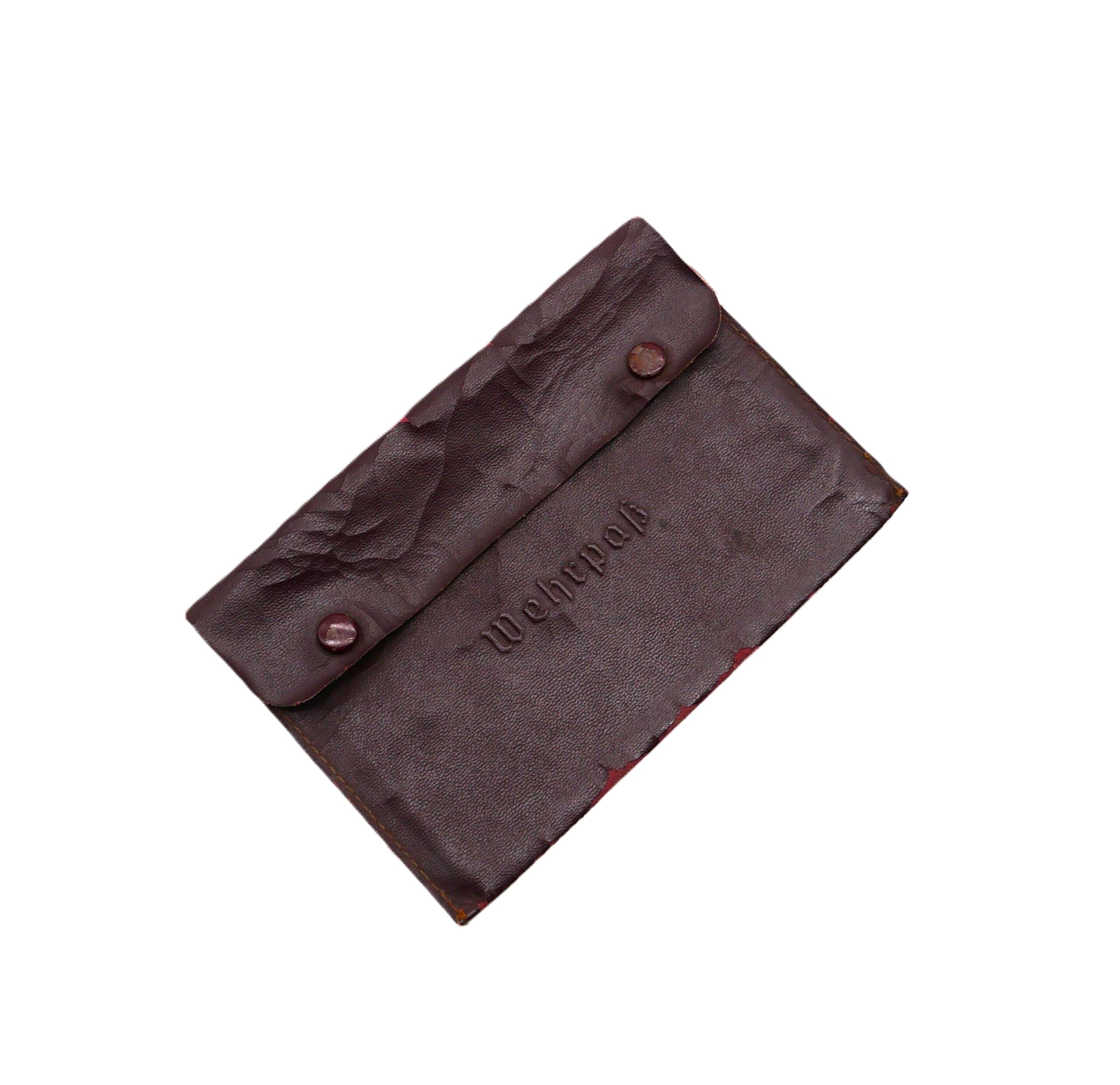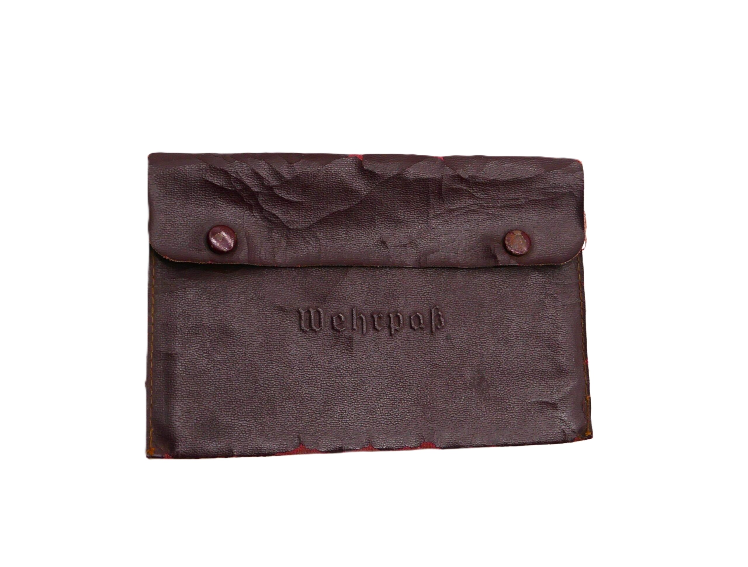 Tasche für den Wehrpass. Aus Kunststoff. Masse 16,6 cm x 11,2 cm. Etwas ausgehärtet mit Gebrauchsspuren.