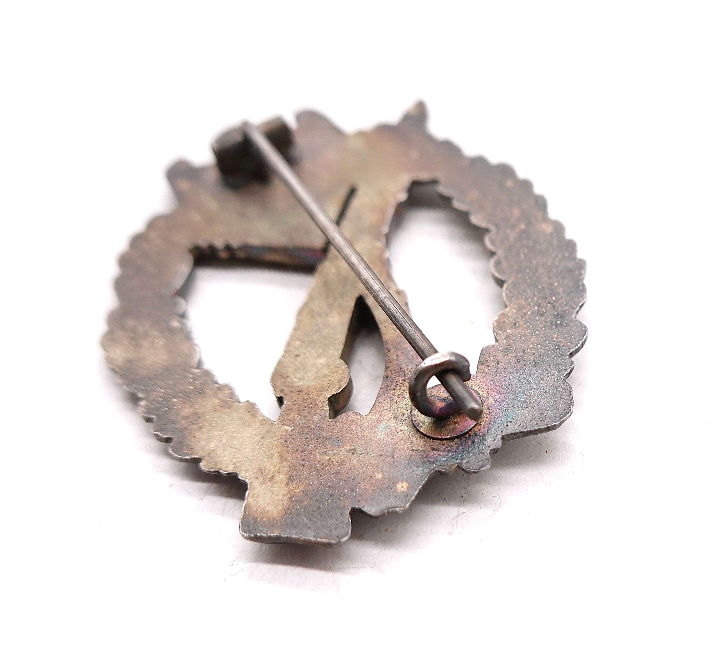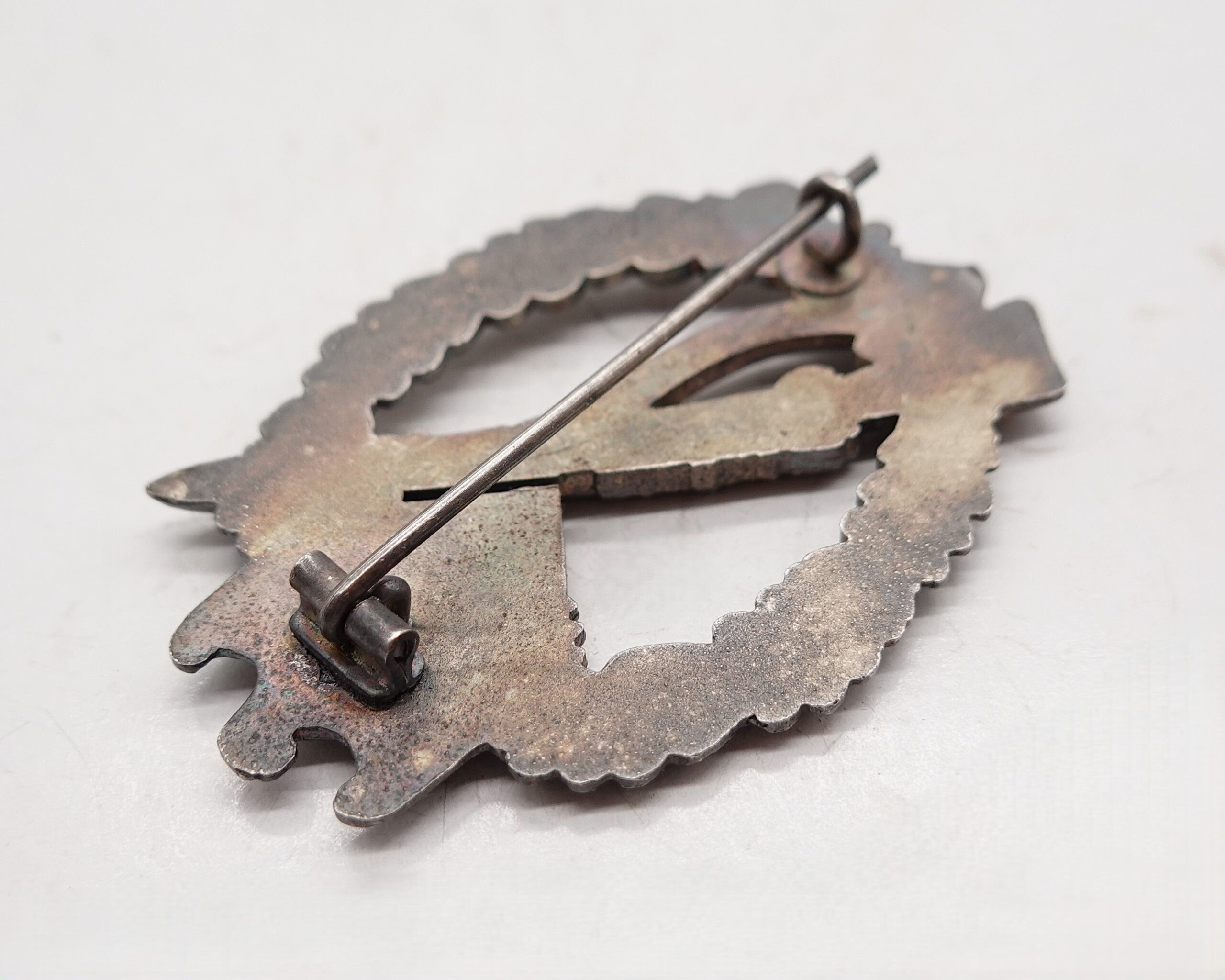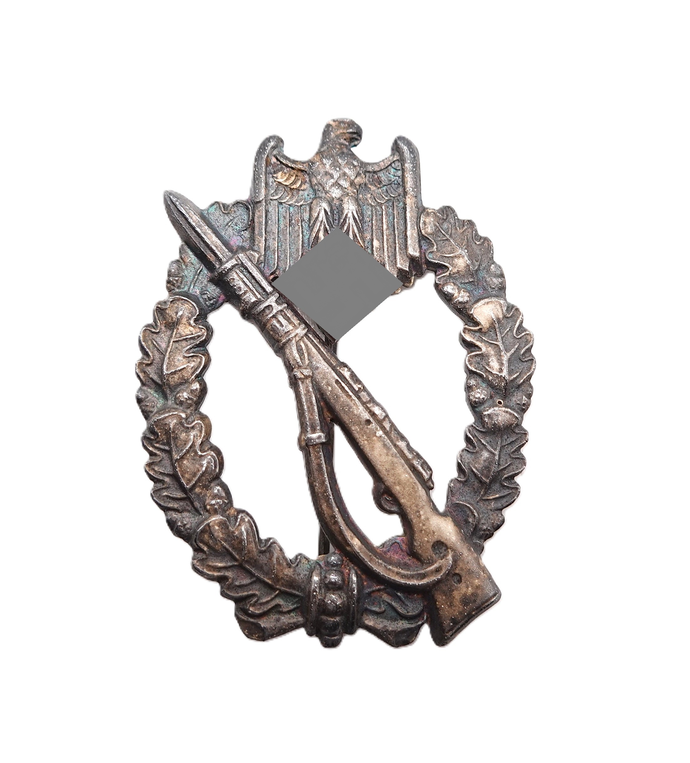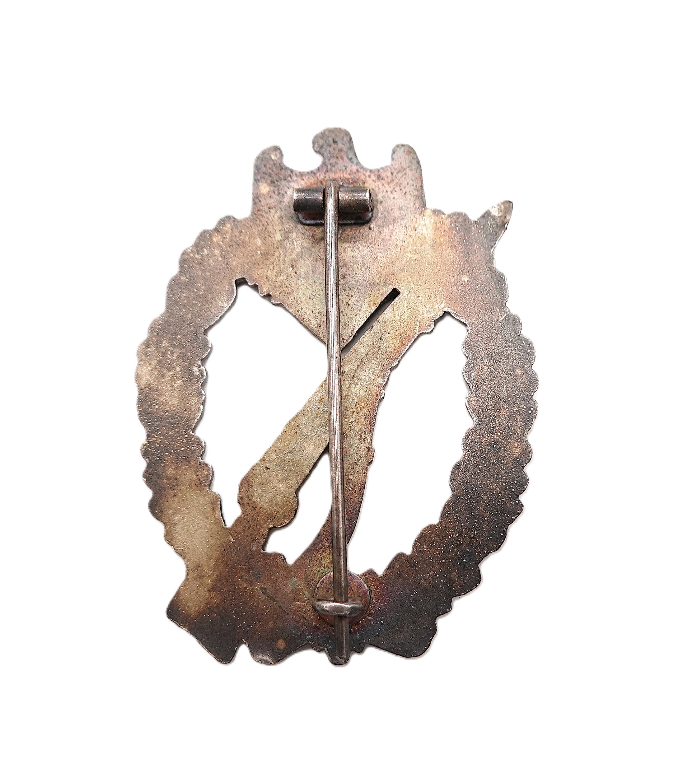 Infanterie Sturmabzeichen Bronze. Ohne Markierung. Wied aber dem Hersteller E. Ferd. Wiedmann, Frankfurt am Main zugesprochen. Nadelsystem öffnet und schließt einwandfrei. Getragener Zustand.