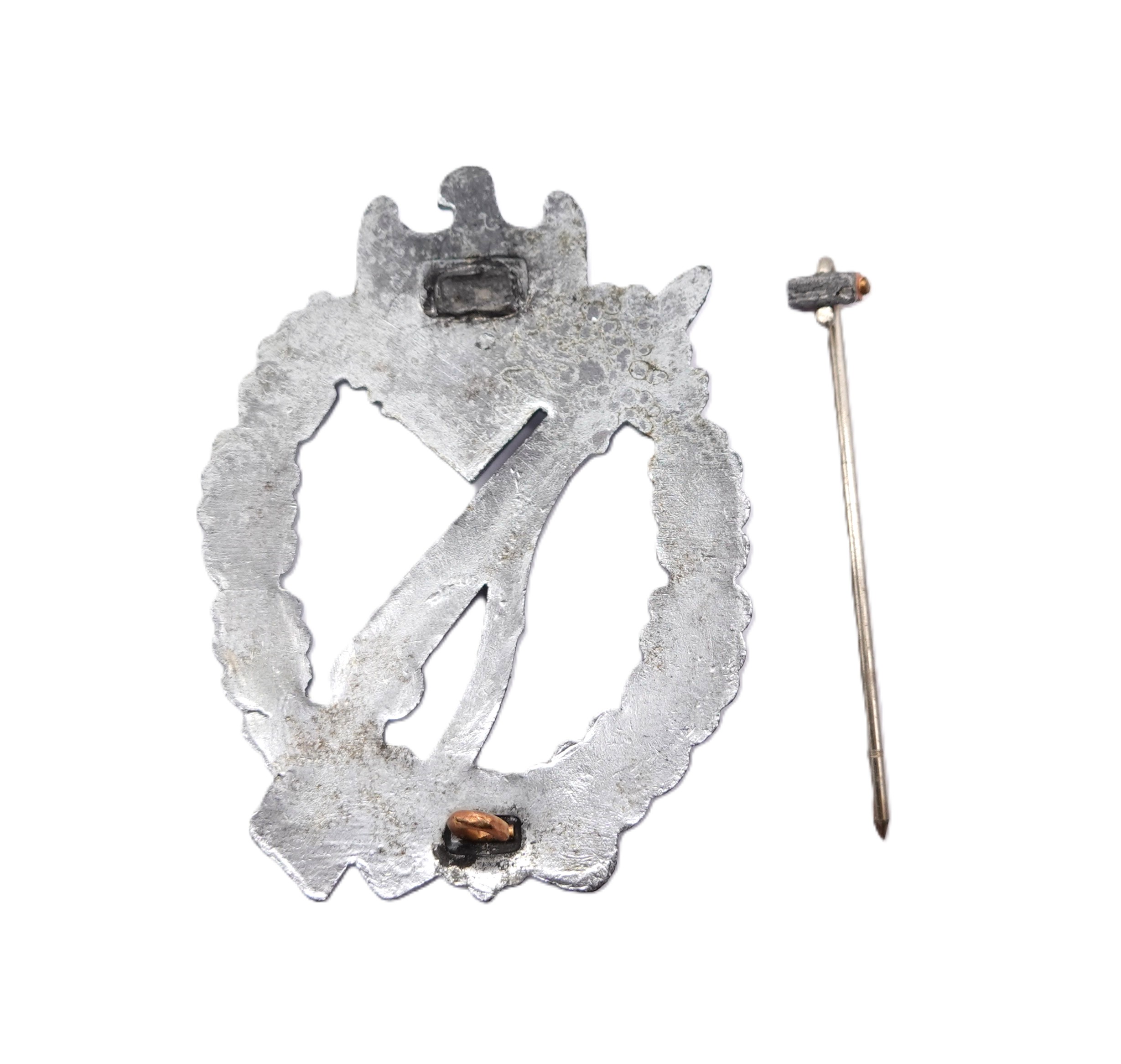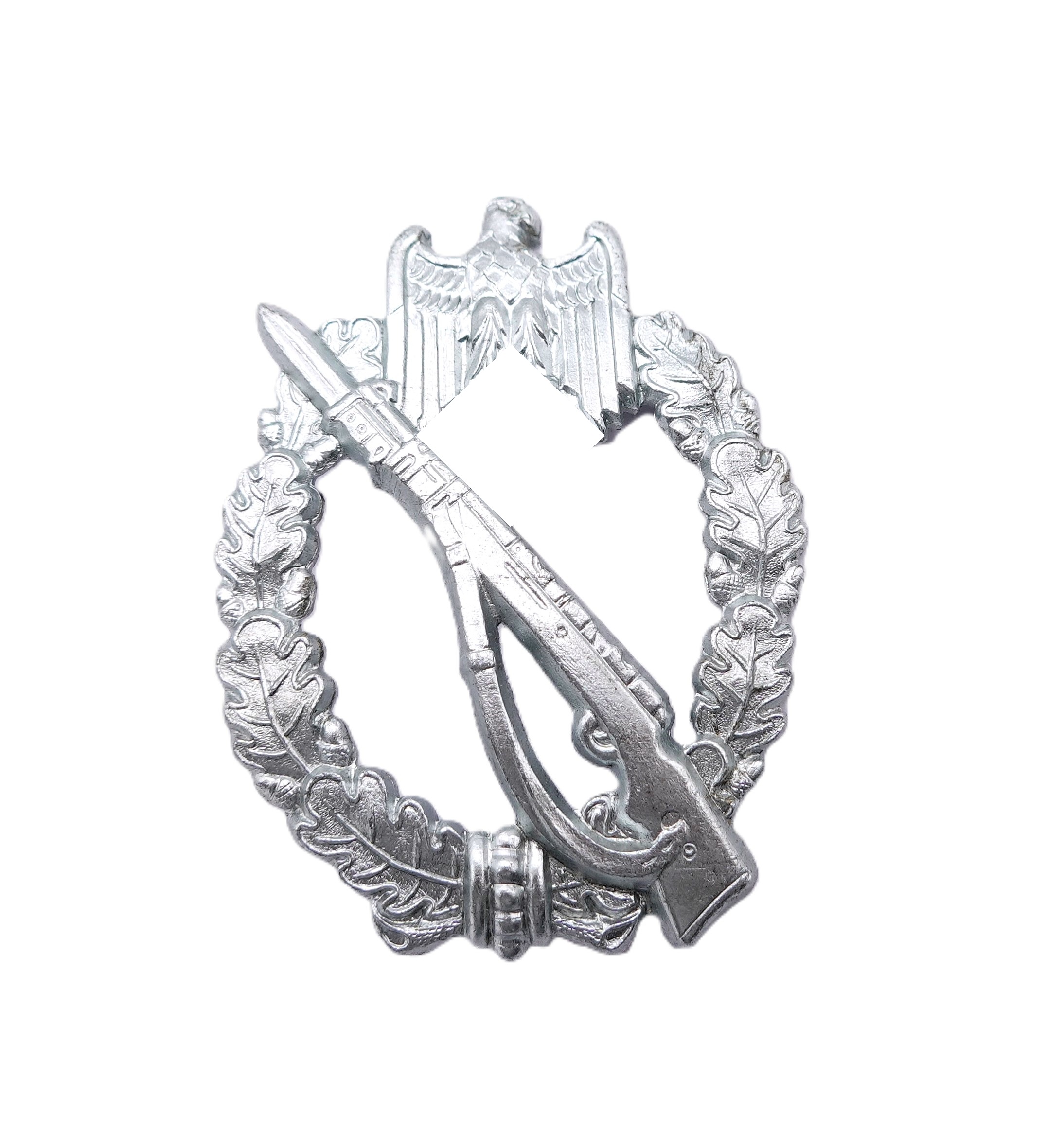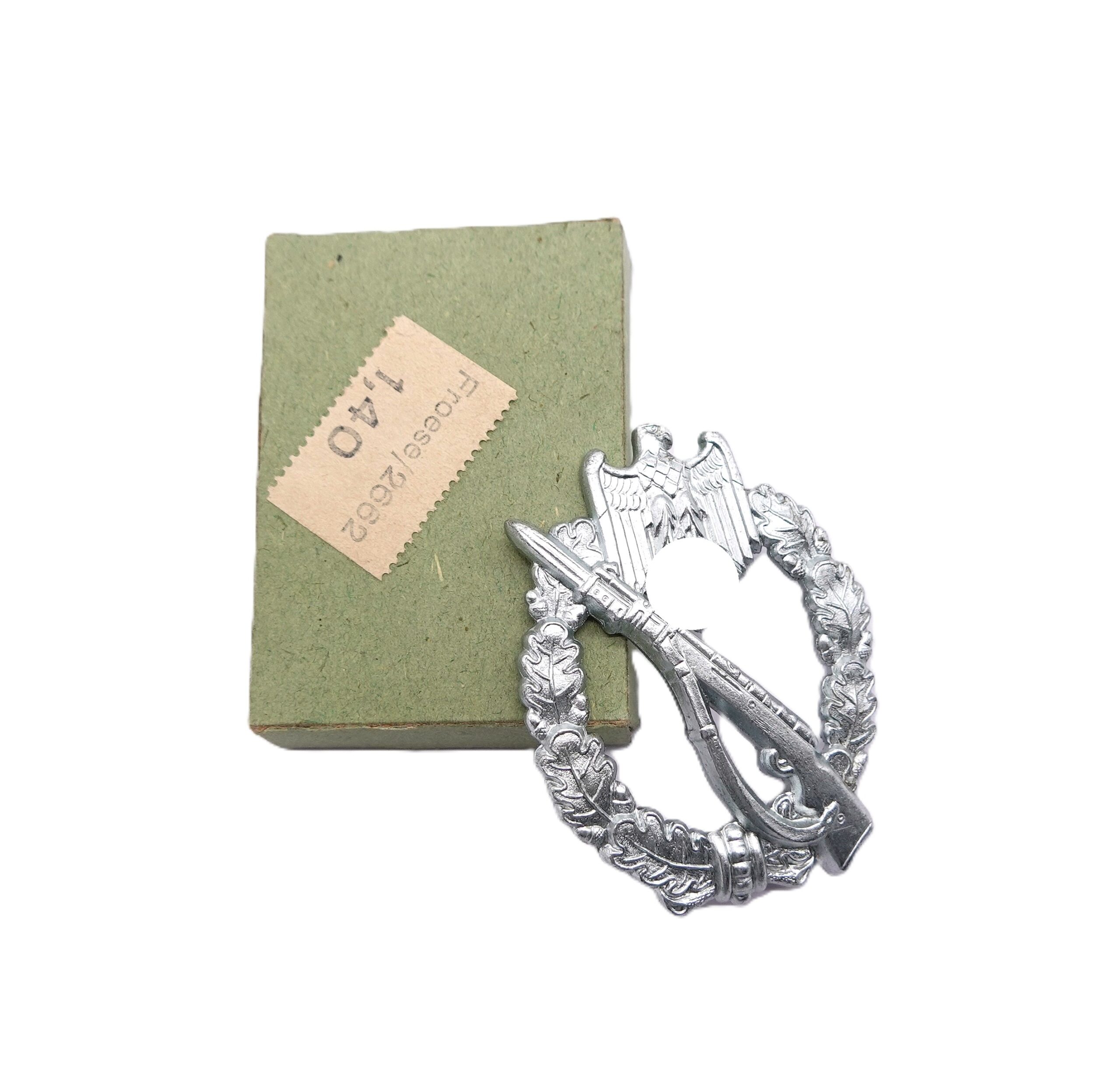 Infanterie Sturmabzeichen Silber. Ohne Hersteller. In der Verkaufsschachtel des Händlers Wilhelm Froese. Siehe Preisschild. Leider ist im Laufe der Jahre die Nadel abgefallen. Die liegt aber bei und läßst sich von jeden Goldschmied mit wenigen Handgriffen wieder anbringen. Ansonsten ein ungetragener Bestzustand mit frostiger Versilberung.