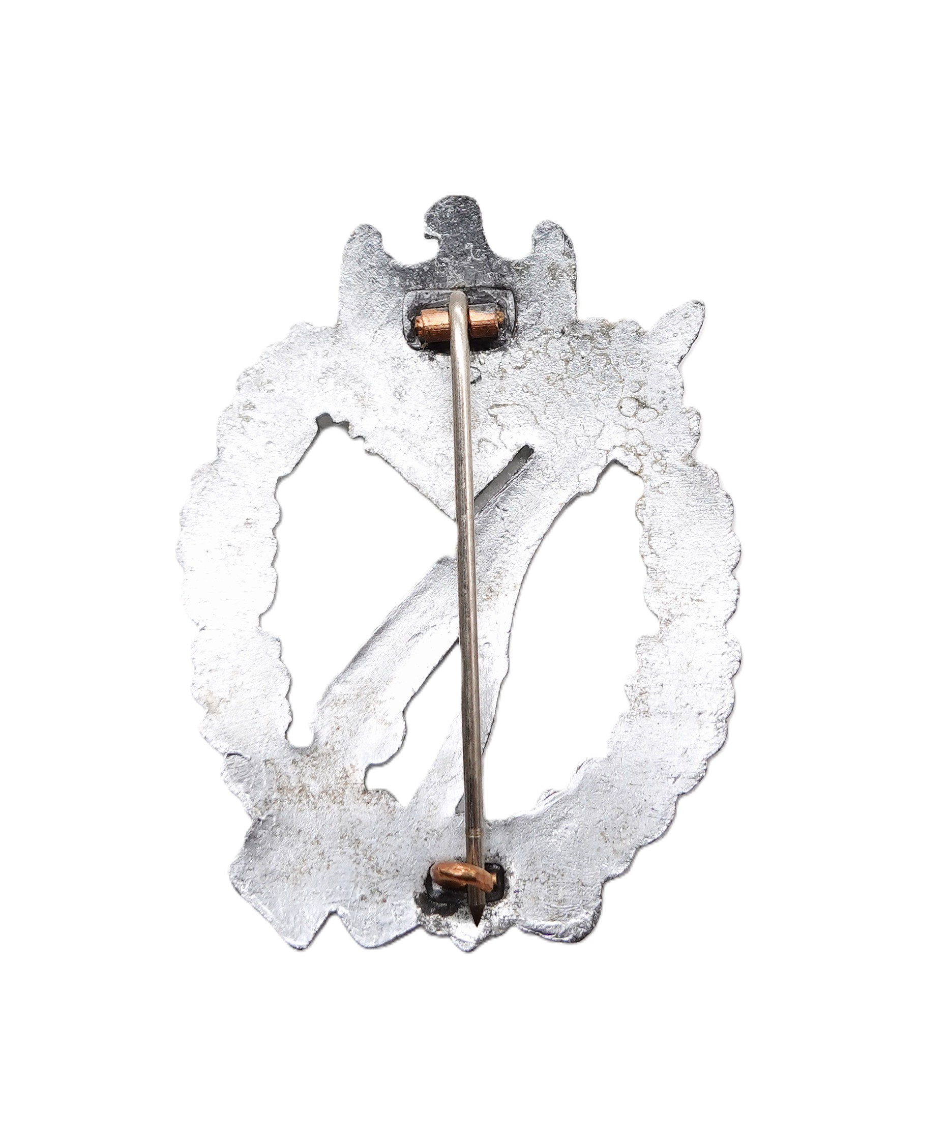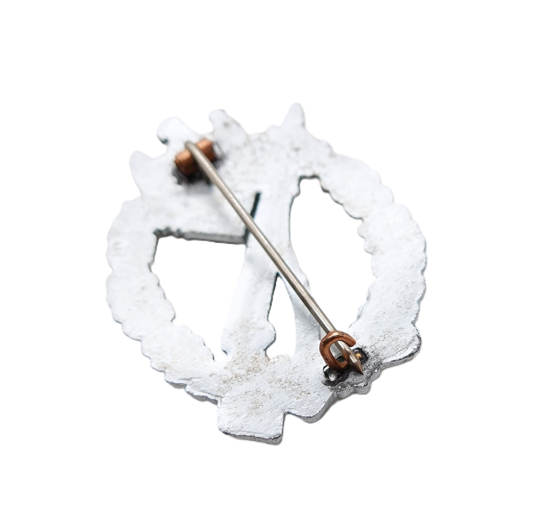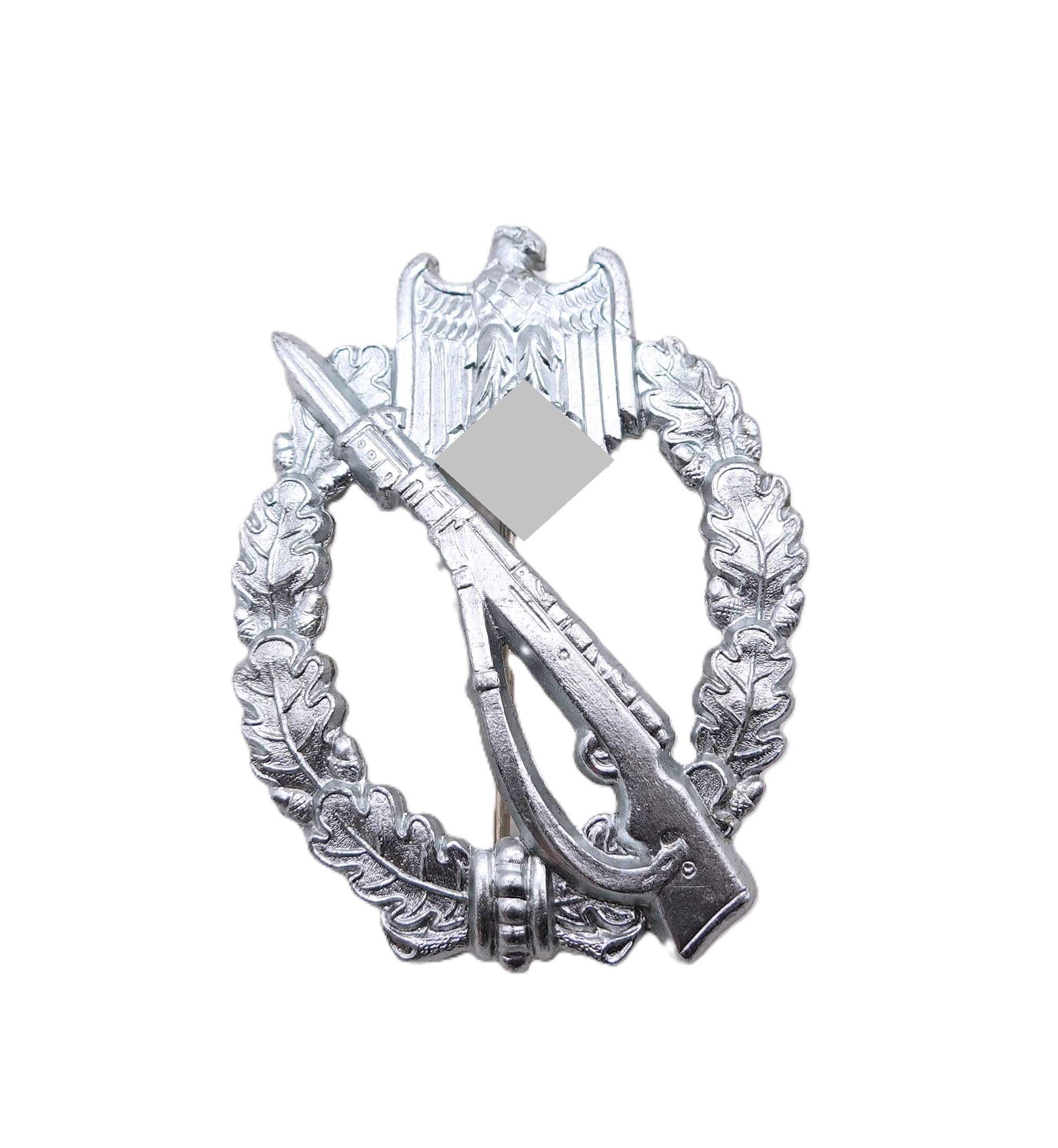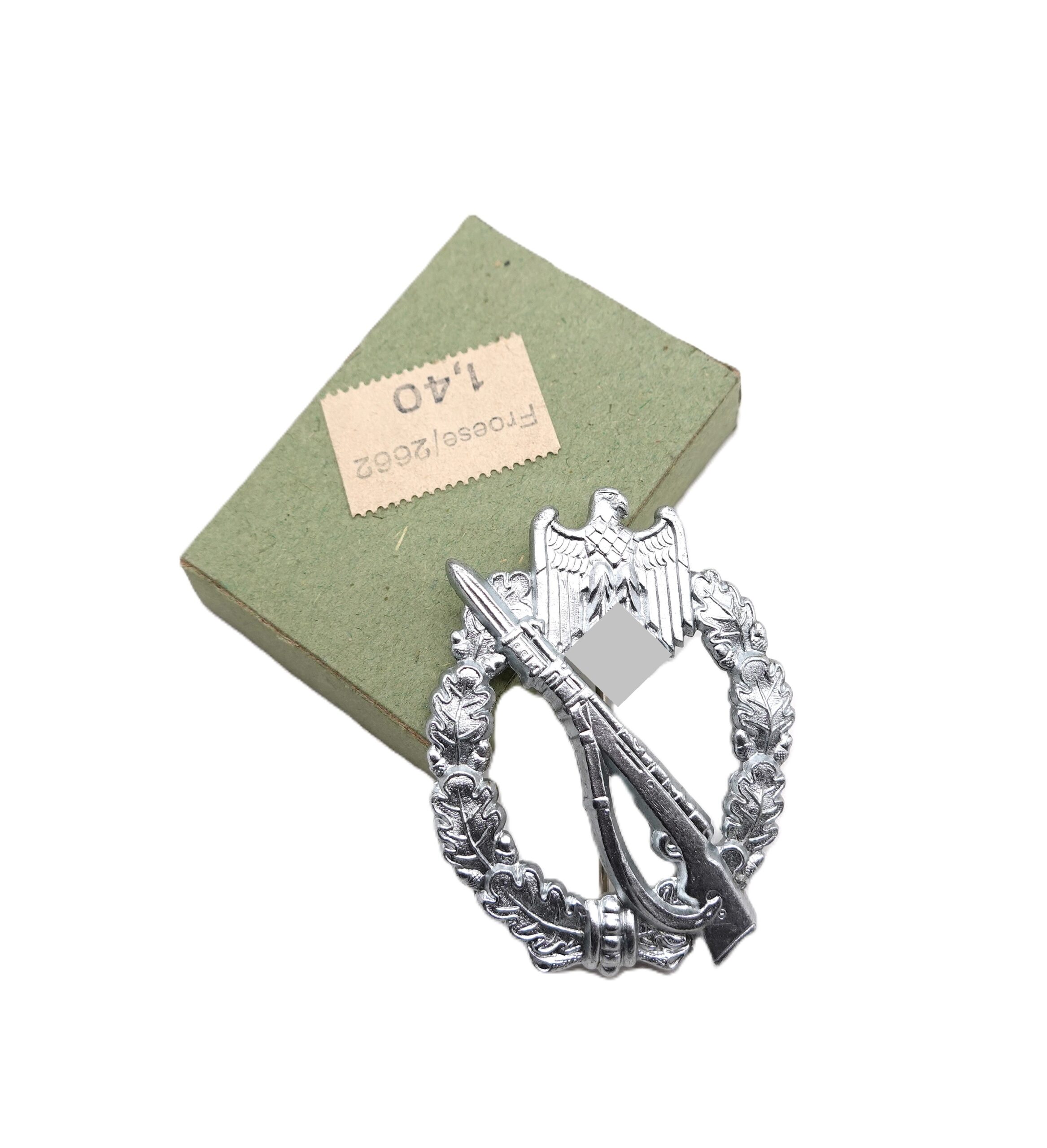 Infanterie Sturmabzeichen Silber. Ohne Hersteller. In der Verkaufsschachtel des Händlers Wilhelm Froese. Siehe Preisschild. Ungetragener Bestzustand mit frostiger Versilberung.