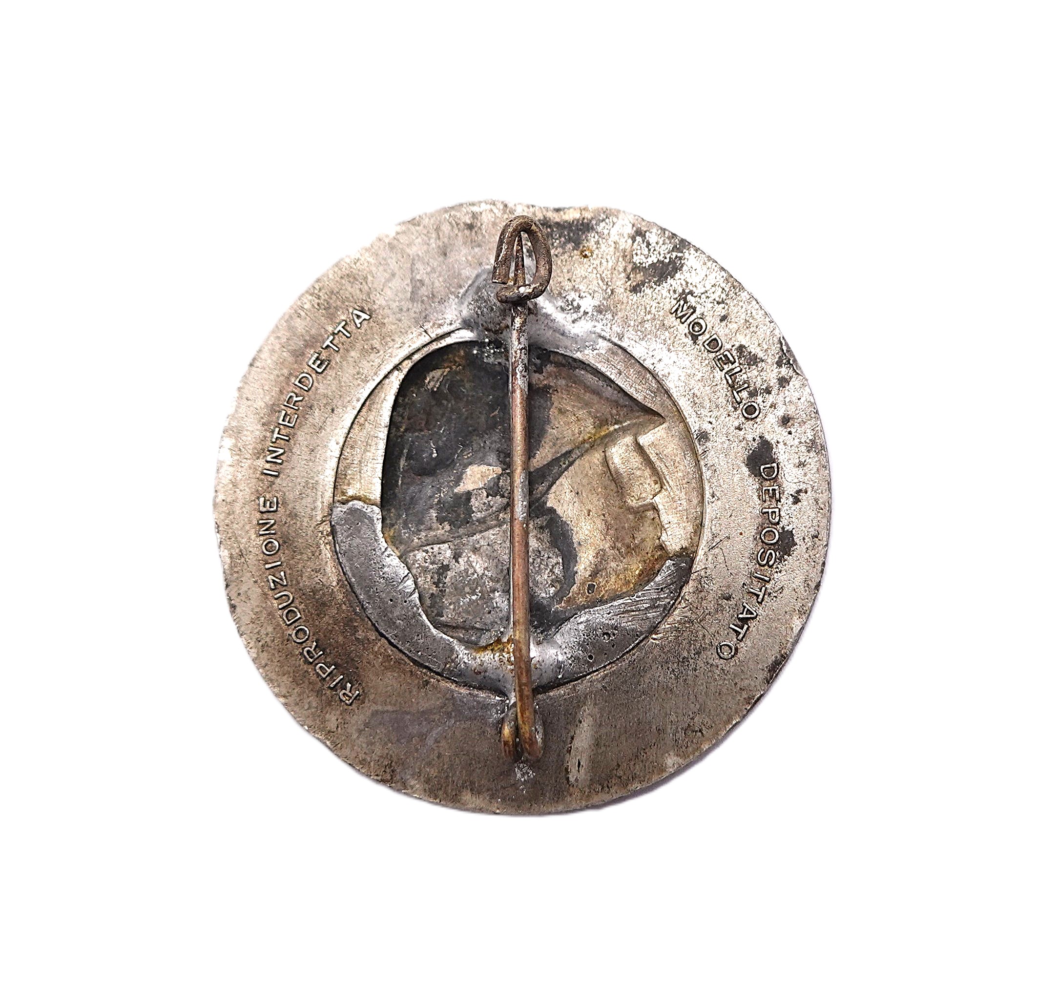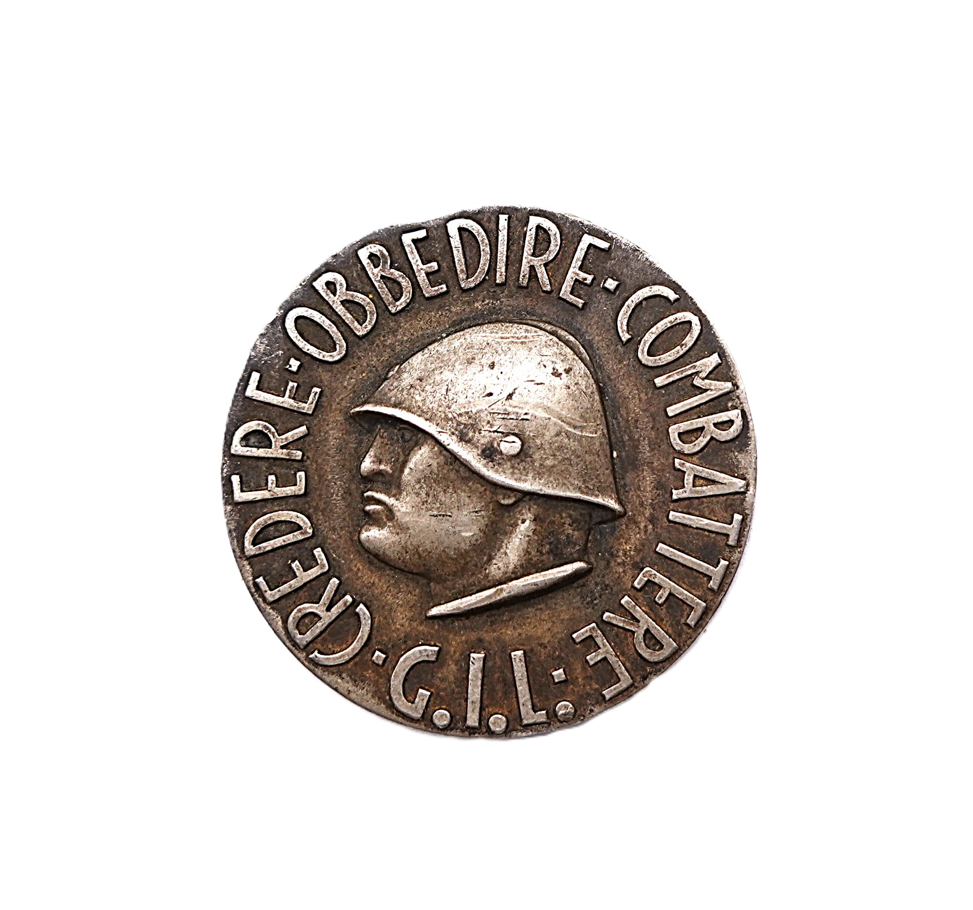 Italien – Abzeichen Medaille G.I.L. Credere Obbedire Combattere. Faschistische Jugend. Auf der Rückseite steht  Modello Despositato. Riproduzione Interdetta. Nadel wurde etwader schlecht verlötet oder mal nachgelötet. Am Rand eine Delle. Getragener Zustand.