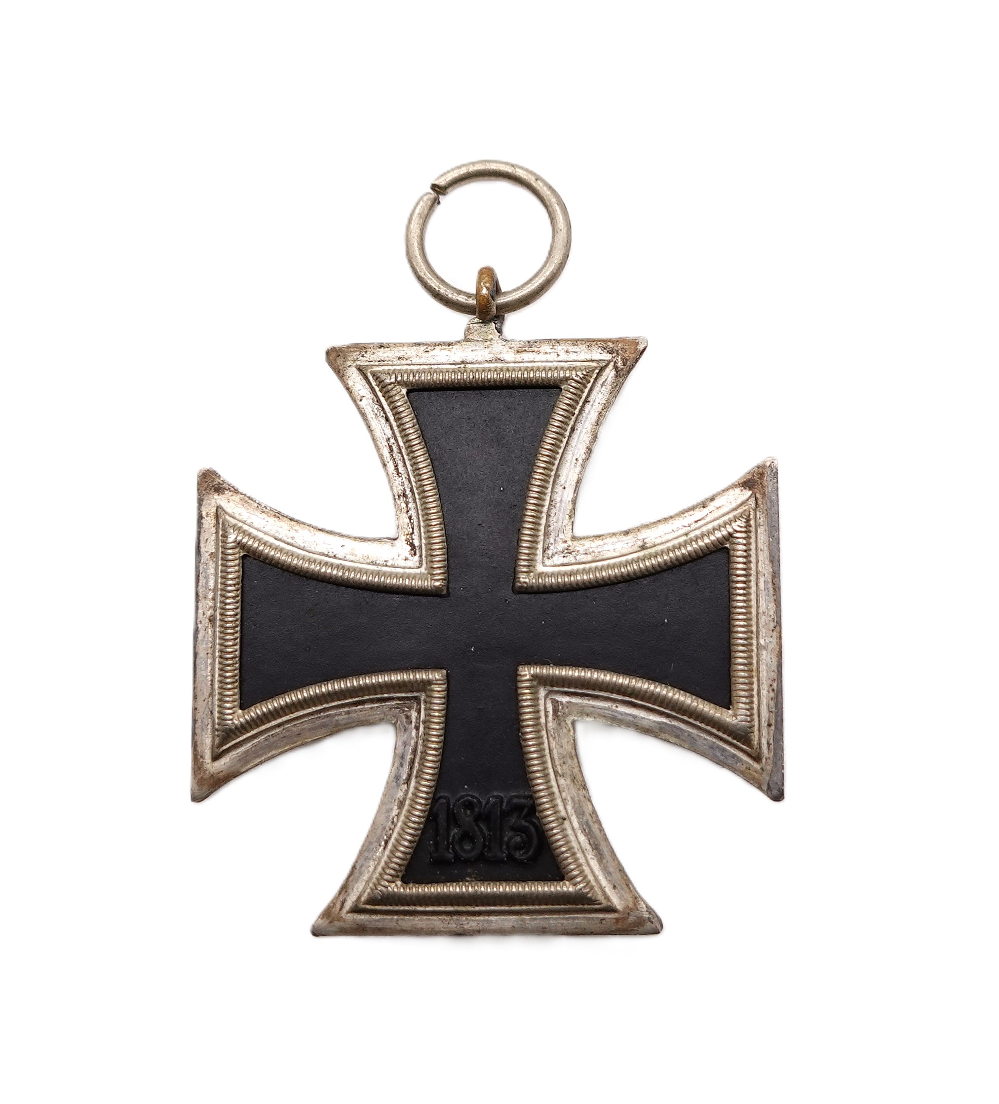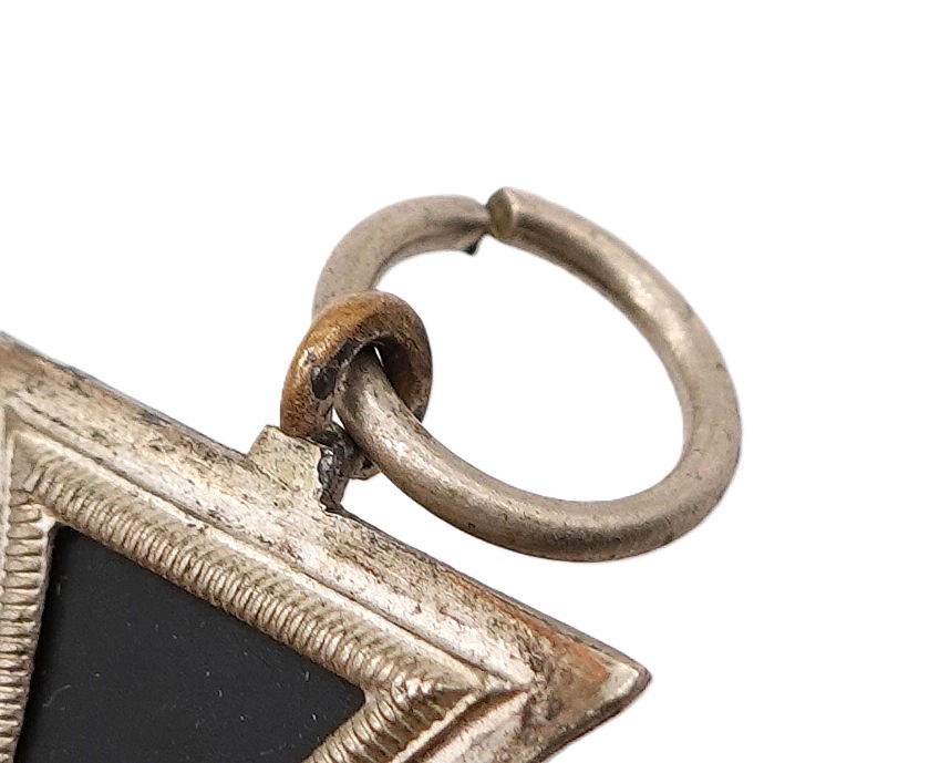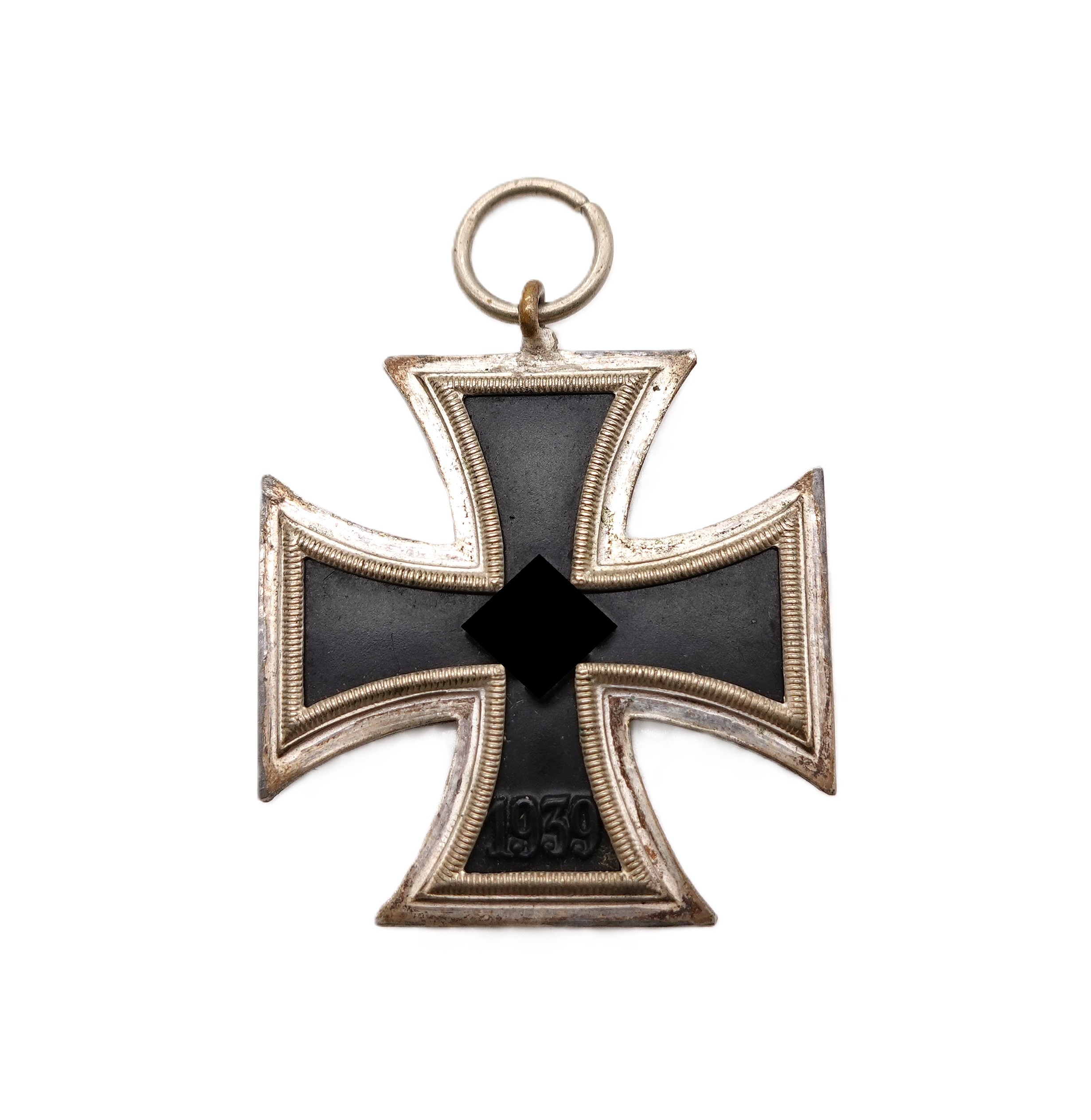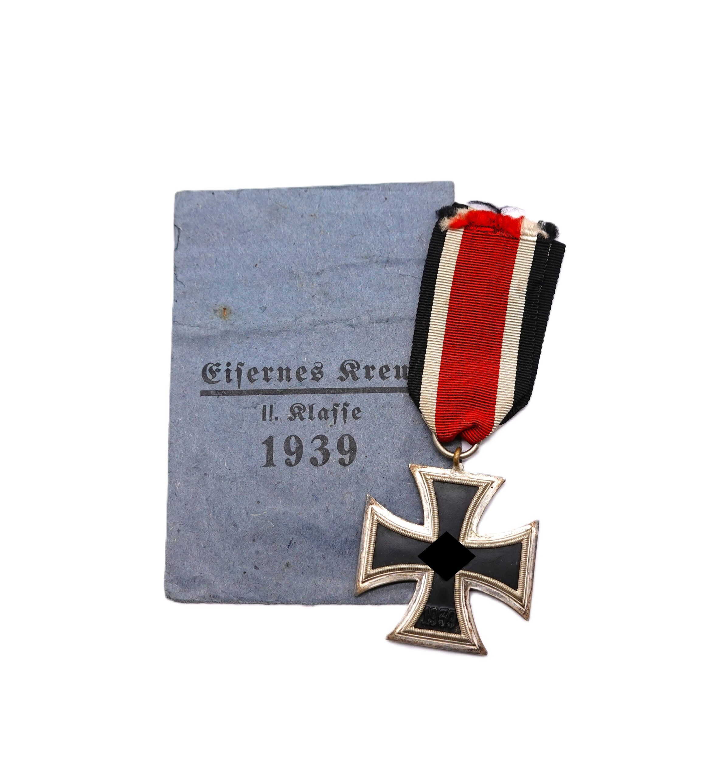 Eisernes Kreuz 2. Klasse 1939 am 13,5 cm langen Bandabschnitt. Ohne Hersteller, wird aber dem Hersteller C. E. Juncker, Berlin zugeschrieben. Nicht magnetischer Kern mit fast kompletter Kernschwärze. Schinkel Variante mit der seltenen Verleihungstüte. Gewicht 18 Gramm. Leider ist auf einer Seite des Rahmens die Nase für die Öse abgebrochen. Wurde wohl auch etwas nachgelötet. Rahmen ist an der Stelle etwas offen. Ansonsten ein schönes Set.