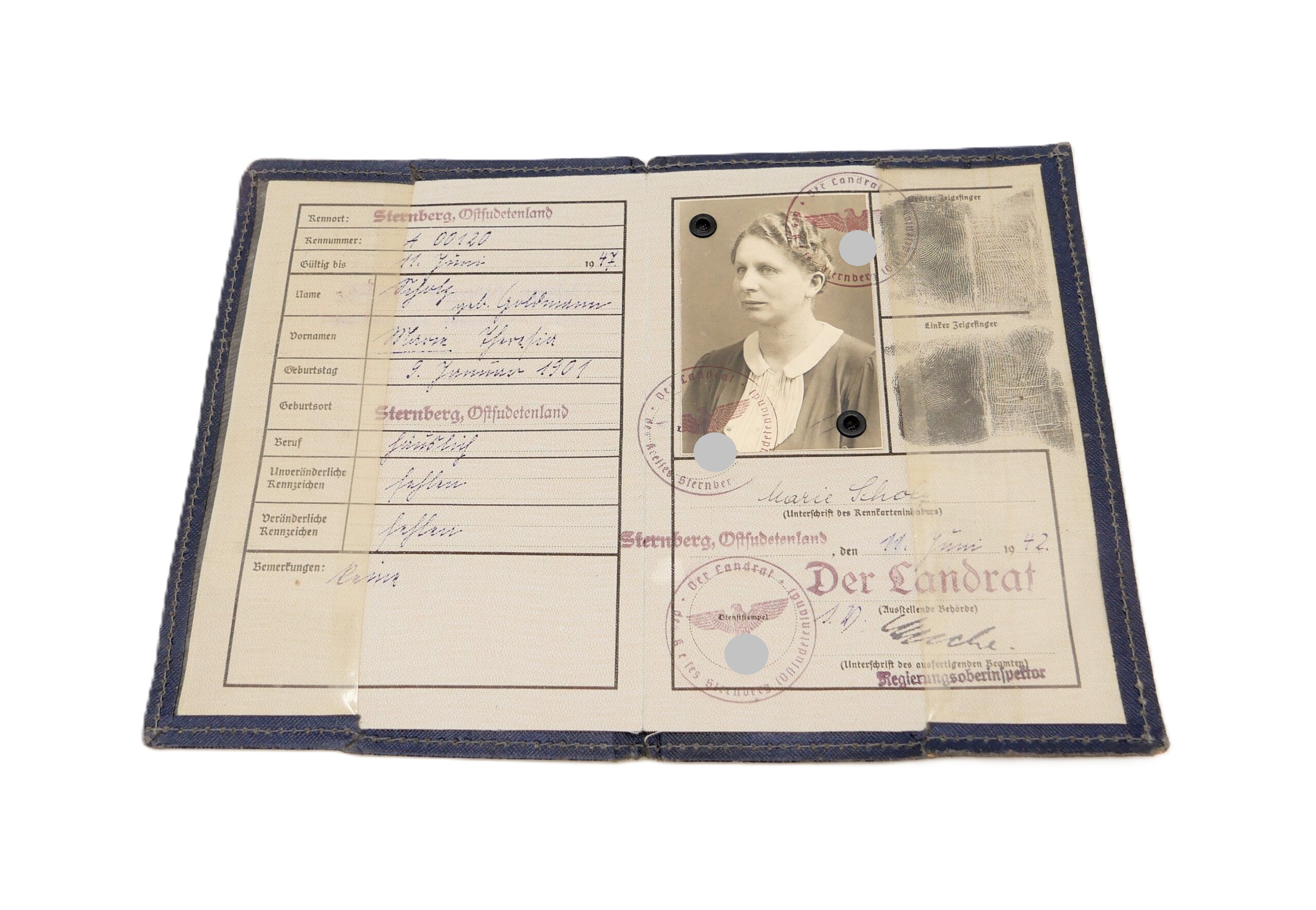 Kennkarte einer Frau aus Sternberg. Mit dem seltenen Schutzumschlag. Getragener Zustand.