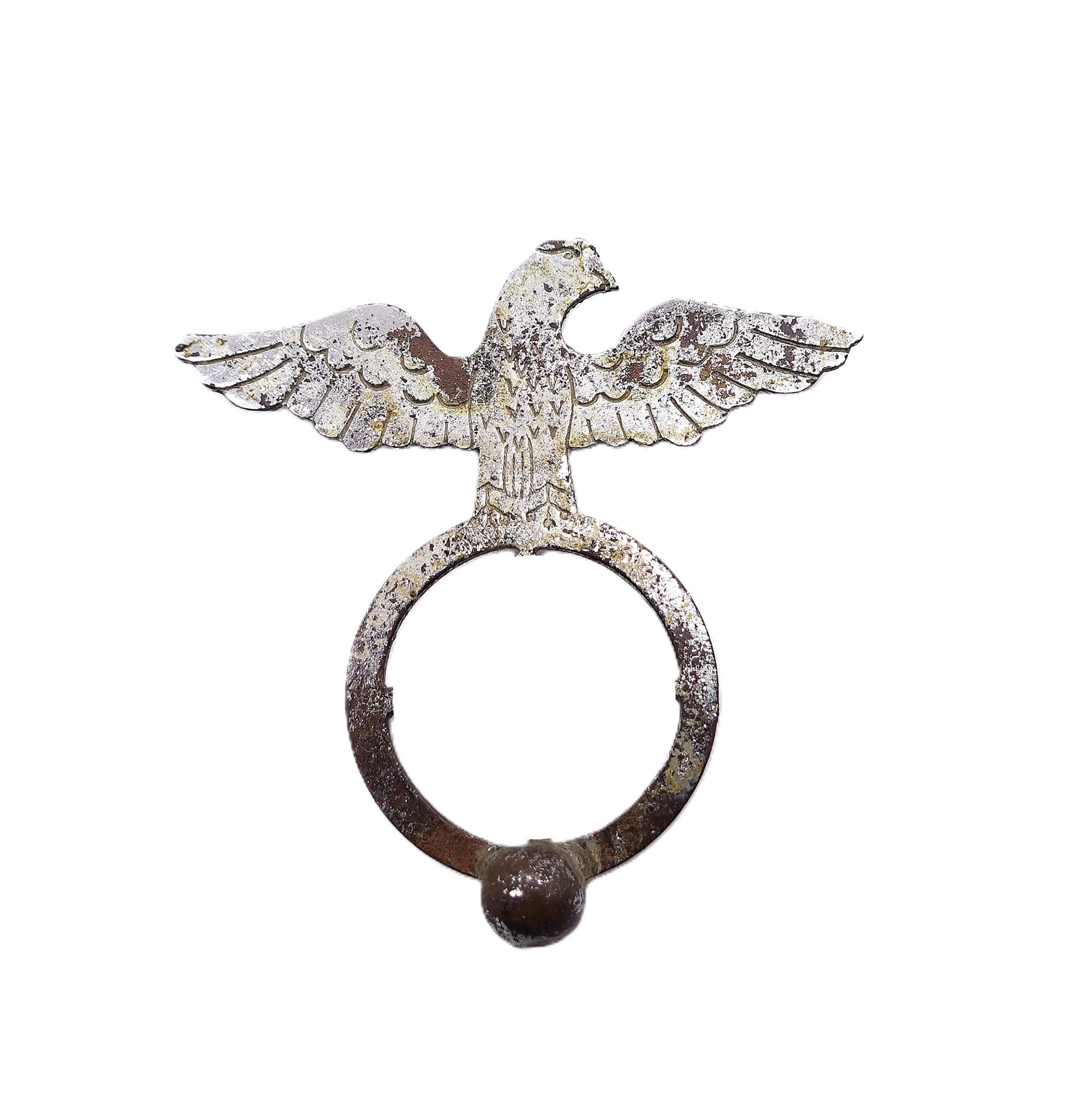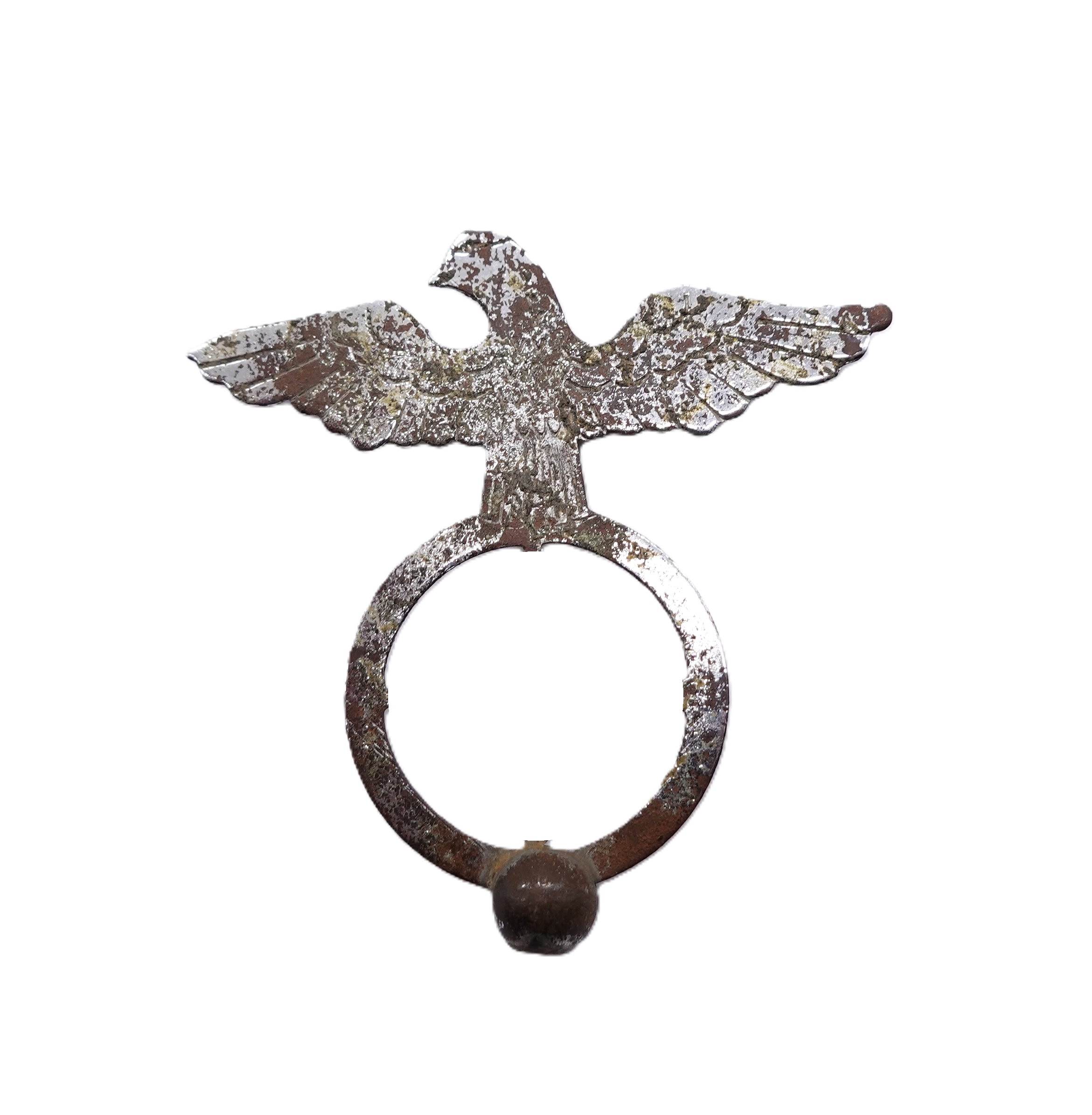 Kleiner Adler auf Kreis mit durchbrochenen HK. Wahrscheinlich mal für einen Wimpel oder Standarte angefertigt. Höhe 71 mm, Spannweite 67 mm. Schöner Bodenfund.
