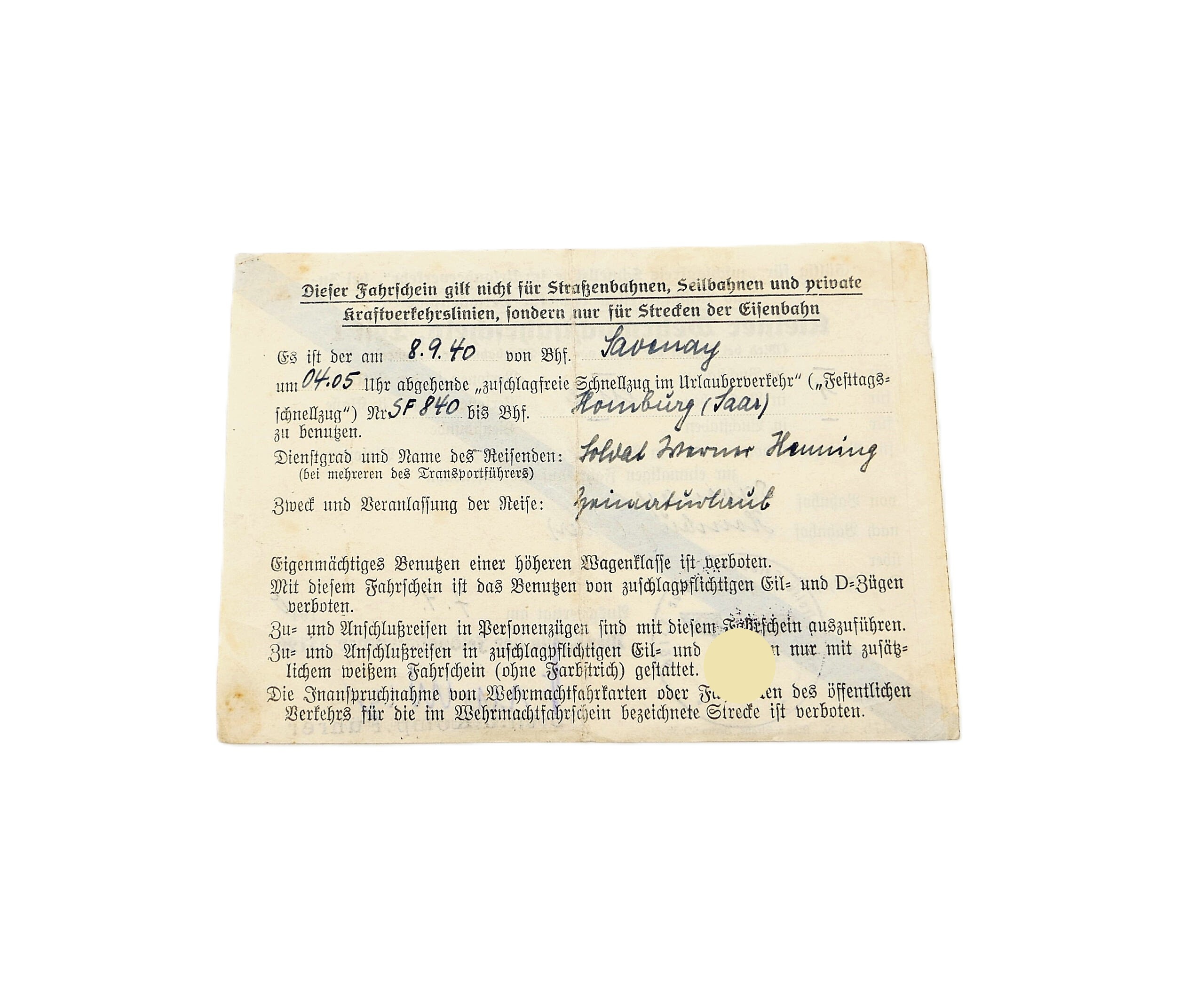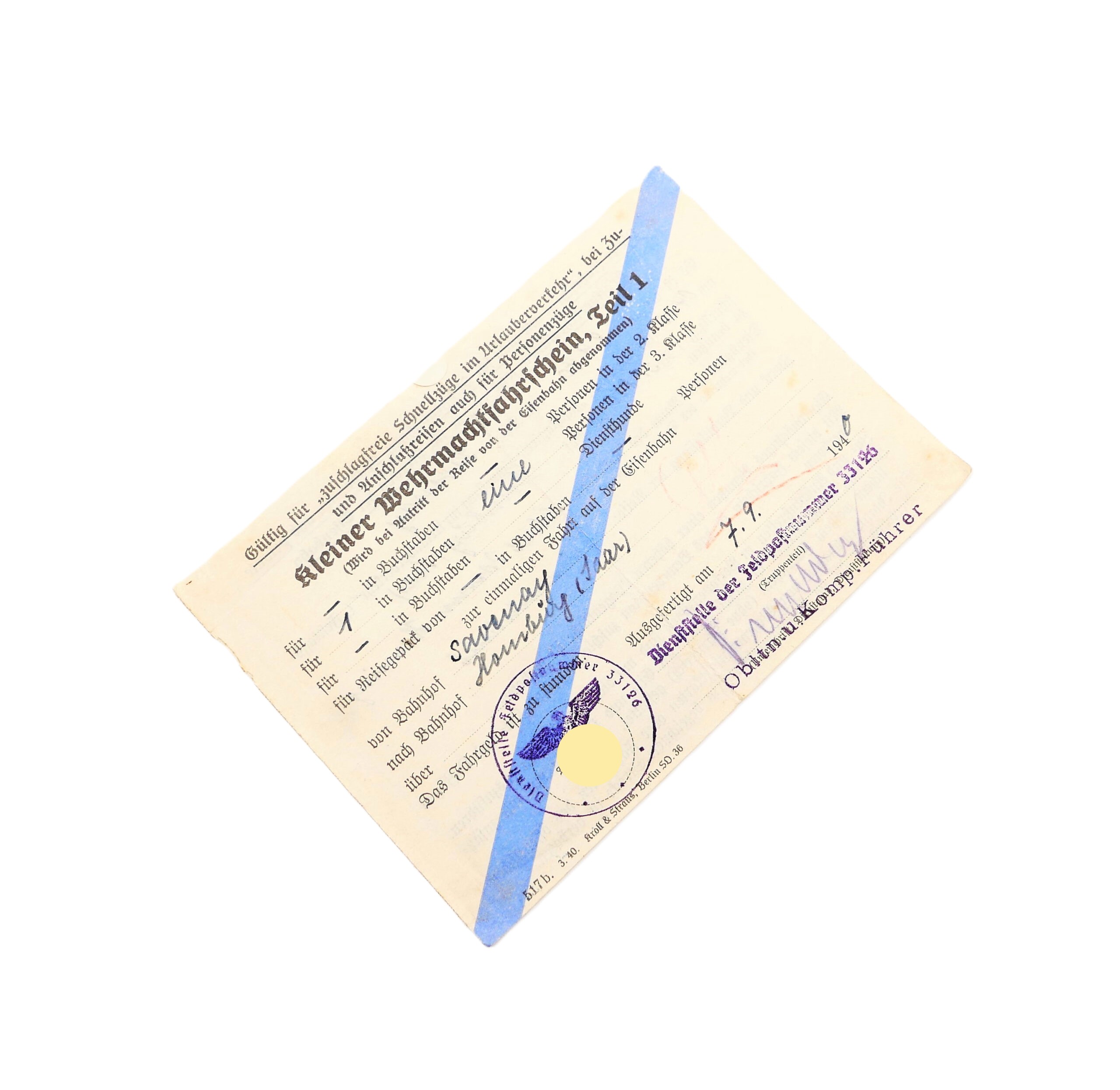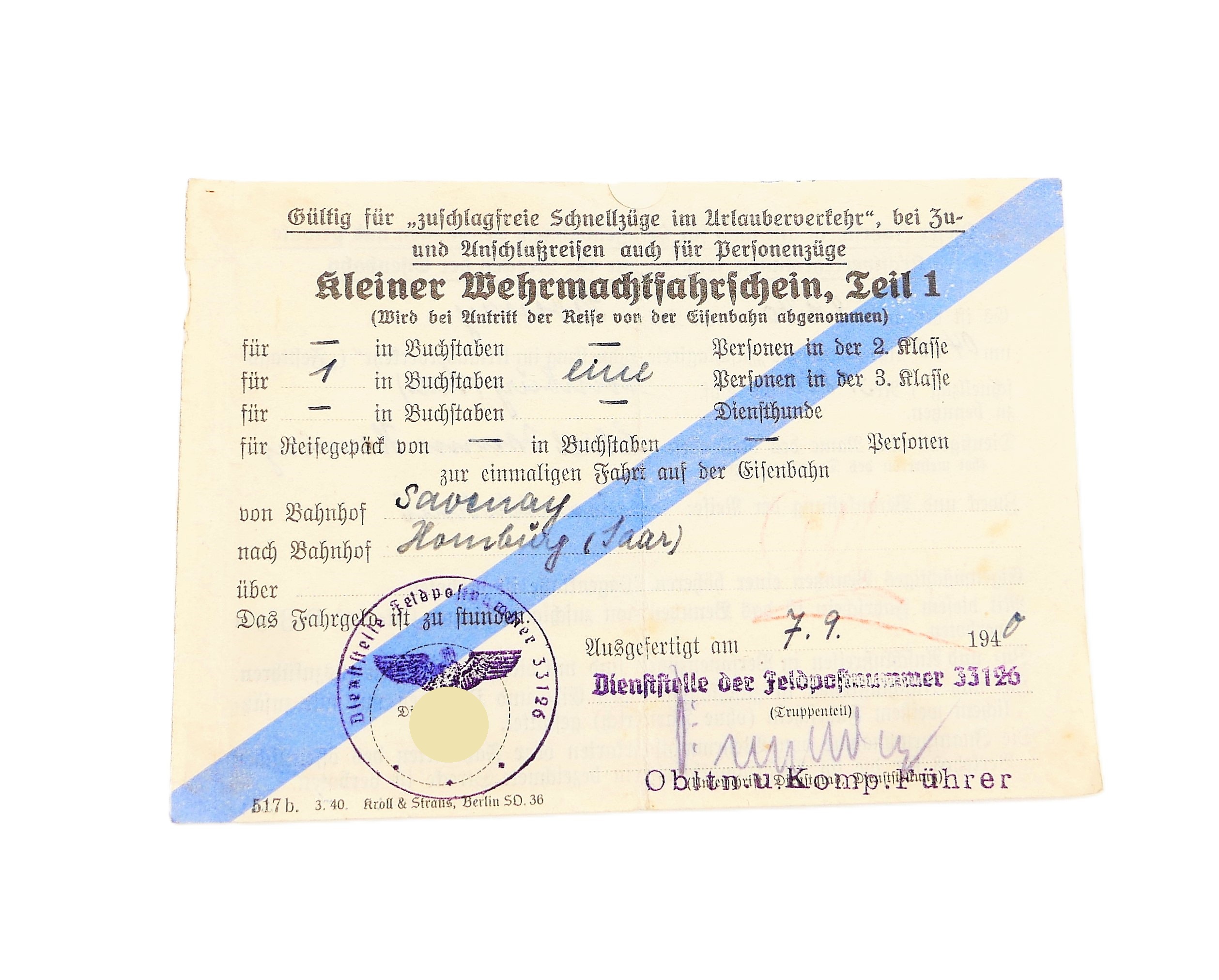 Kleiner Wehrmachtfahrschein, Teil 1. Feldpostnummer 33126.