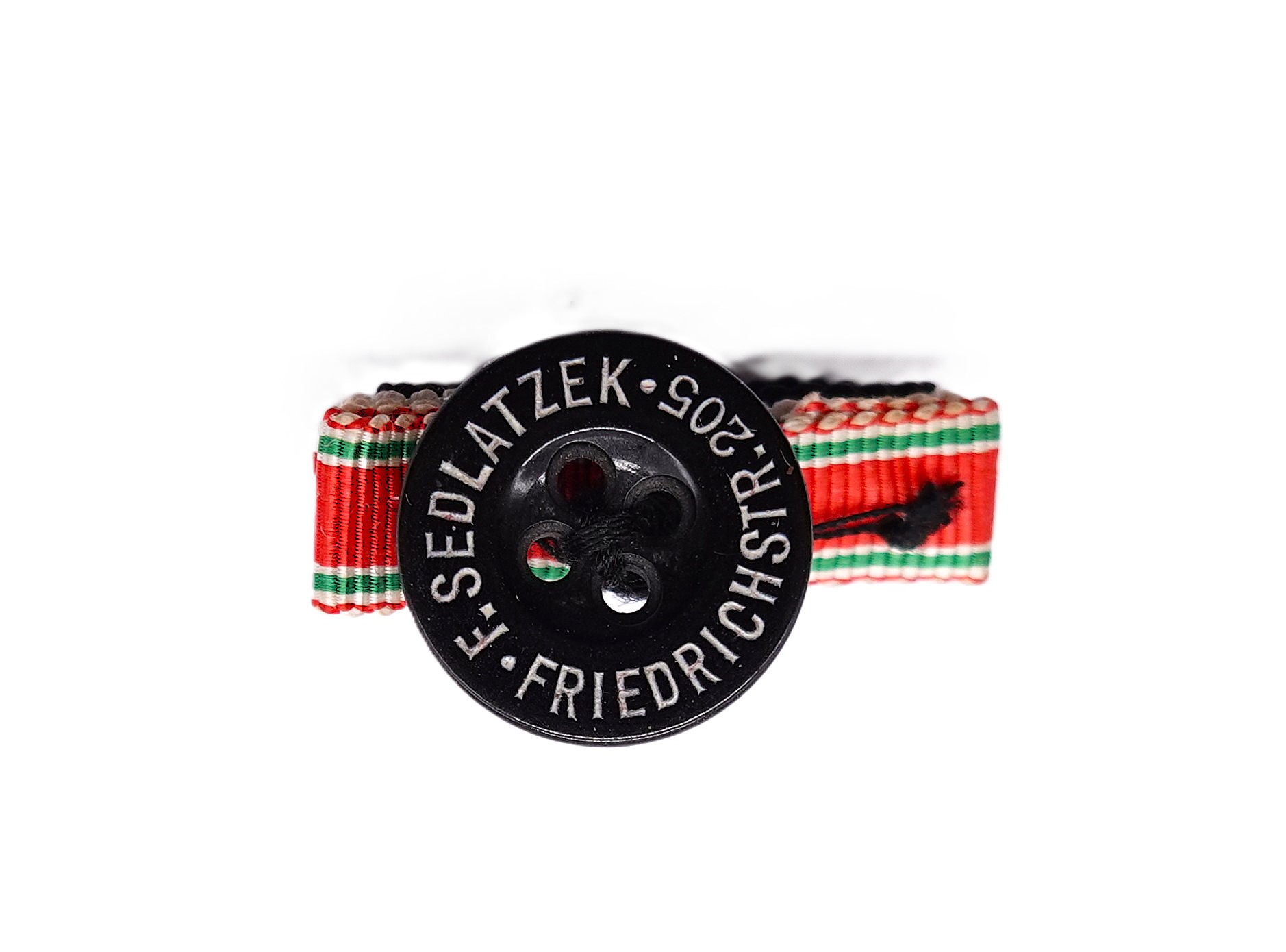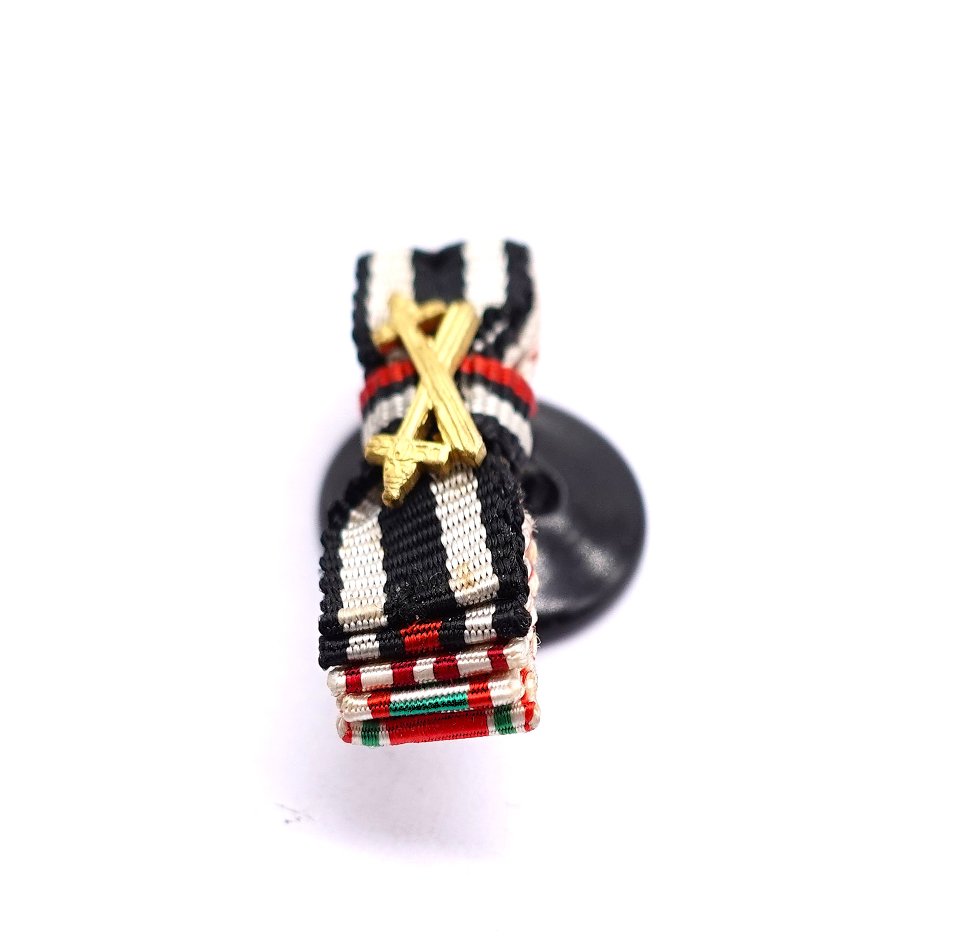 Knopflochschleife mit 5 Bändern. Rückseitig eingeprägt der Ordenhändler F. Sedlatzek, Friedrichstrasse 205, Berlin. Mit Schwerter Auflage. Getragener Zustand.