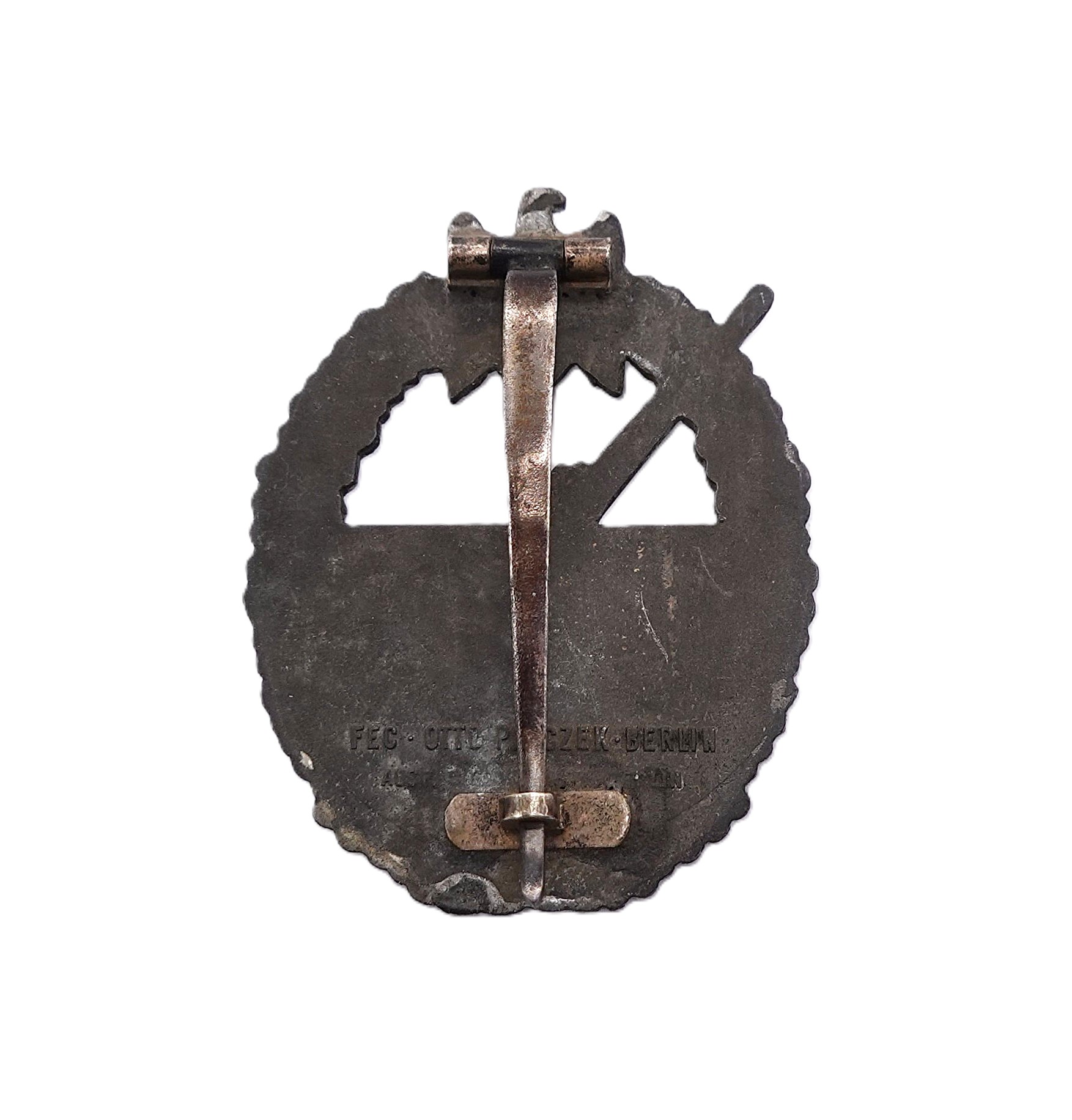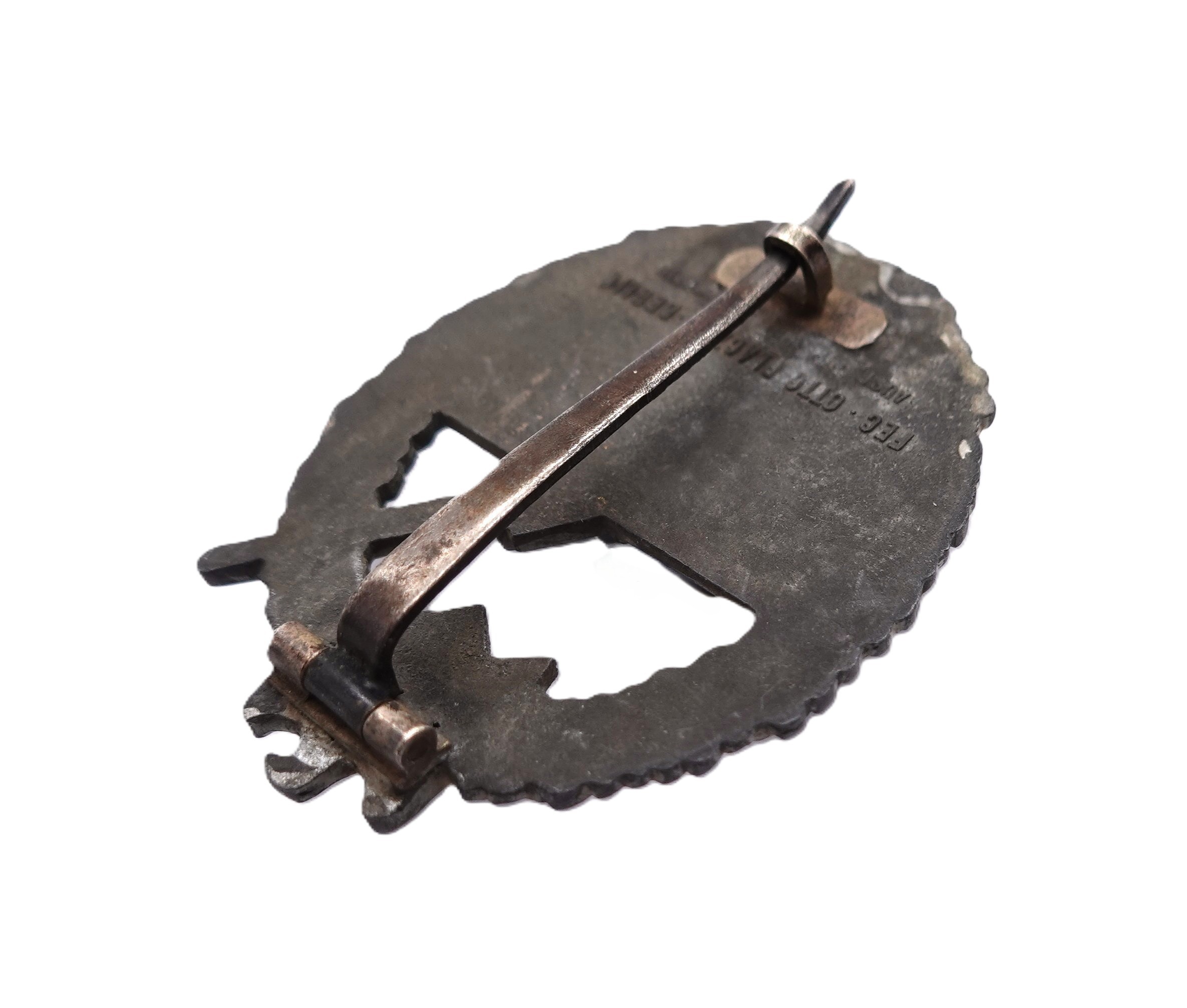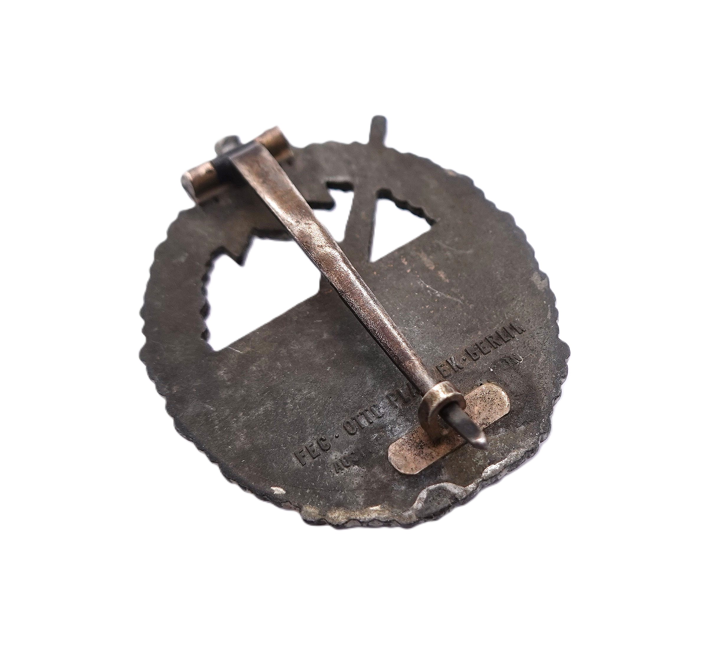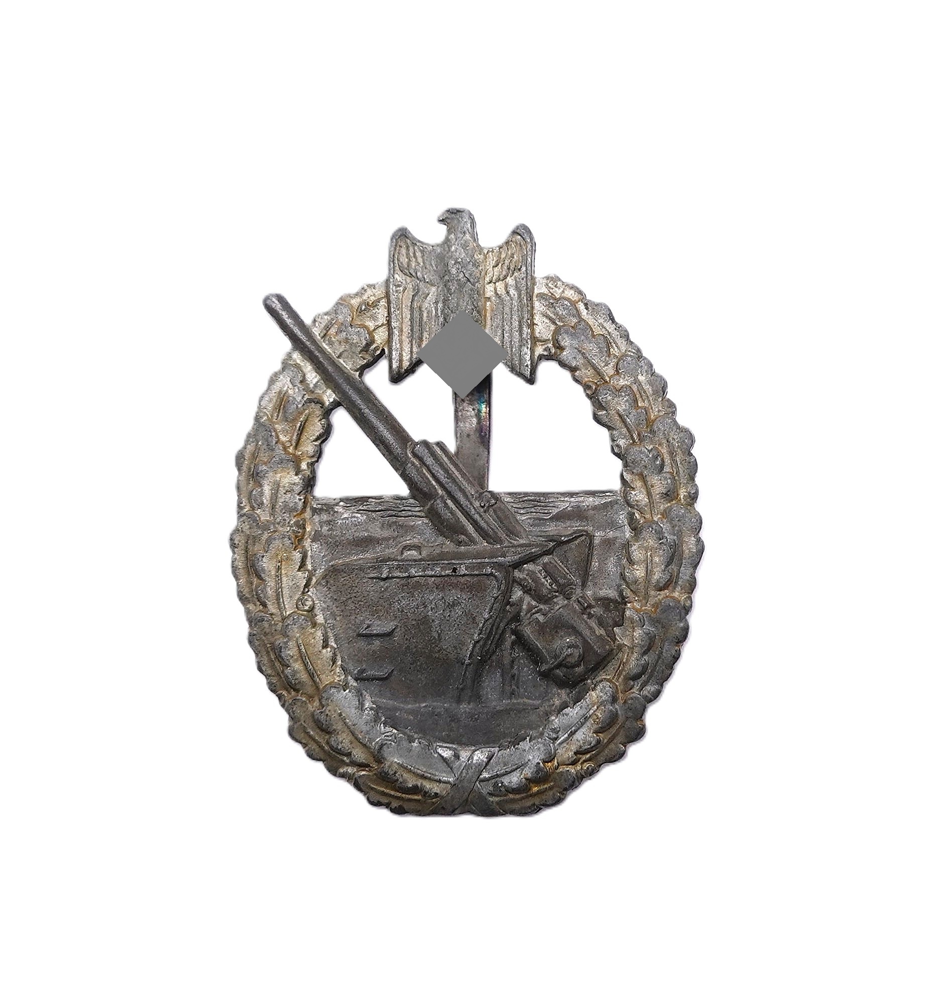 Kriegsabzeichen der Marineartillerie – OTTO PLACZEK, BERLIN – AUSF. C. E. JUNCKER, BERLIN – Variante 3 mit Deutscher Kreuz Nadel. Siehe dazu Sascha Weber & Gerhard R. Skora, die Kriegsabzeichen der Kriegsmarine, Seite 610 – 611. Aus Zink. Schöner, getragener Zustand mit Restvergoldung.