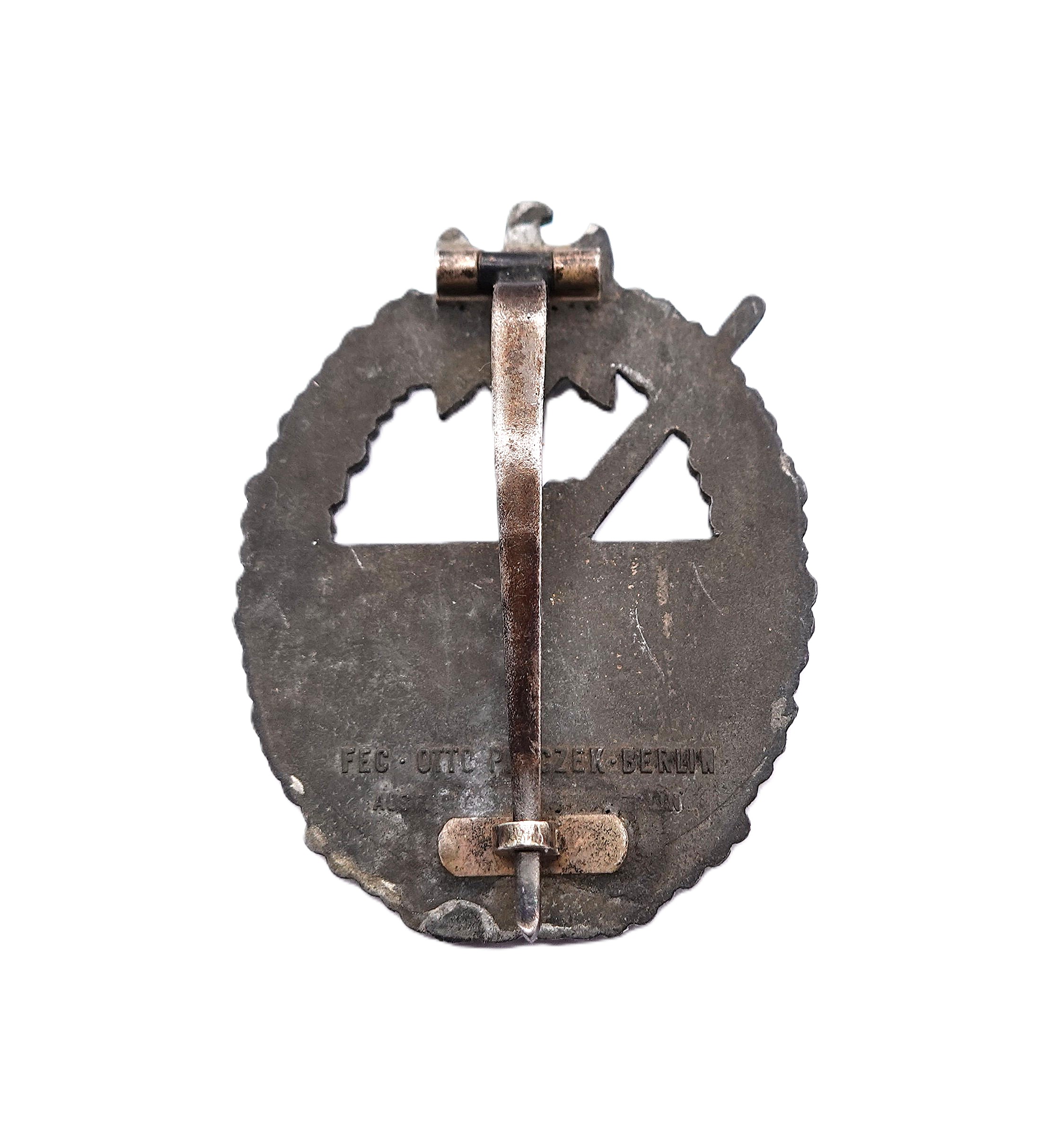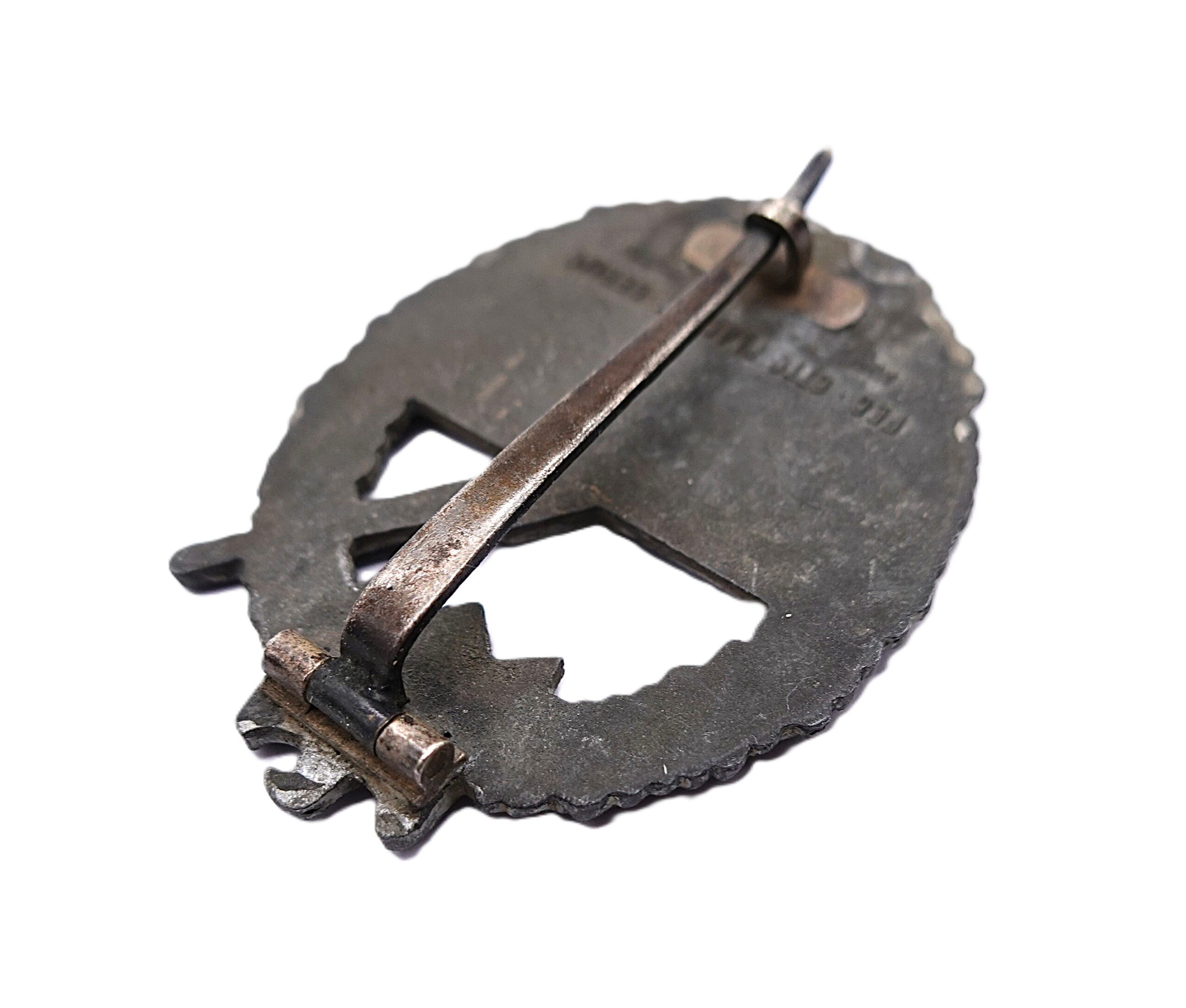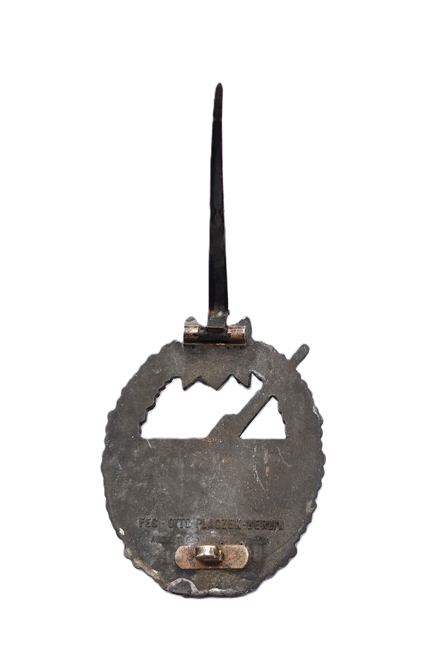Kriegsabzeichen der Marineartillerie – OTTO PLACZEK, BERLIN – AUSF. C. E. JUNCKER, BERLIN – Variante 3 mit Deutscher Kreuz Nadel. Siehe dazu Sascha Weber & Gerhard R. Skora, die Kriegsabzeichen der Kriegsmarine, Seite 610 – 611. Aus Zink. Schöner, getragener Zustand mit Restvergoldung.