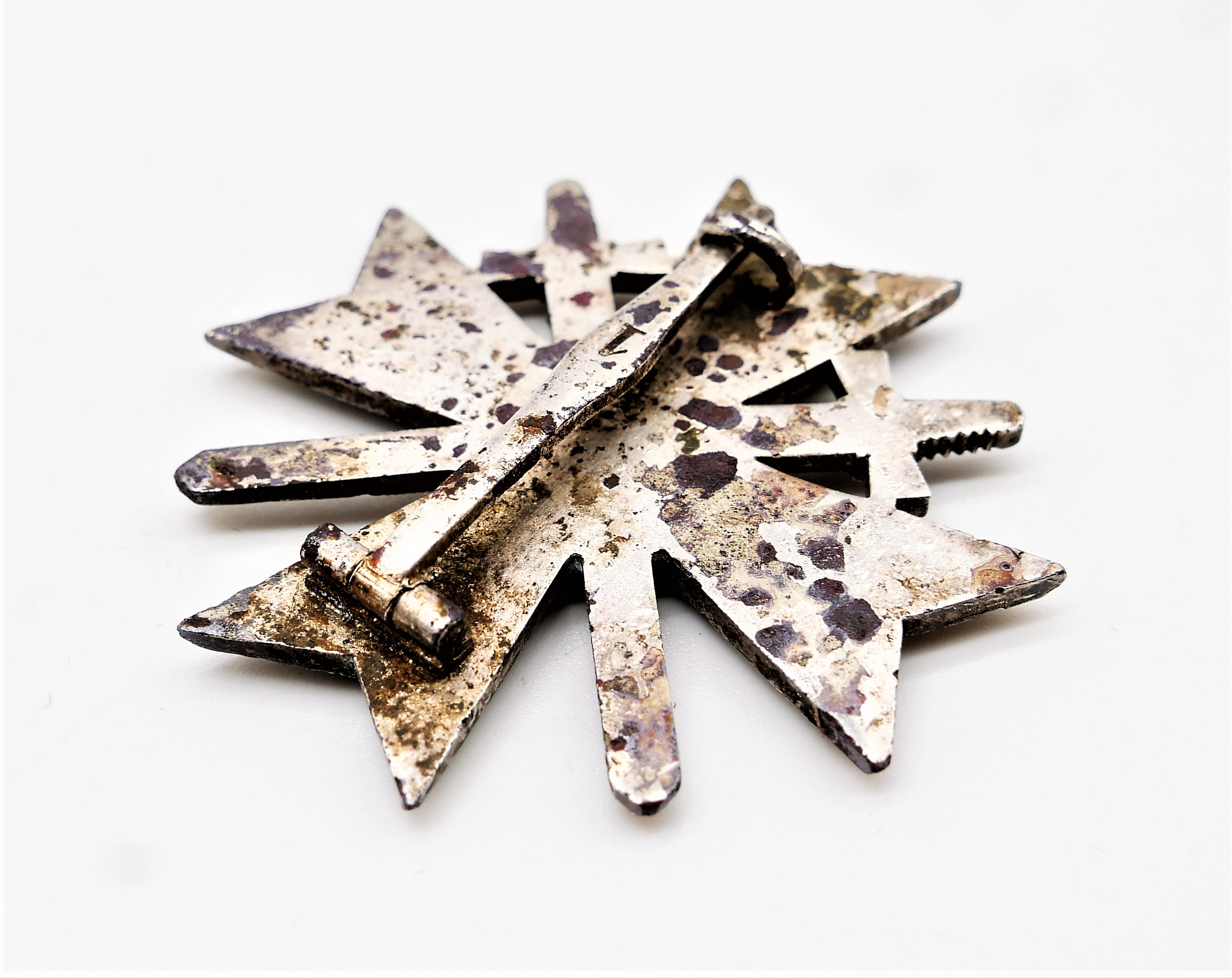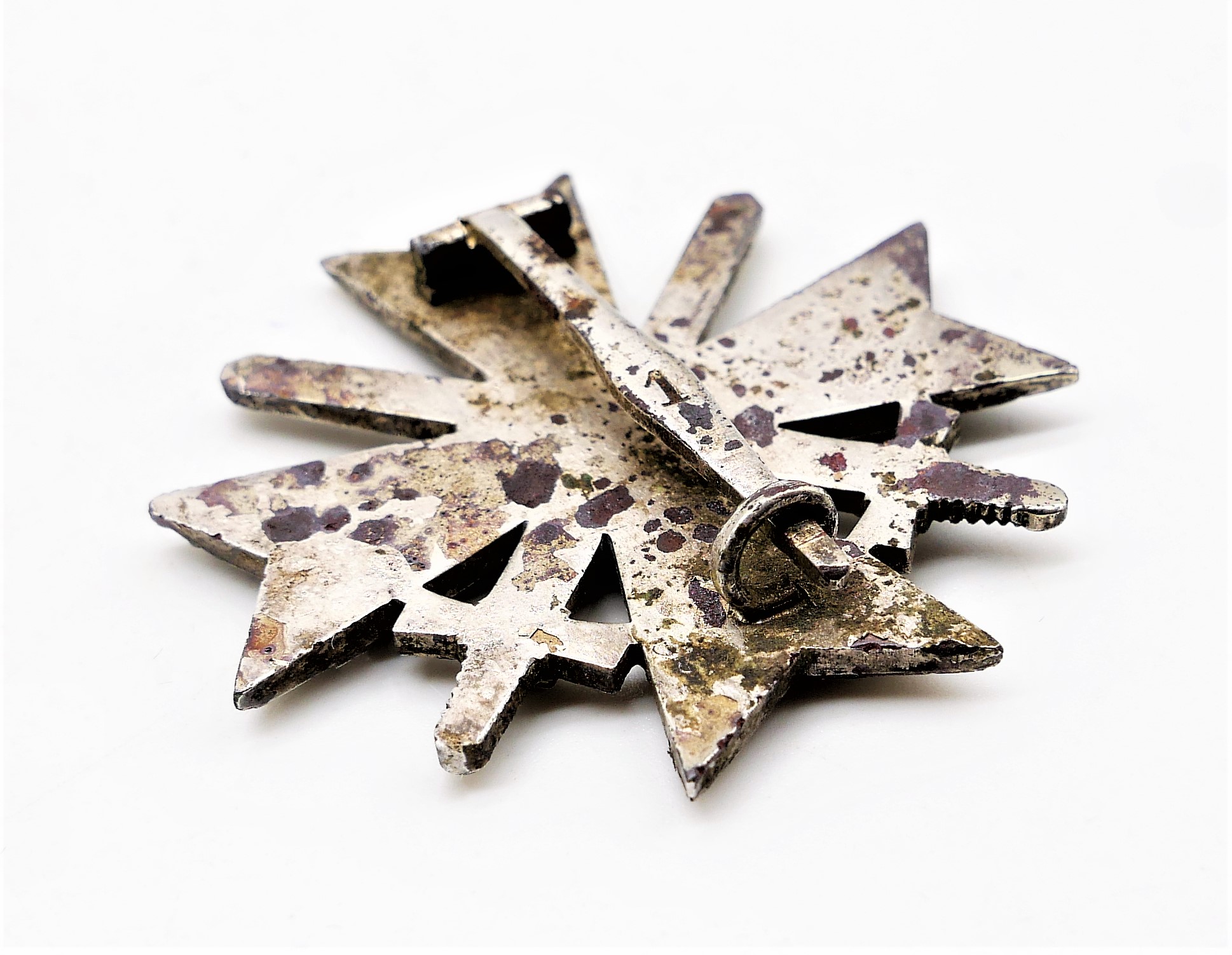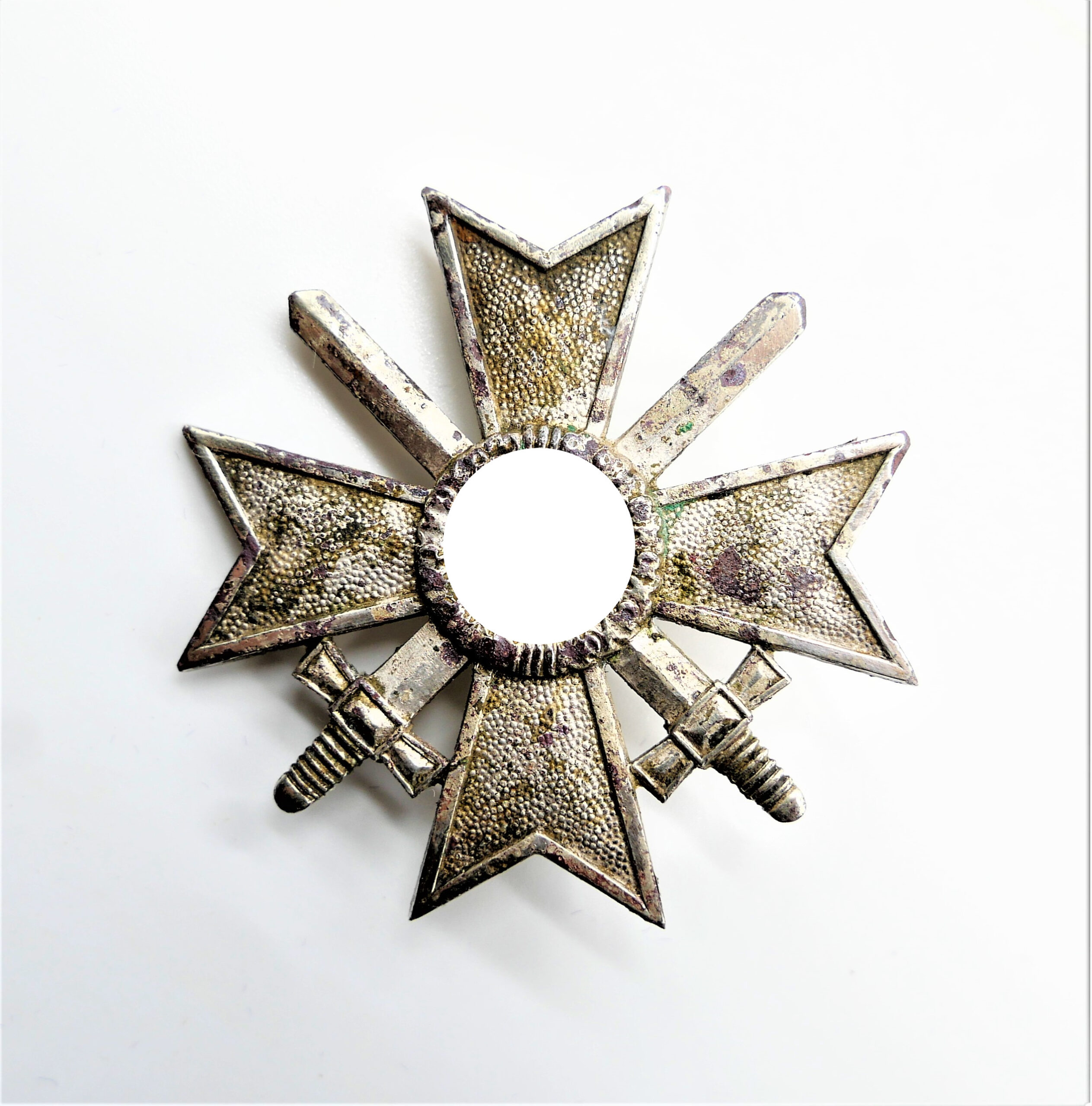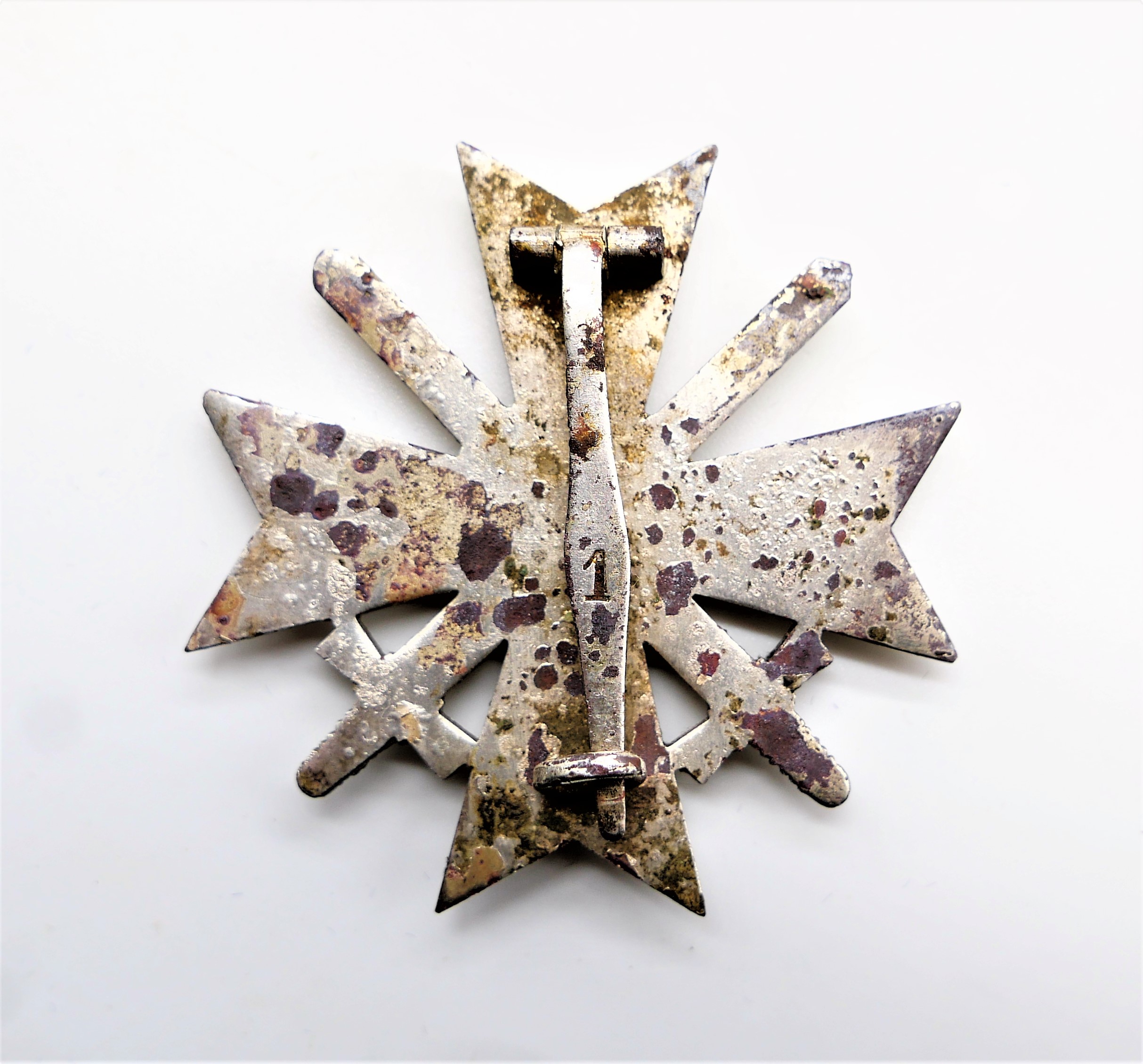 Kriegsverdienstkreuz 1. Klasse mit Schwerter. Hersteller 1 (Deschler & Sohn, München). Punze auf der Nadel. Getragenes Buntmetallstück. Früher Bodenfund. Nadel ist fest.