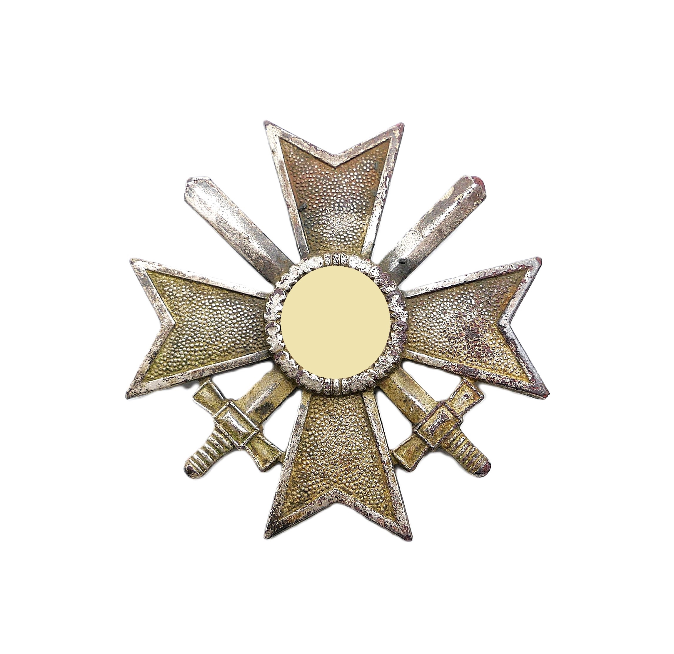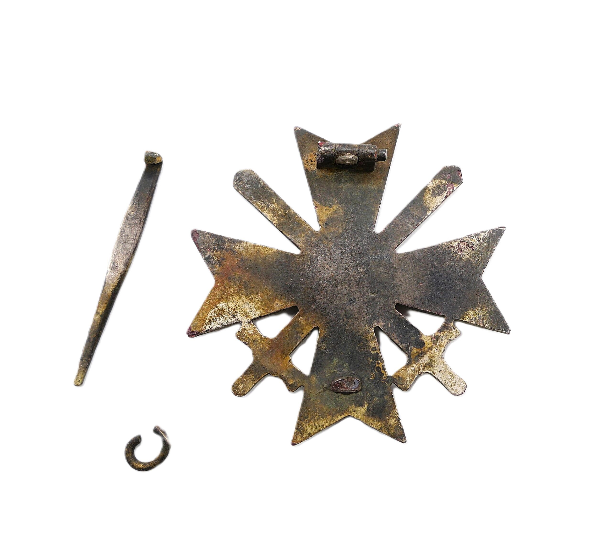 Kriegsverdienstkreuz 1. Klasse mit Schwerter. Hersteller 65 (Klein & Quenzer, Idar – Oberstein). Punze auf der Nadel. Nadel und der Haken sind ab, aber dabei. Bodenfund
