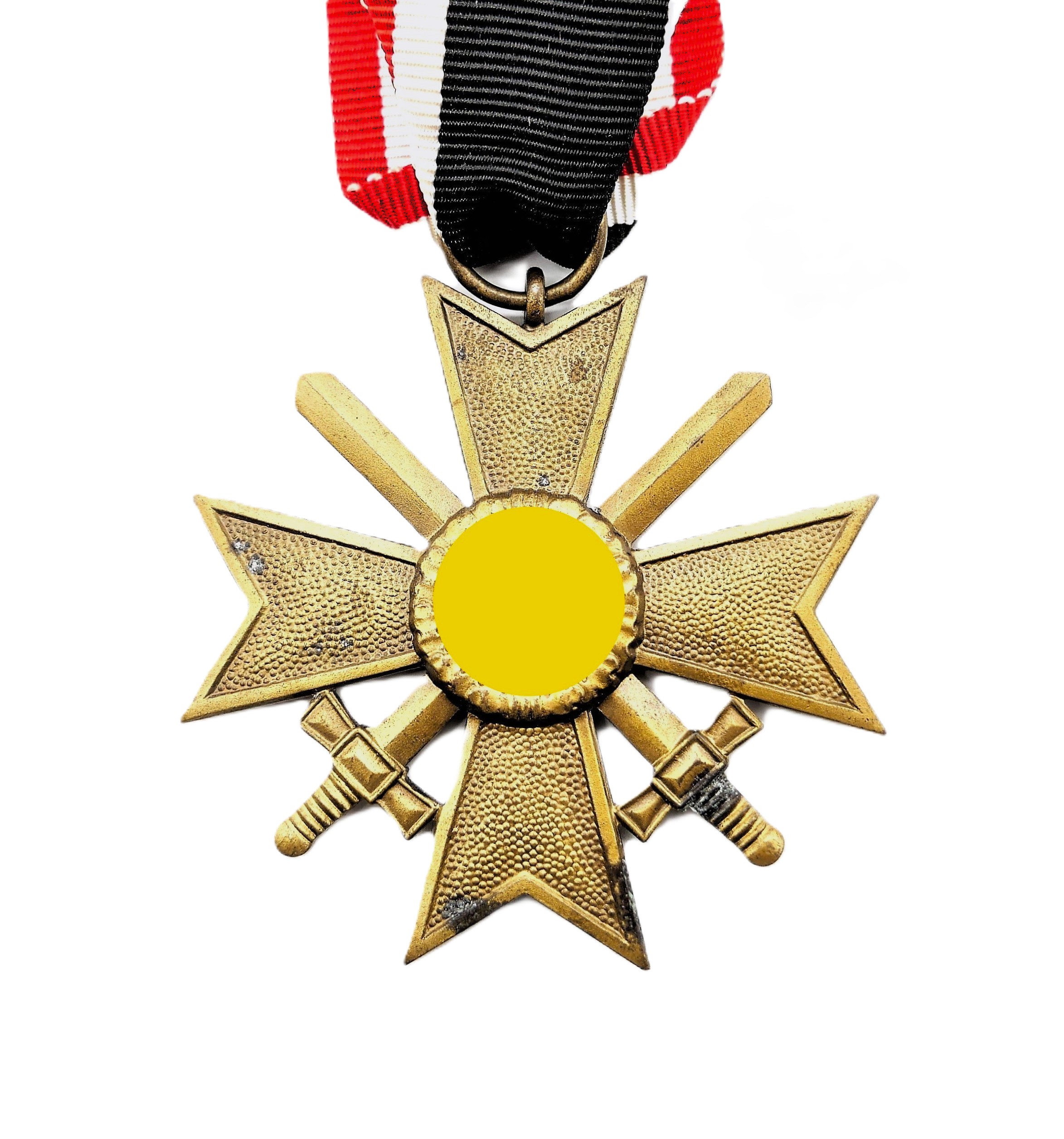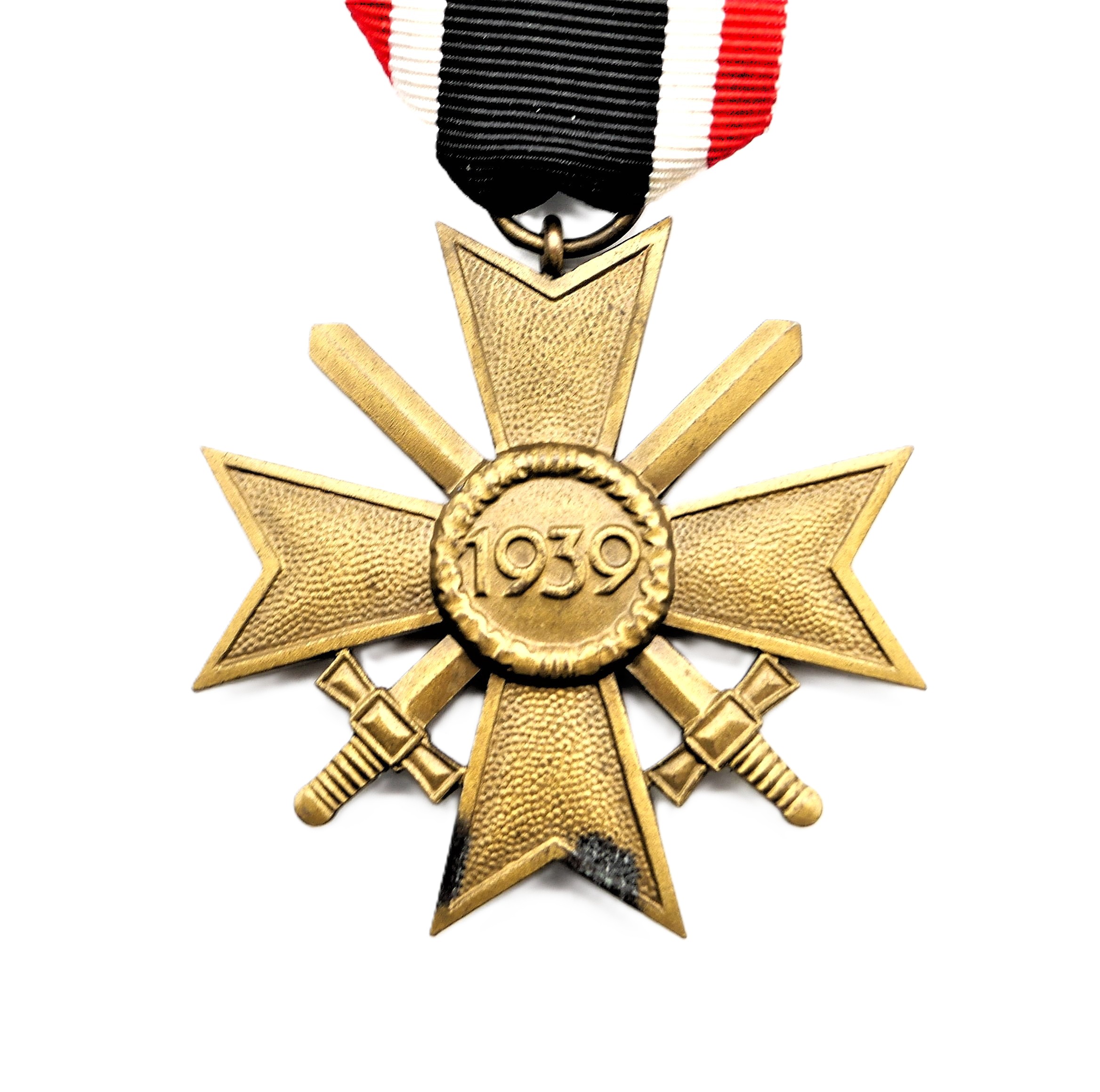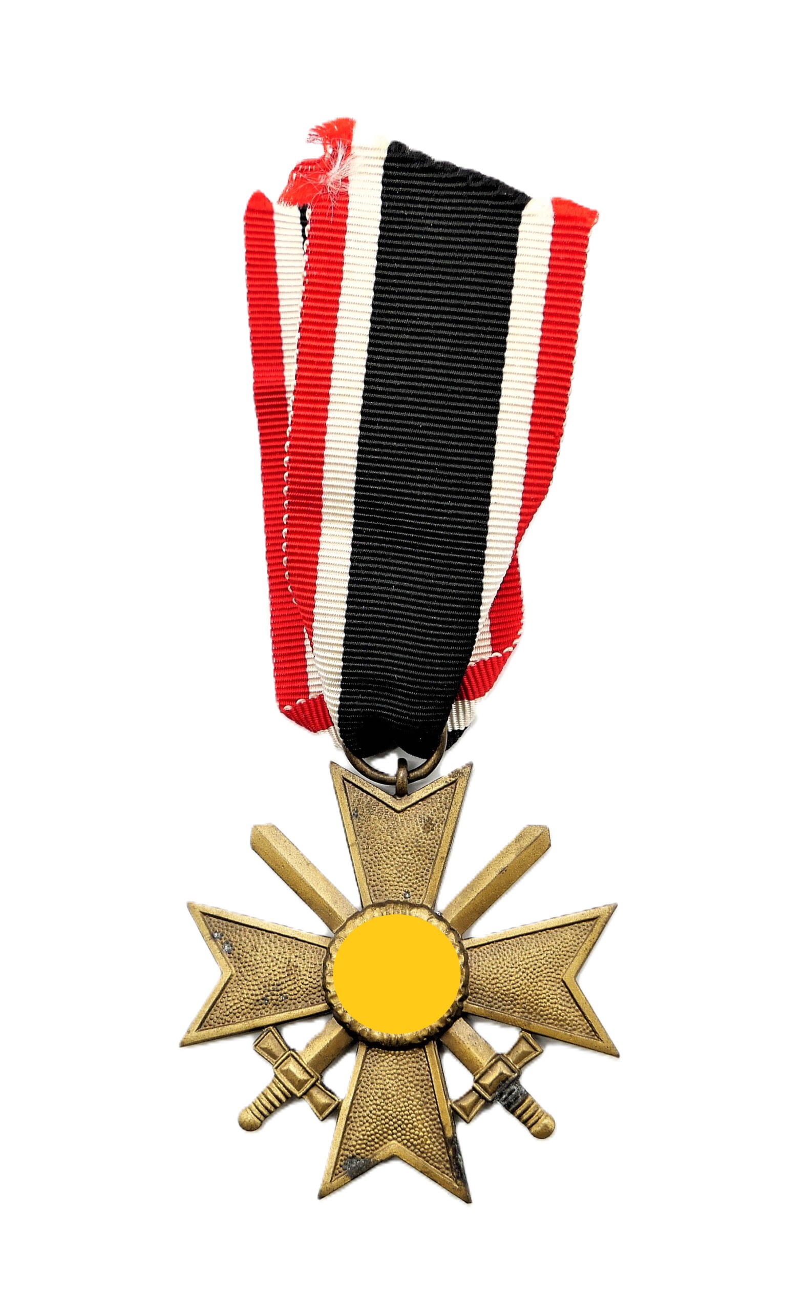 Kriegsverdienstkreuz 2. Klasse mit Schwerter am 13,5 cm langen Bandabschnitt. Buntmetallstück. Hersteller 6 (Fritz Zimmermann, Stuttgart). Tolle Patina.