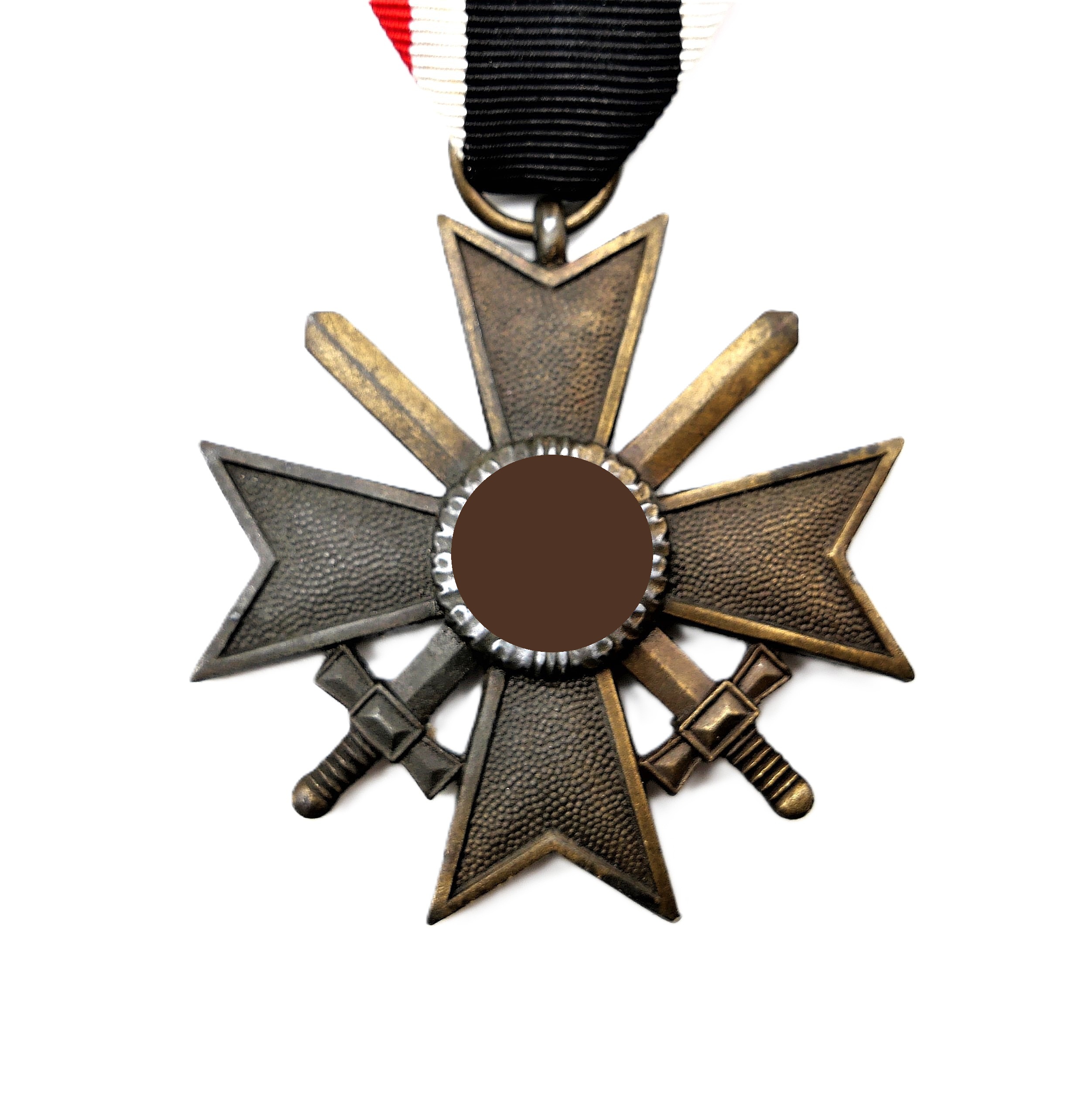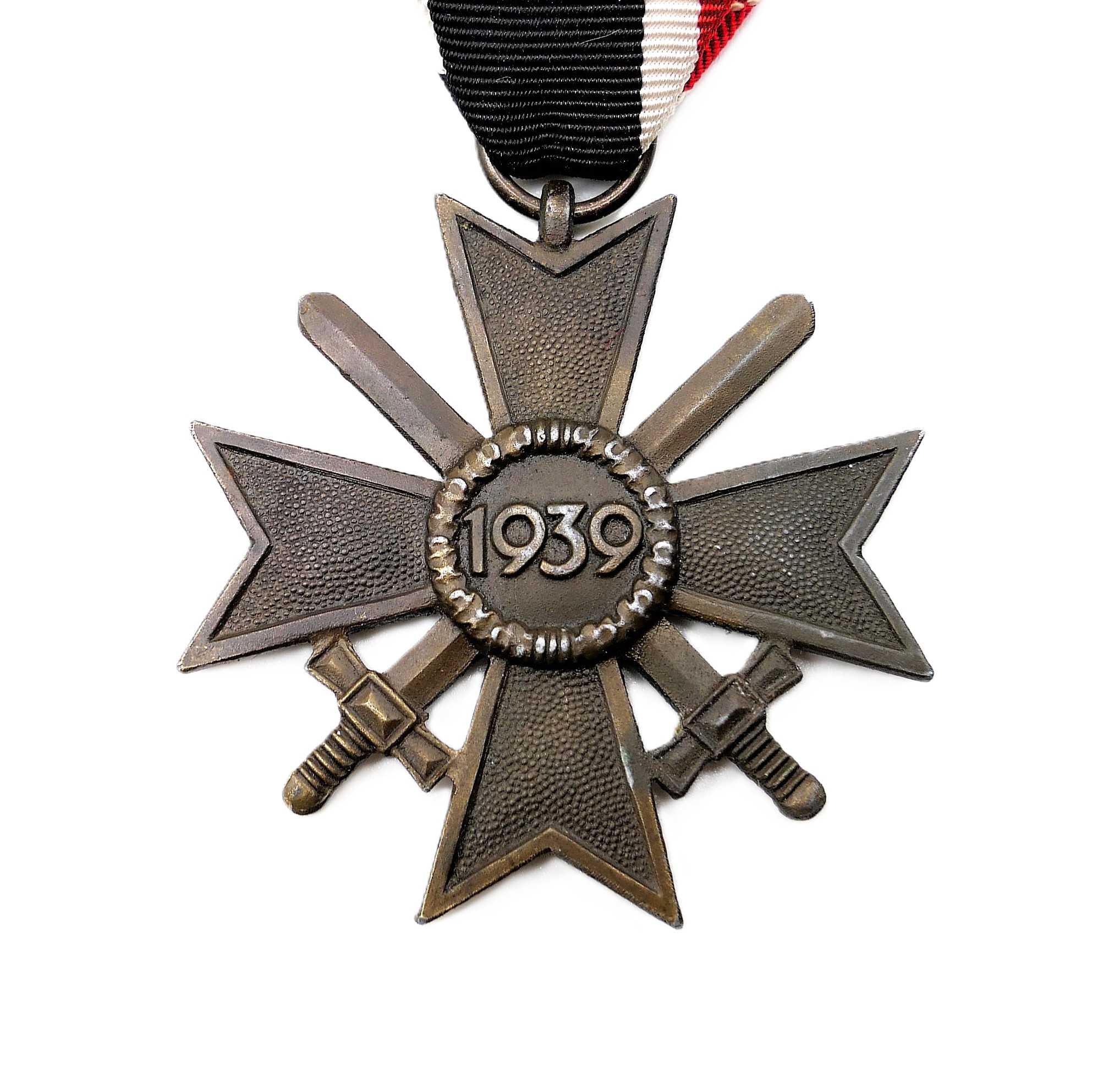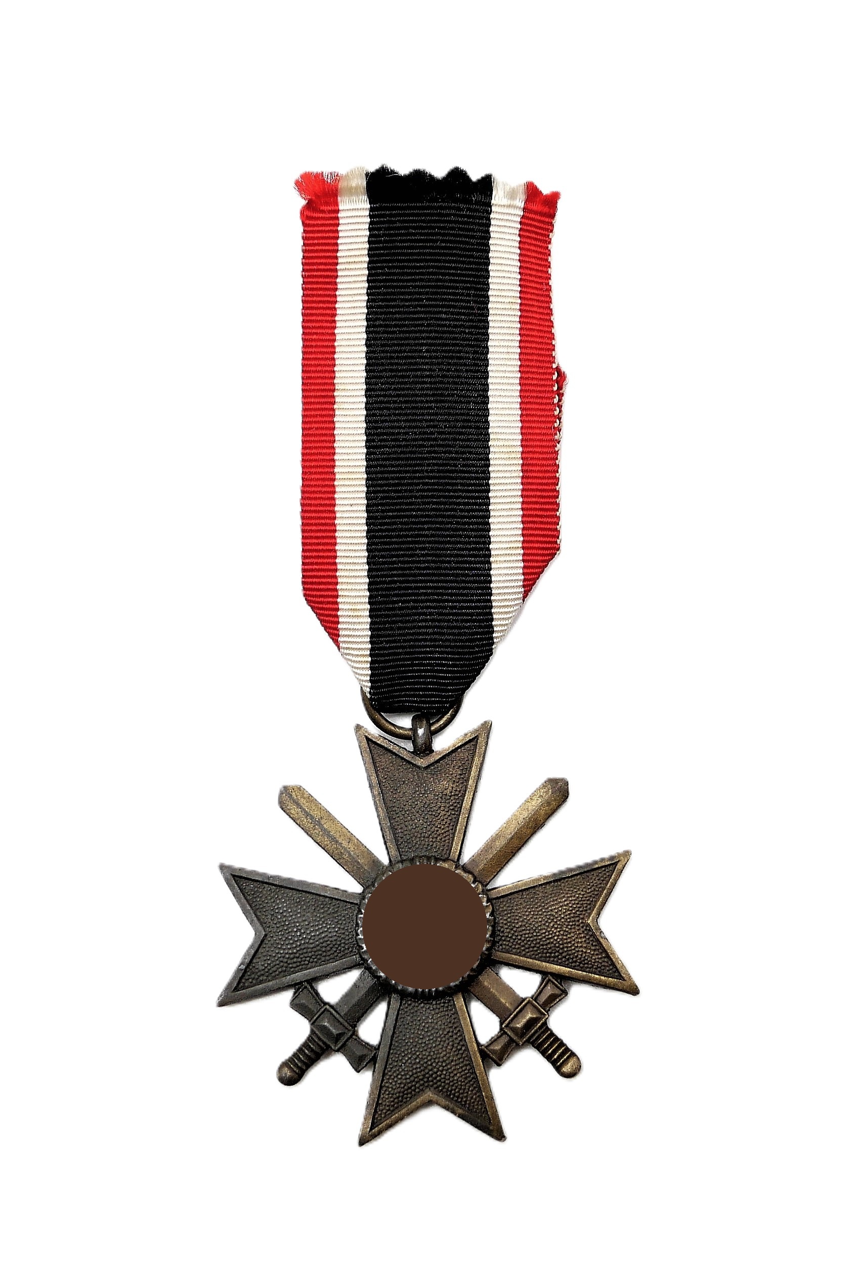Kriegsverdienstkreuz 2. Klasse mit Schwerter am 10 cm langen Bandabschnitt. An einen Ende schräg abgeschnitten. Ohne Hersteller. Zinkstück mit vergangener Bronzierung.