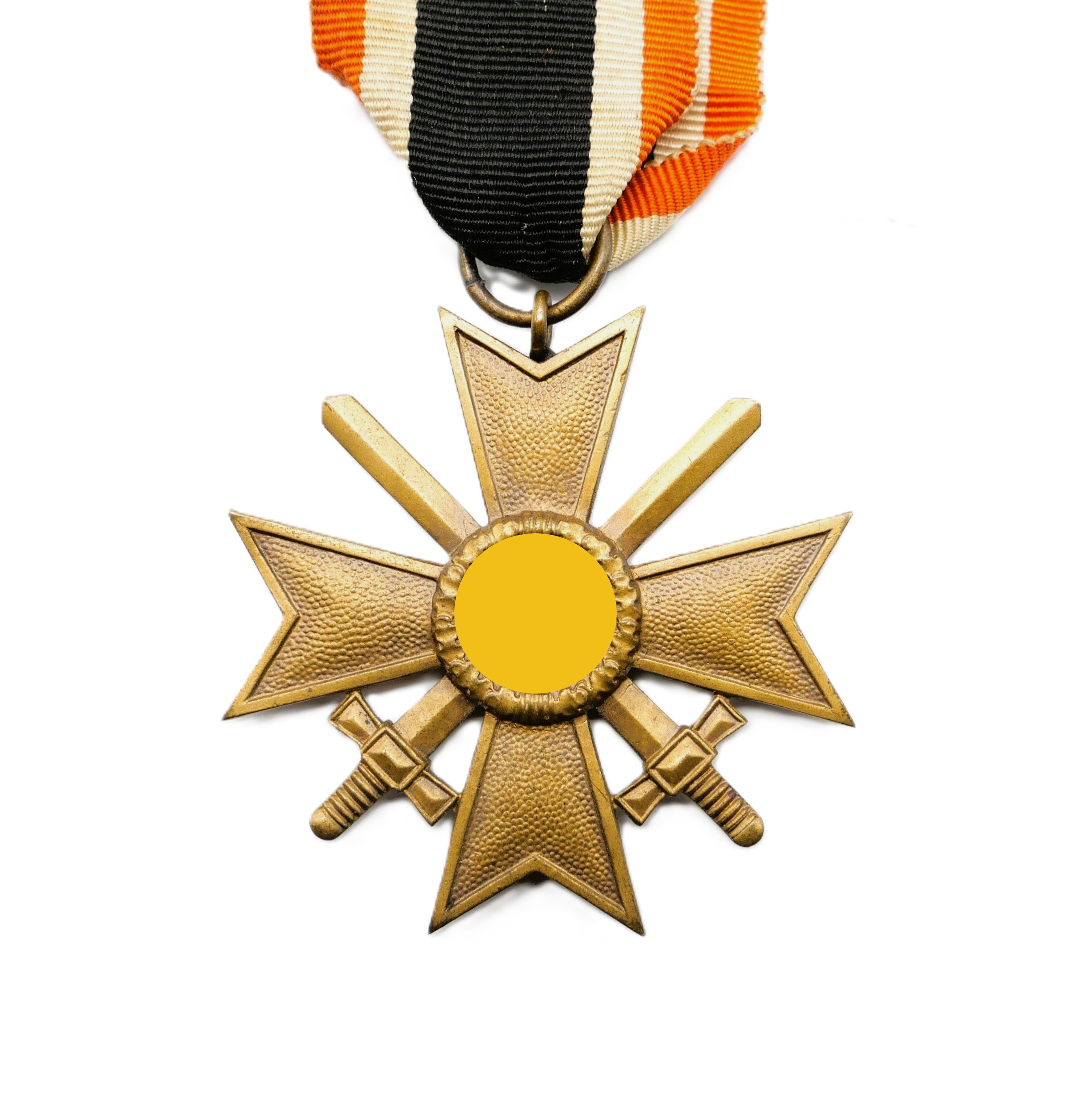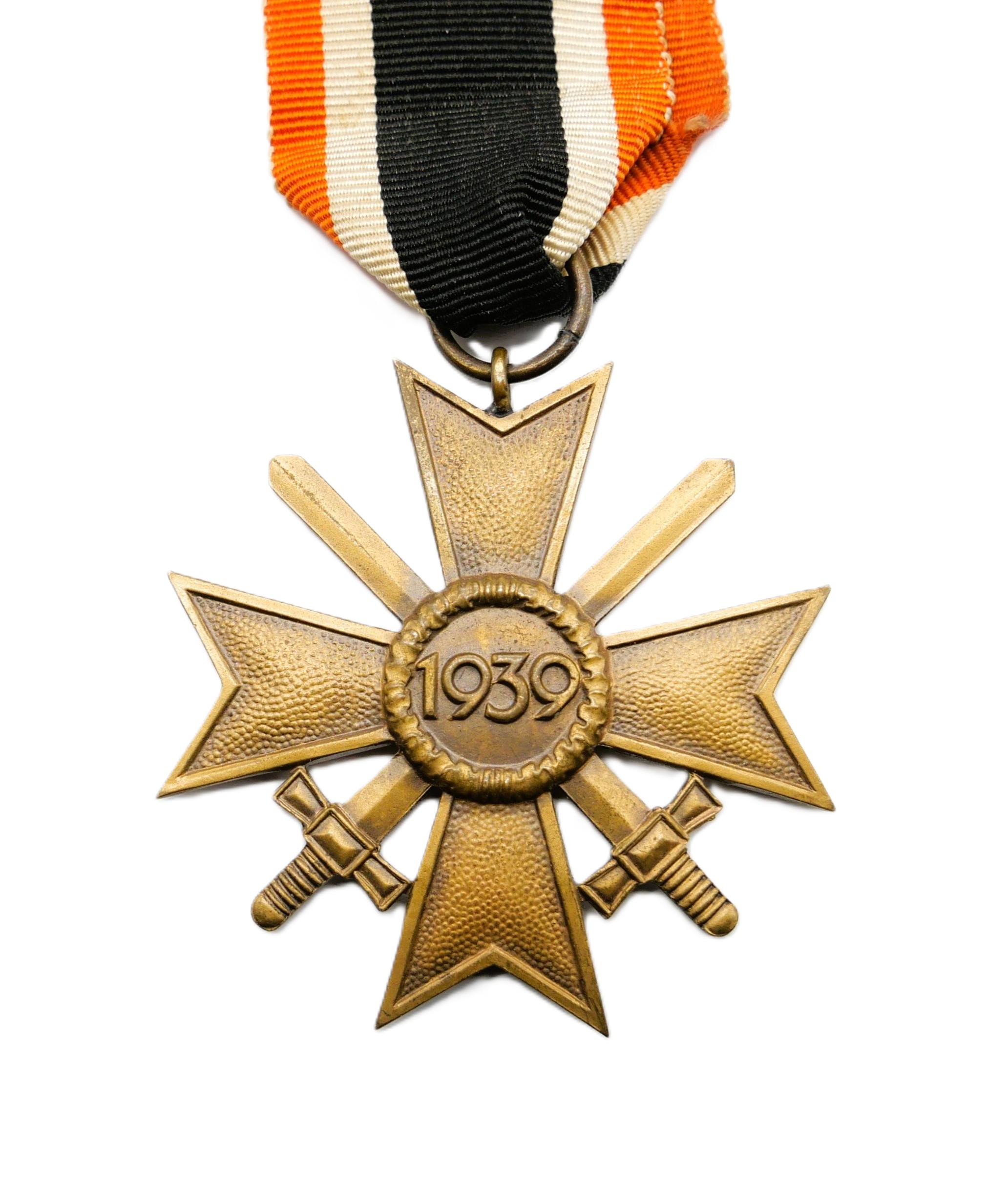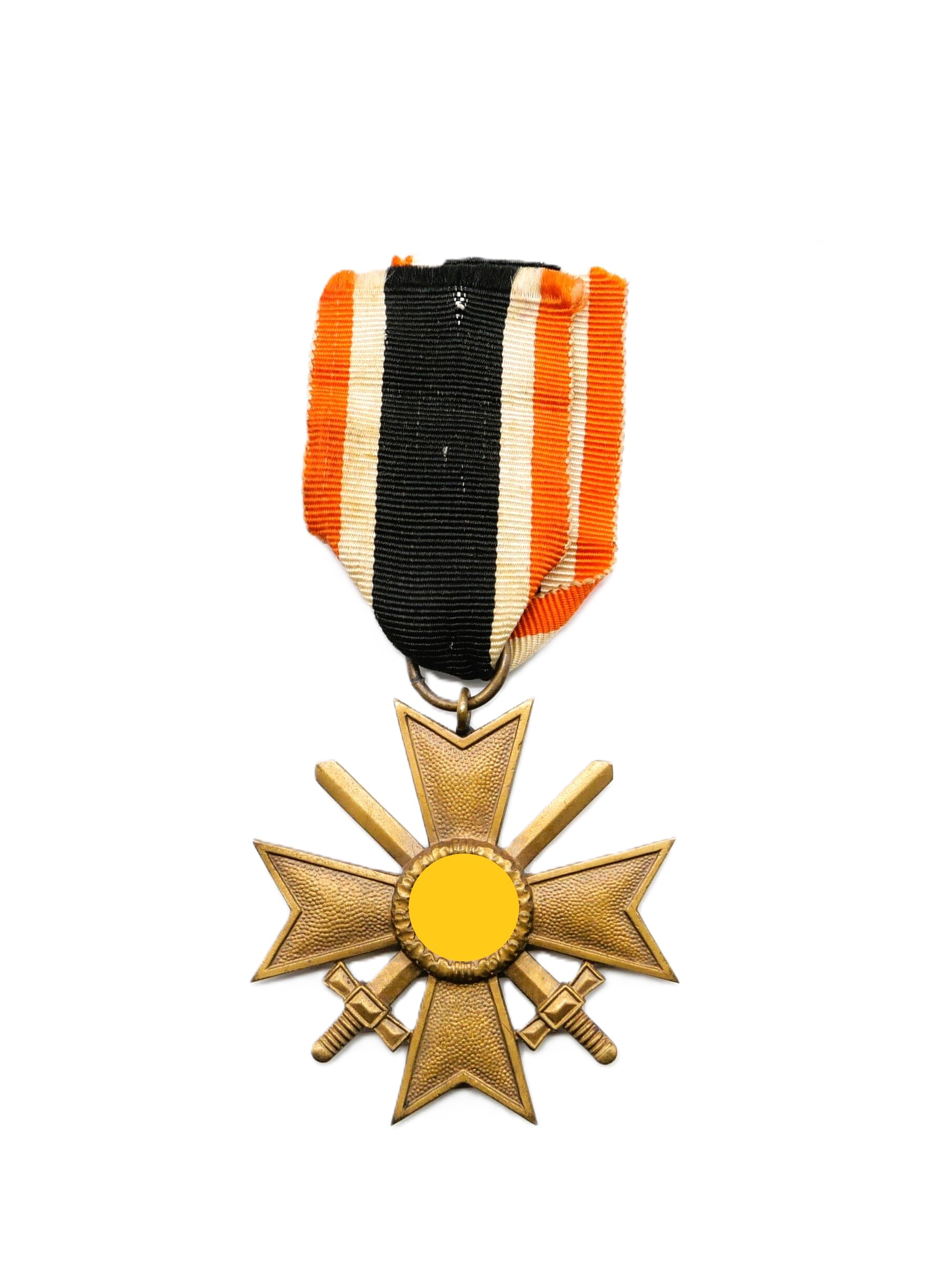 Kriegsverdienstkreuz 2. Klasse mit Schwerter am 10 cm langen, orangen Bandabschnitt. Buntmetallstück. Ohne Hersteller.