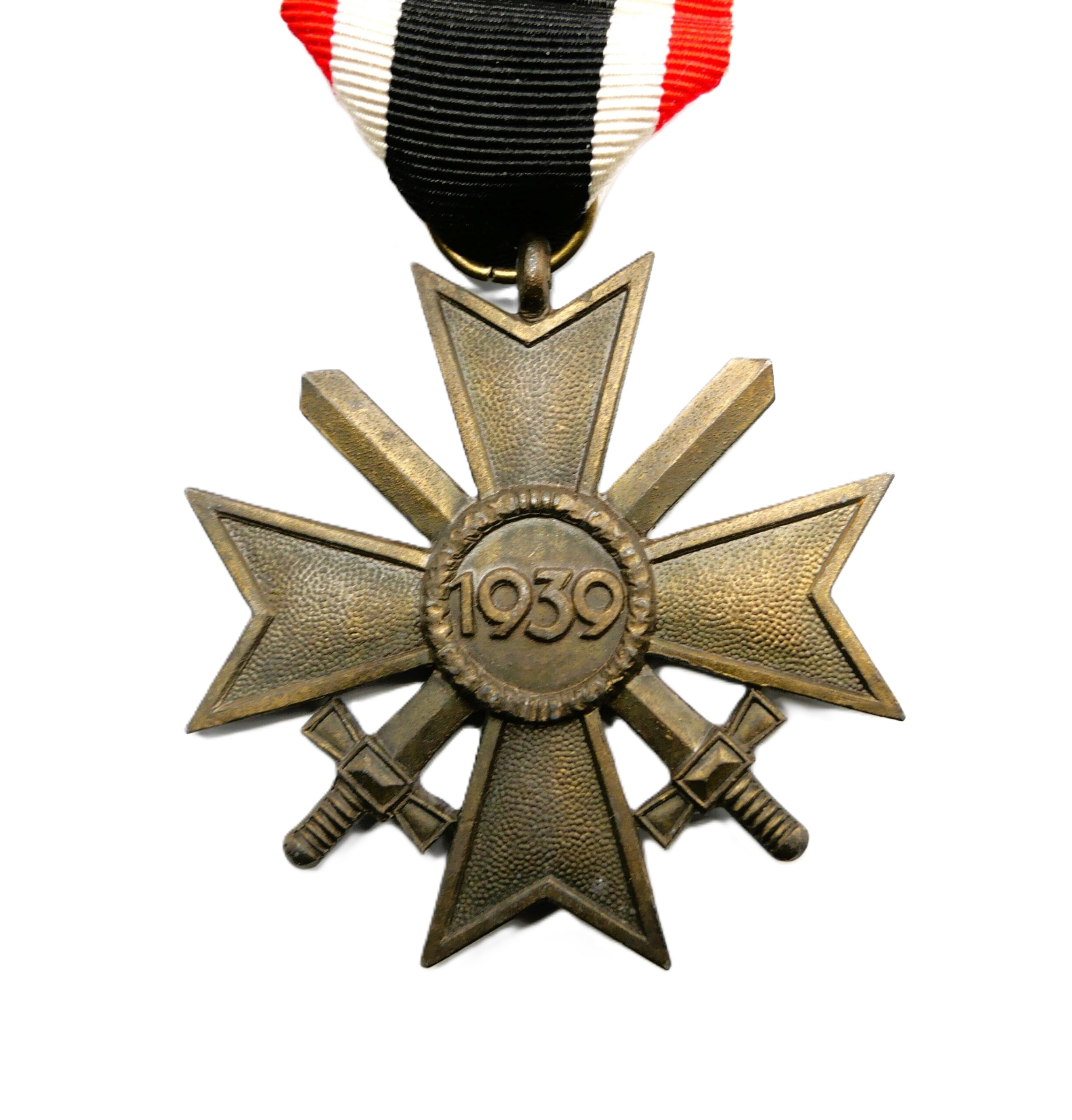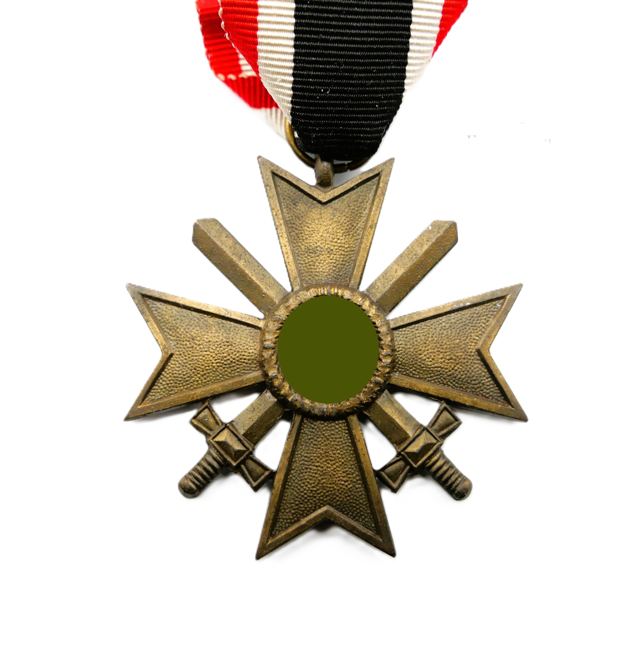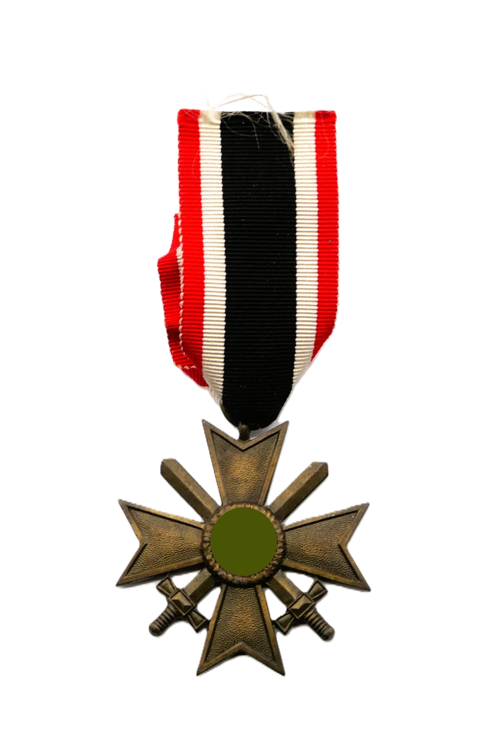 Kriegsverdienstkreuz 2. Klasse mit Schwerter am 11,5 cm langen Bandabschnitt. Buntmetallstück. Ohne Hersteller.