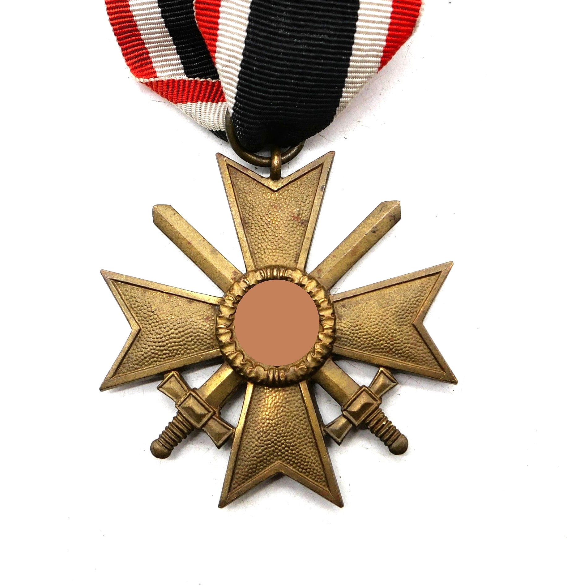 Kriegsverdienstkreuz 2. Klasse mit Schwerter am 14 cm langen Bandabschnitt. Buntmetallstück ohne Hersteller.