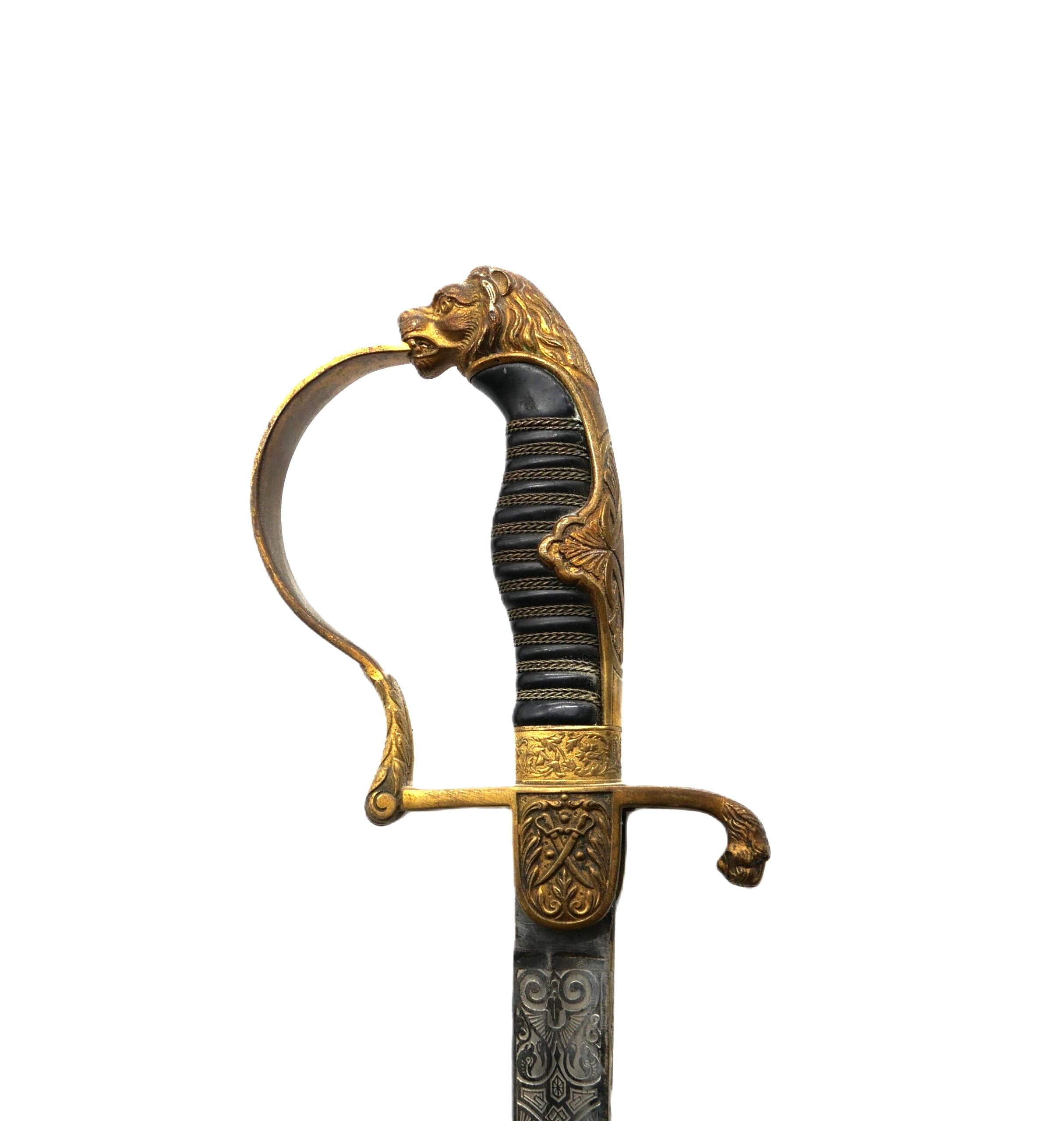 Löwenkopf Säbel der Kavallerie. Für Offiziere. Kein Hersteller sichtbar. Löwenkopf ohne roten Augen. Mit Lederscheide. Hier wurde das Leder und der untere Beschlag getauscht und ziemlich laienhaft ersetzt. Klinge mit kleineren Beschädigungen und einigen schwarzen Flecken. Säbel geht schwer in die Scheide. Zum Aufarbeiten oder als Ersatzteilträger. Getragener Zustand.
