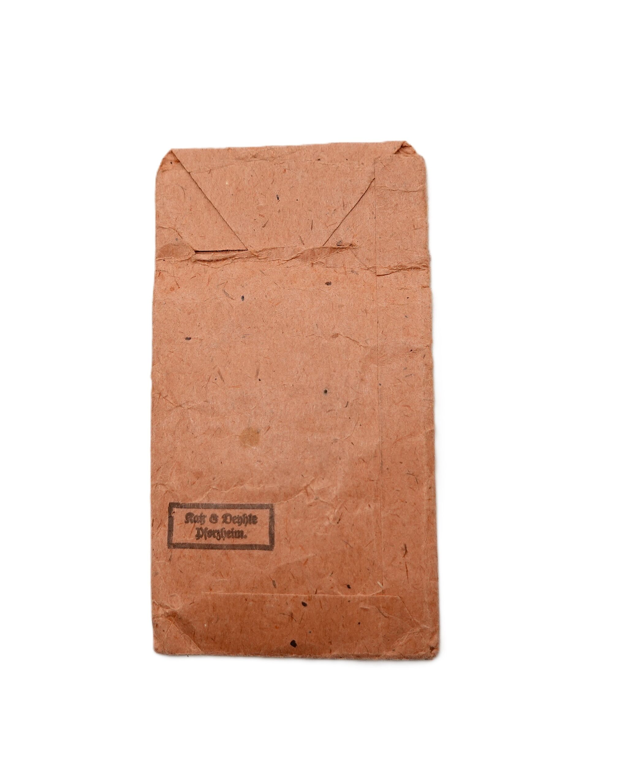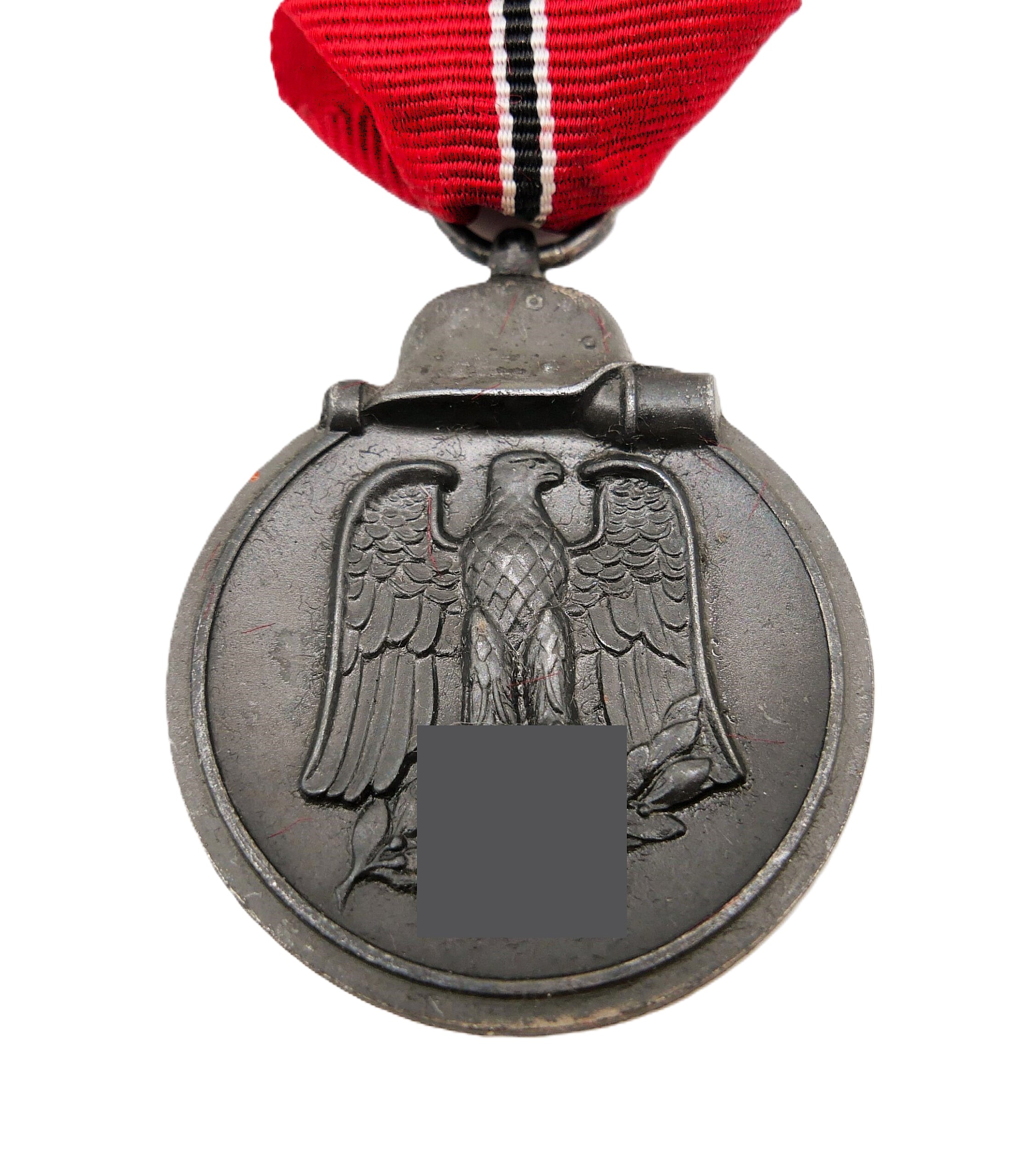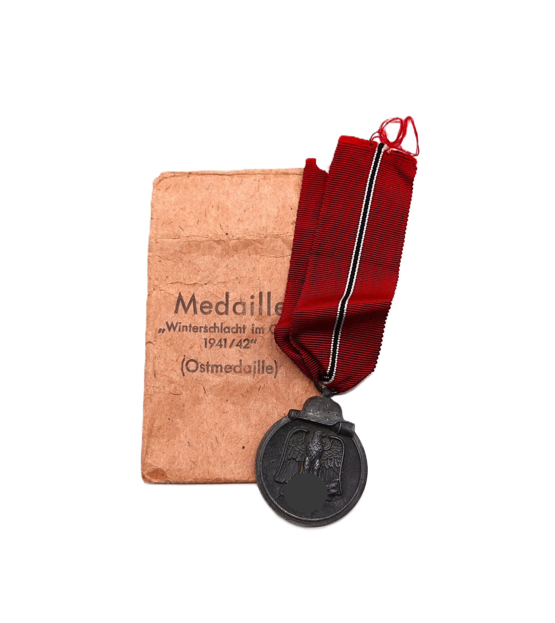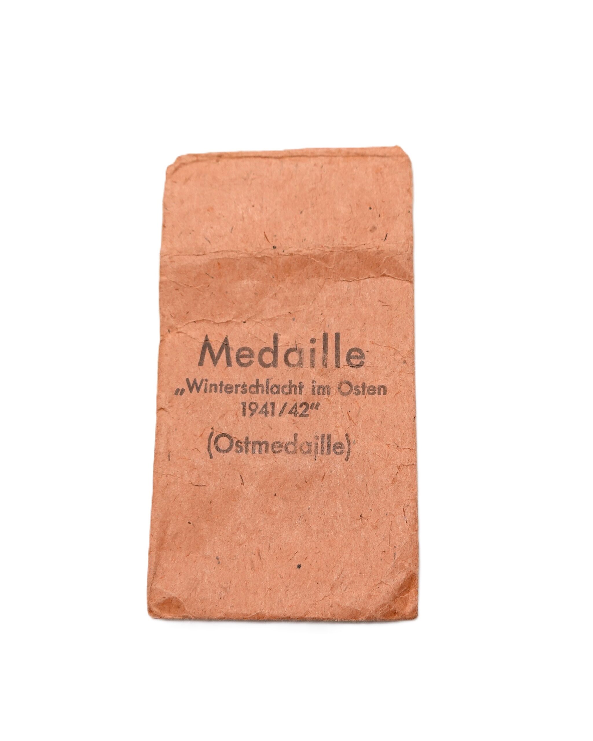 Medaille Winterschlacht im Osten 1941/42 am 14,5 cm langen Bandabschnitt. Hersteller 60 (Katz & Deyhle, Pforzheim). Mit der Verleihungstüte. Diese an einer Seite etwas aufgerissen und mit kleineren Beschädigungen.