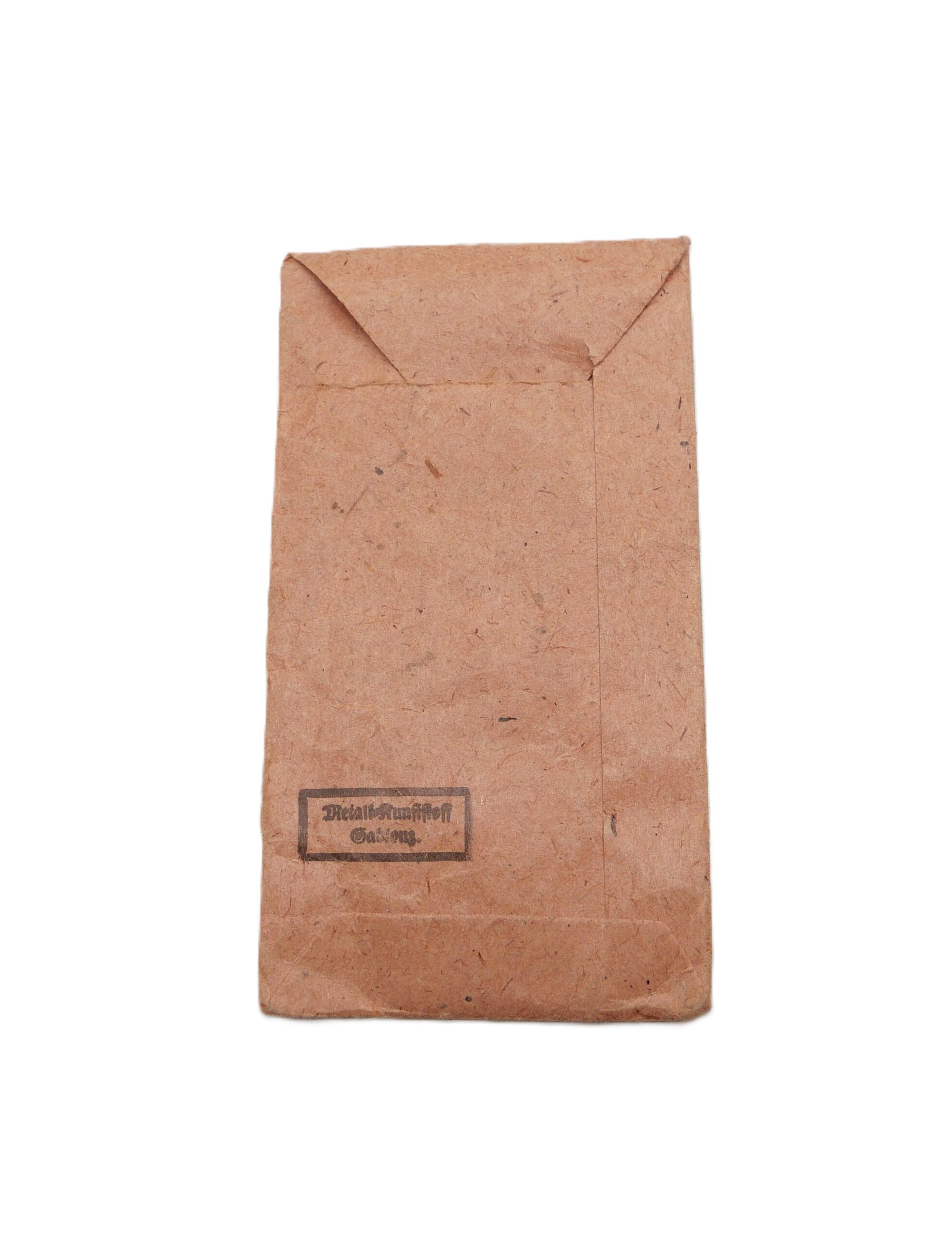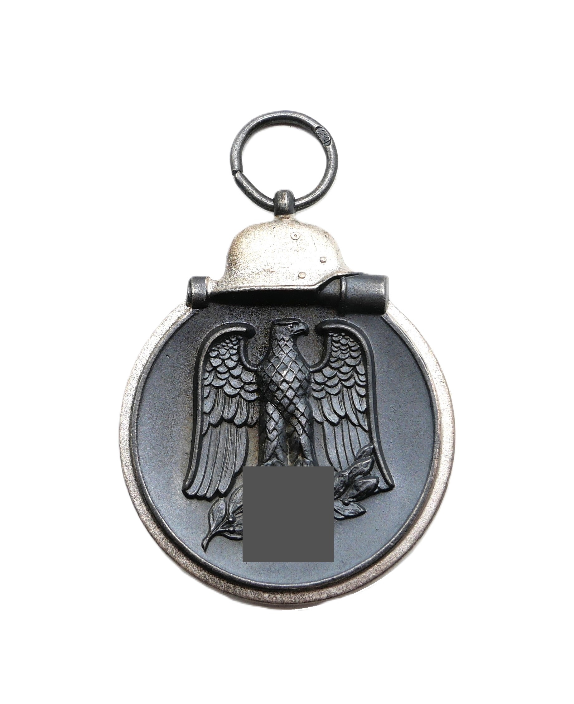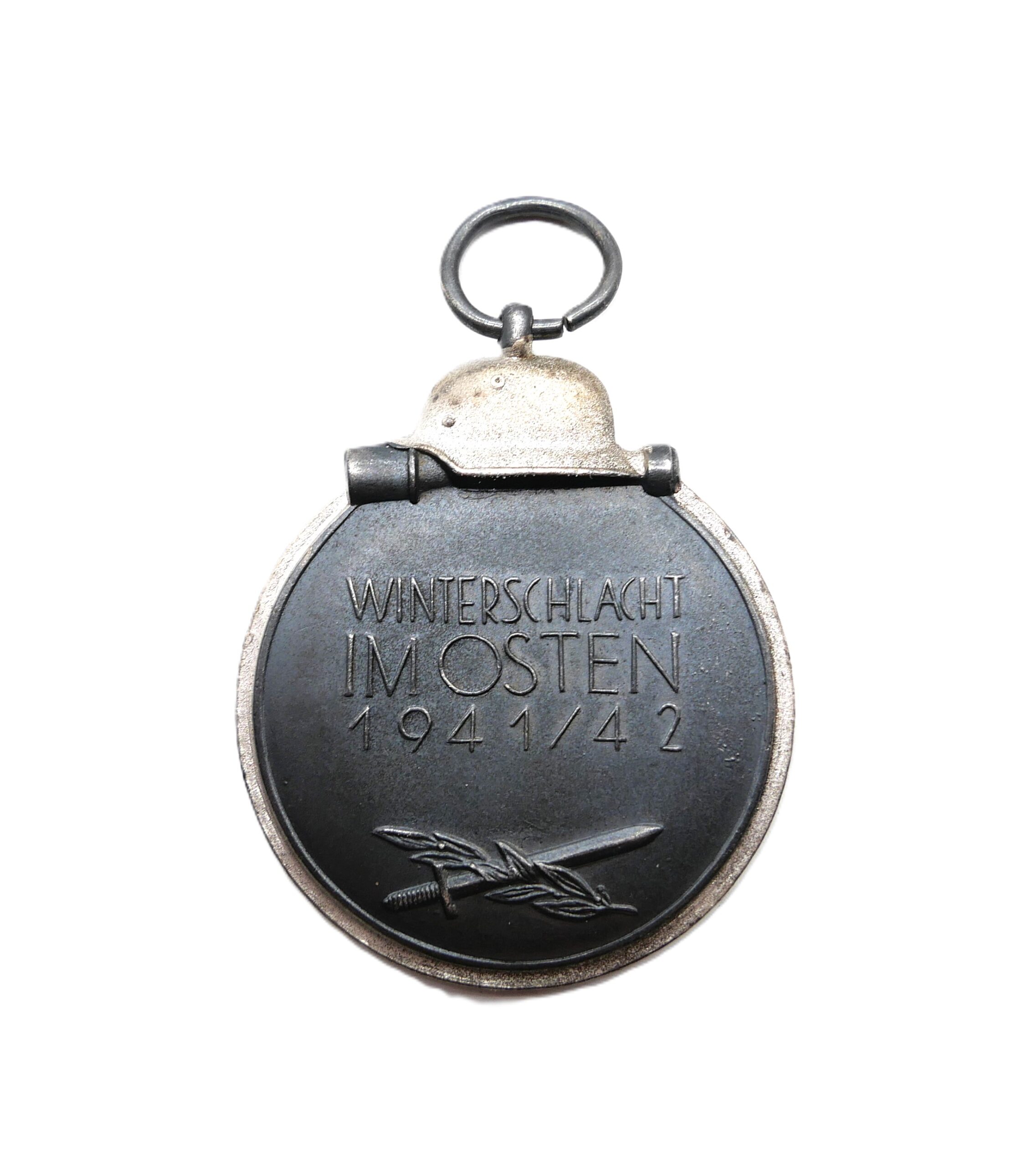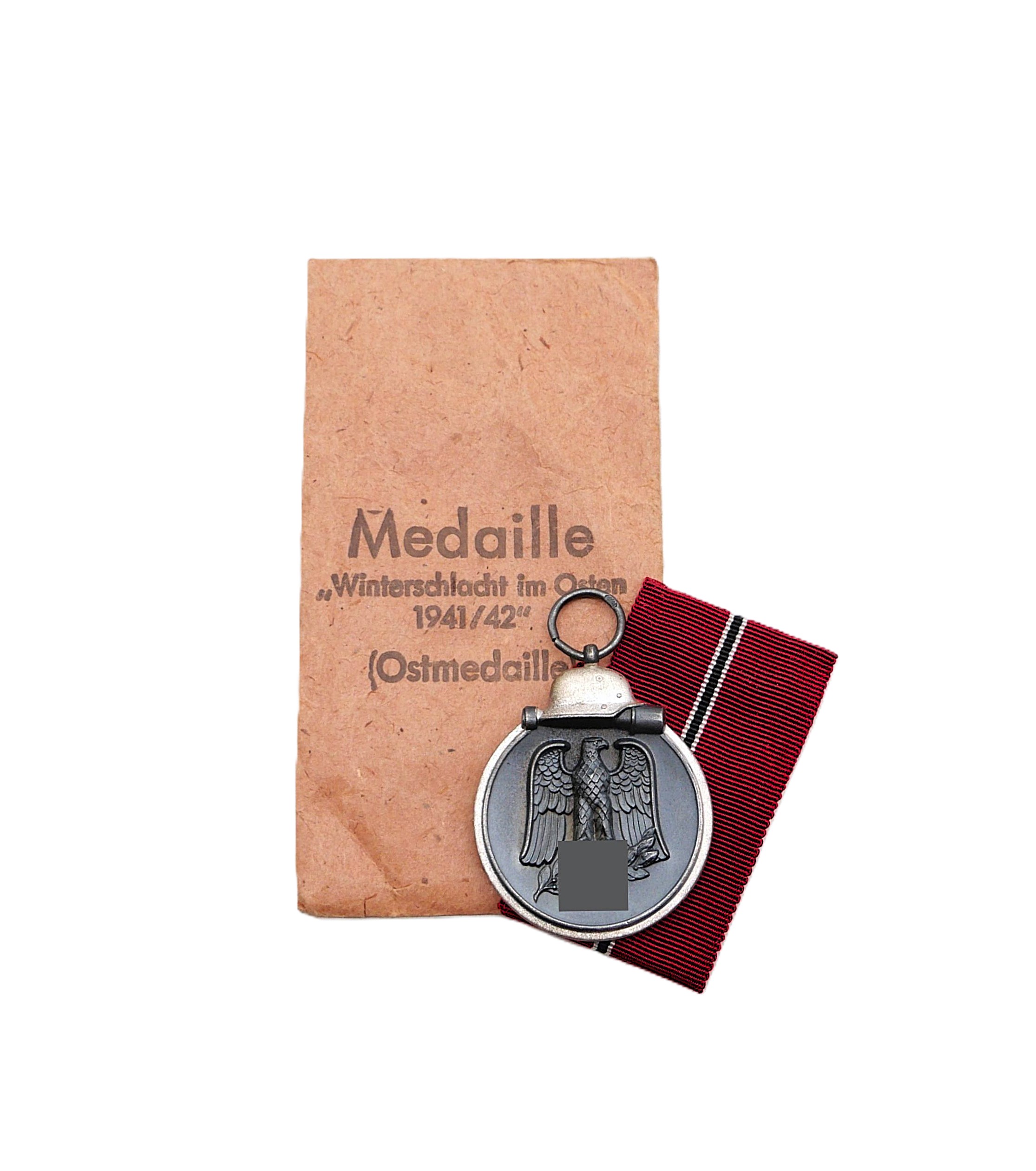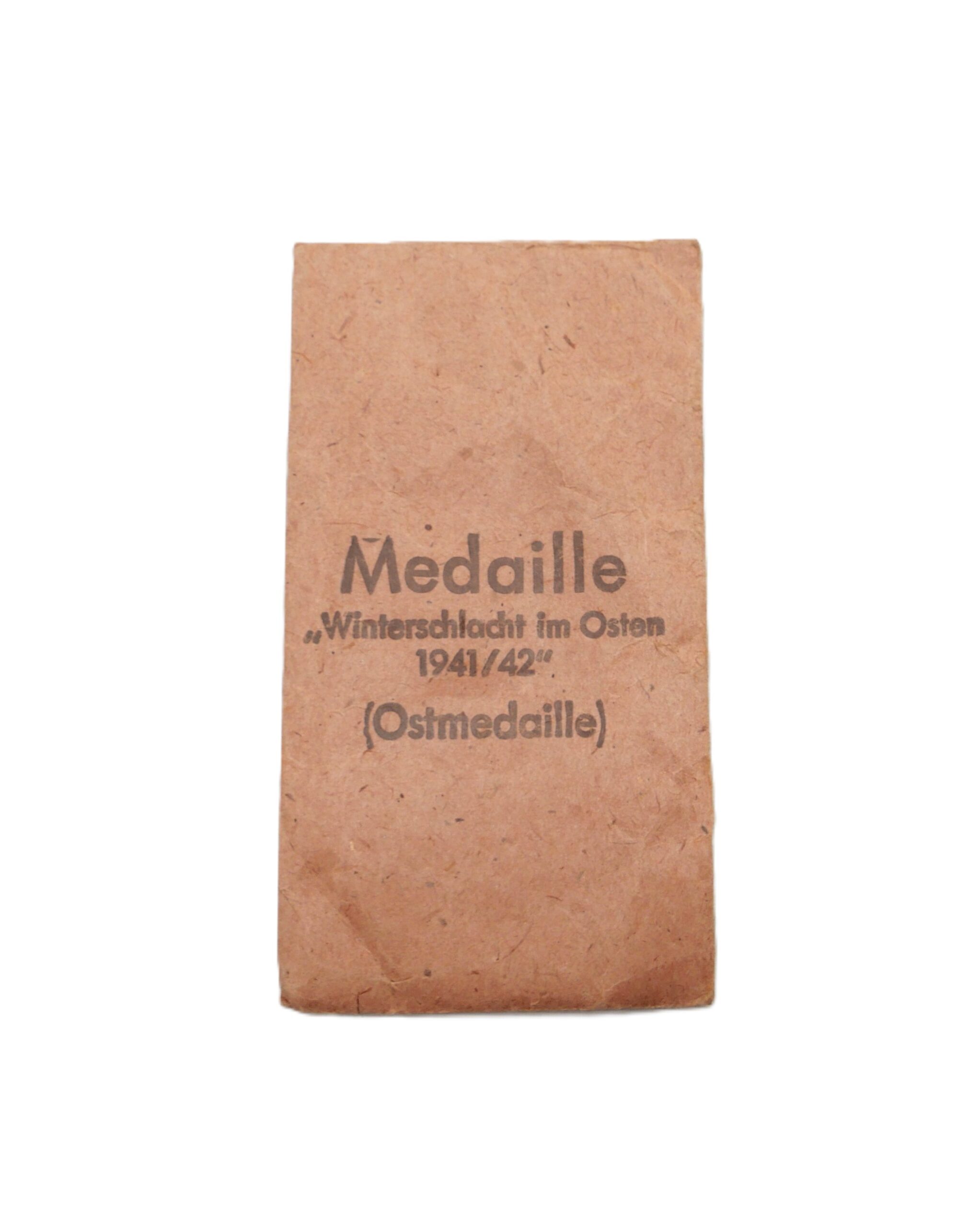 Medaille Winterschlacht im Osten 1941/42 mit 19 cm langen Bandabschnitt. Hersteller 63 (Franz Klast & Söhne, Gablonz). Mit der Verleihungstüte.