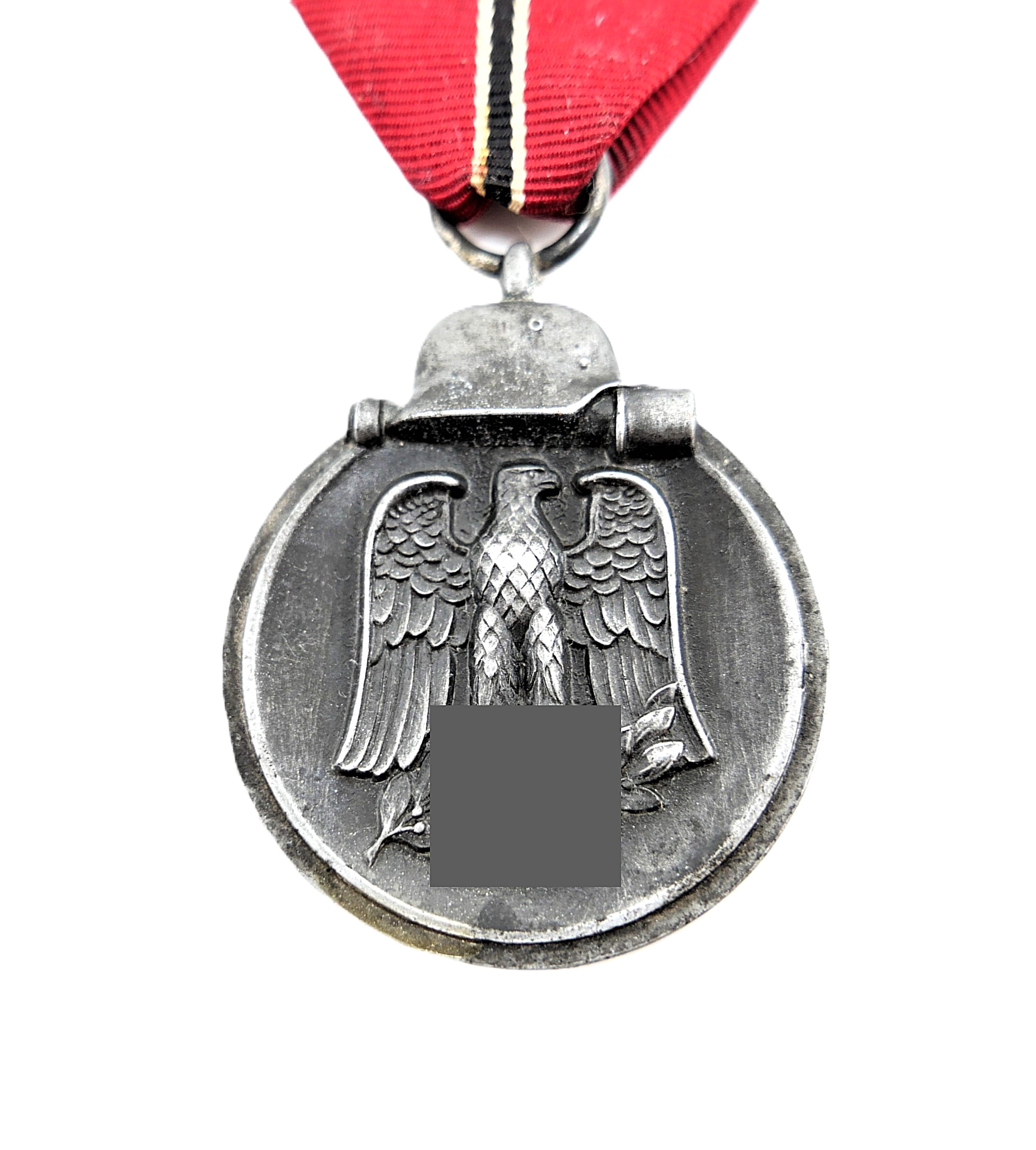 Medaille Winterschlacht im Osten 1941/42 am 16 cm langen Bandabschnitt. Dieser hat kleinere Löcher. Ohne Hersteller, wird aber dem Hersteller B. H. Mayer, Pforzheim zugeschrieben.
