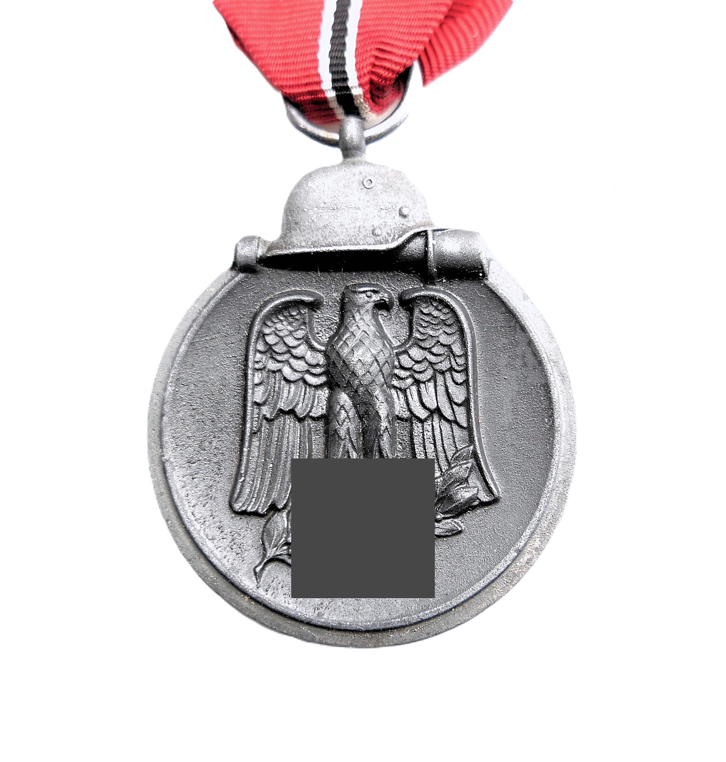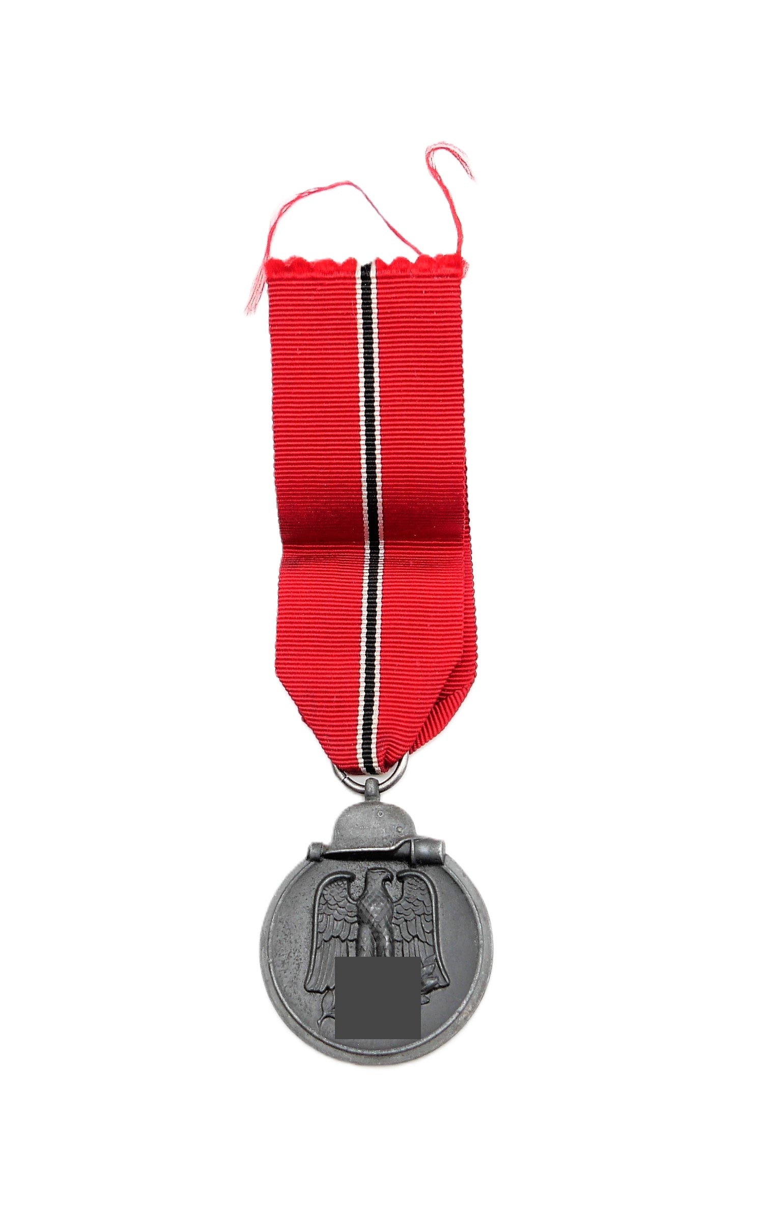Medaille Winterschlacht im Osten 1941/42 mit dem 19 cm langen Bandabschnitt. Hersteller 6 (Fritz Zimmermann, Stuttgart).