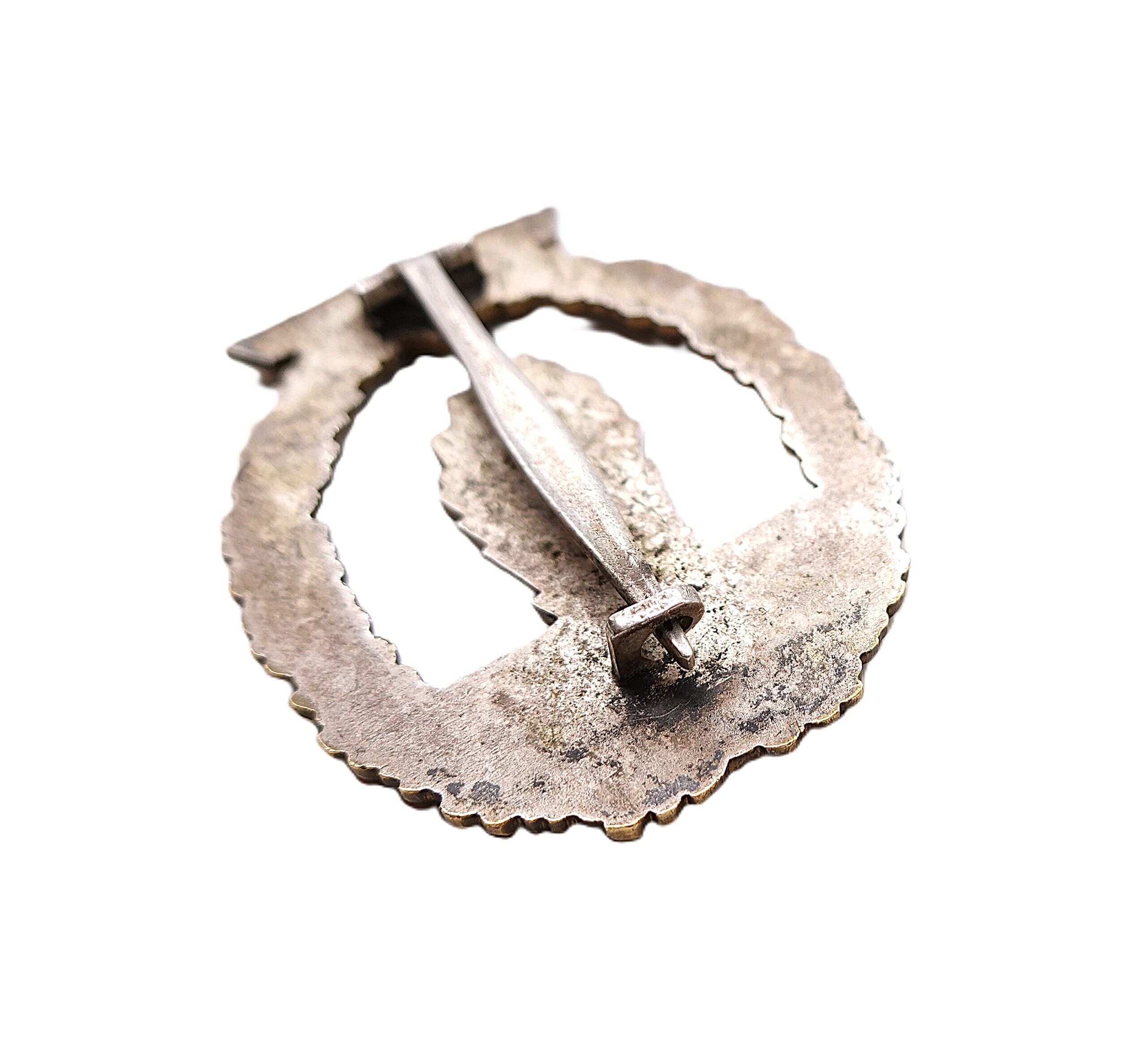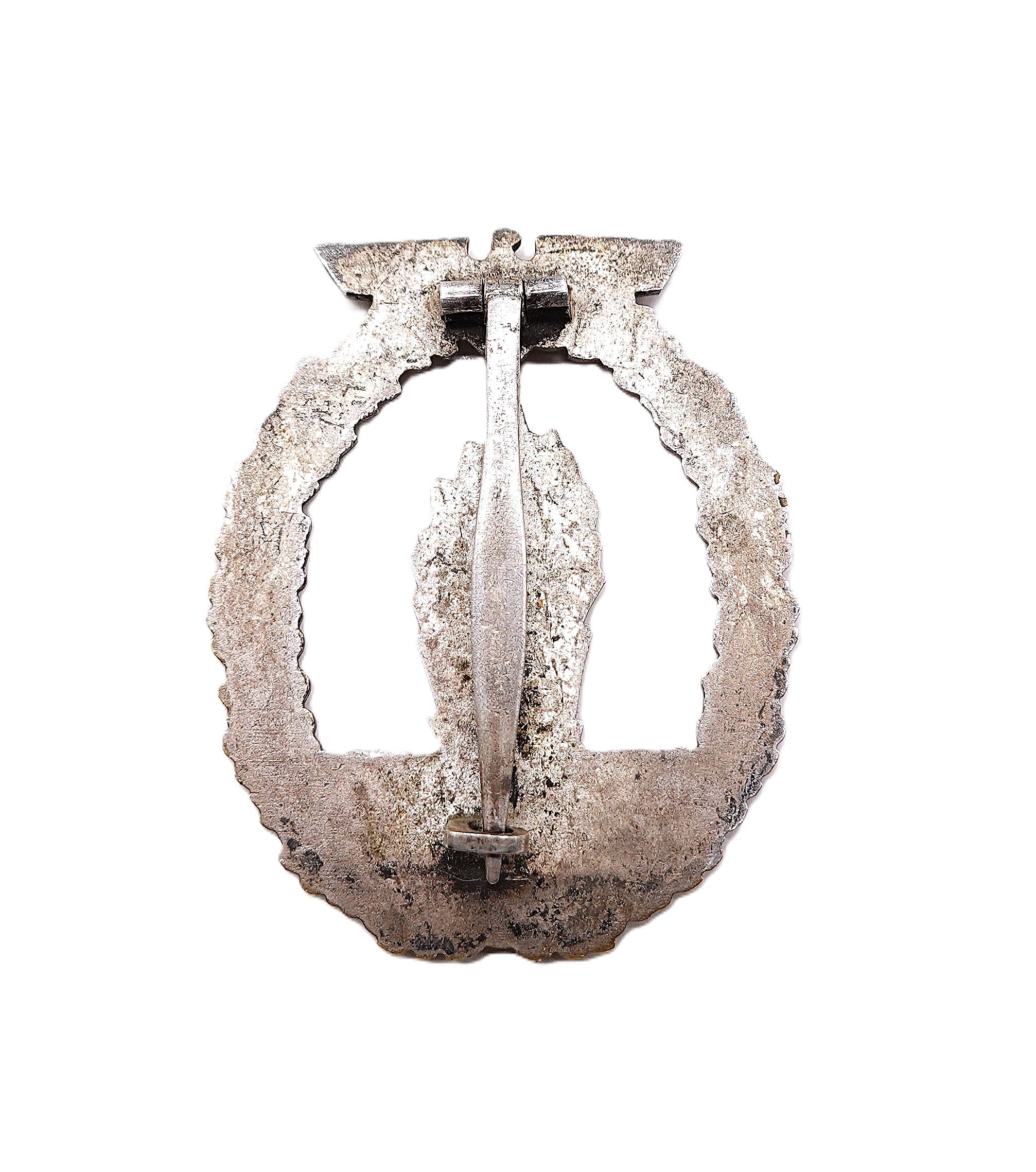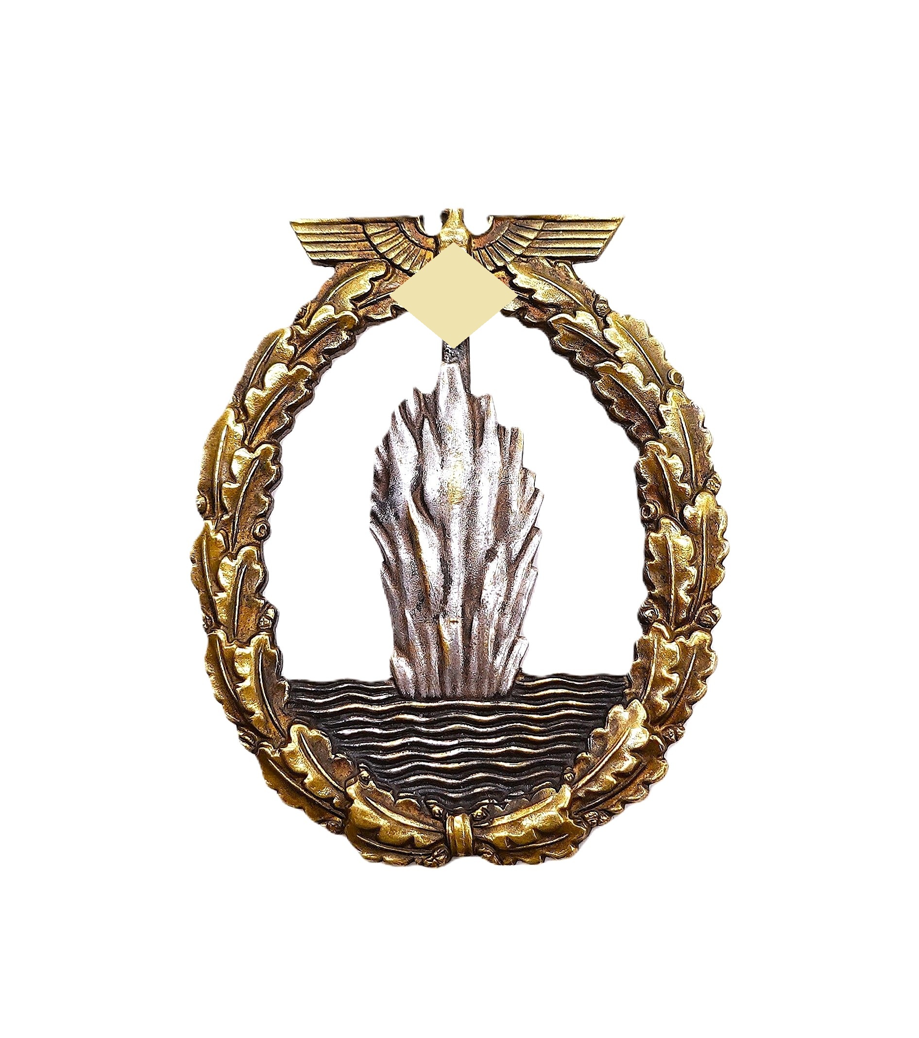 Minensucher (Kriegsabzeichen für Minensuch-, U-Boots-, Jagd- und Sicherungsverbände). Ohne Hersteller. Aber eine bekannte Ausführung des Hersteller B. H. Mayer Kunstprägeanstalt, Pforzheim. Variante 1. Aus Buntmetall. Schöner, getragener Zustand. Siehe dazu in der entsprechenden Fachlitaratur „Die Kriegsabzeichen der Kriegsmarine“ von Sascha Weber & Gerhard R. Skora den Betrag auf den Seiten 288 – 289.