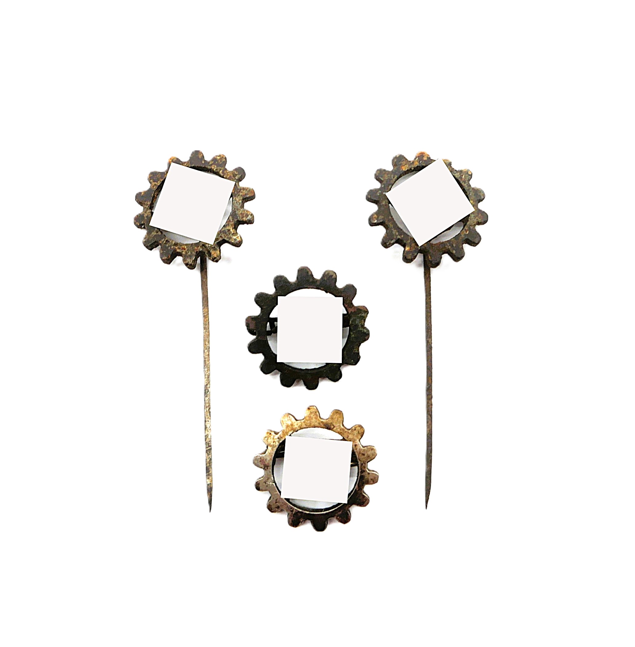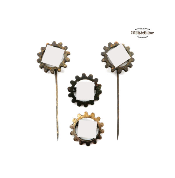 4 Mitgliedsabzeichen – DAF (Deutsche Arbeitsfront) – Mit Hersteller, leider nicht lesbar. Eine Nadel ist abgebrochen, aber dabei. Bodenfund.