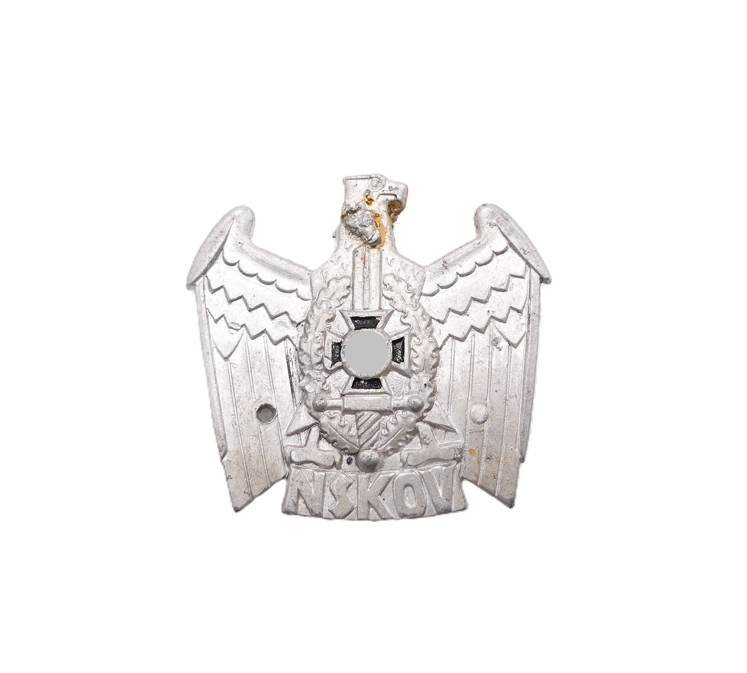 NSKOV (Kriegsopferversorgung) – Mützenadler. Aus Aluminium. Es wurden zusätzlich zwei Löcher gebohrt und Lötzinn aufgetragen. Bodenfund ohne Nadelsystem.