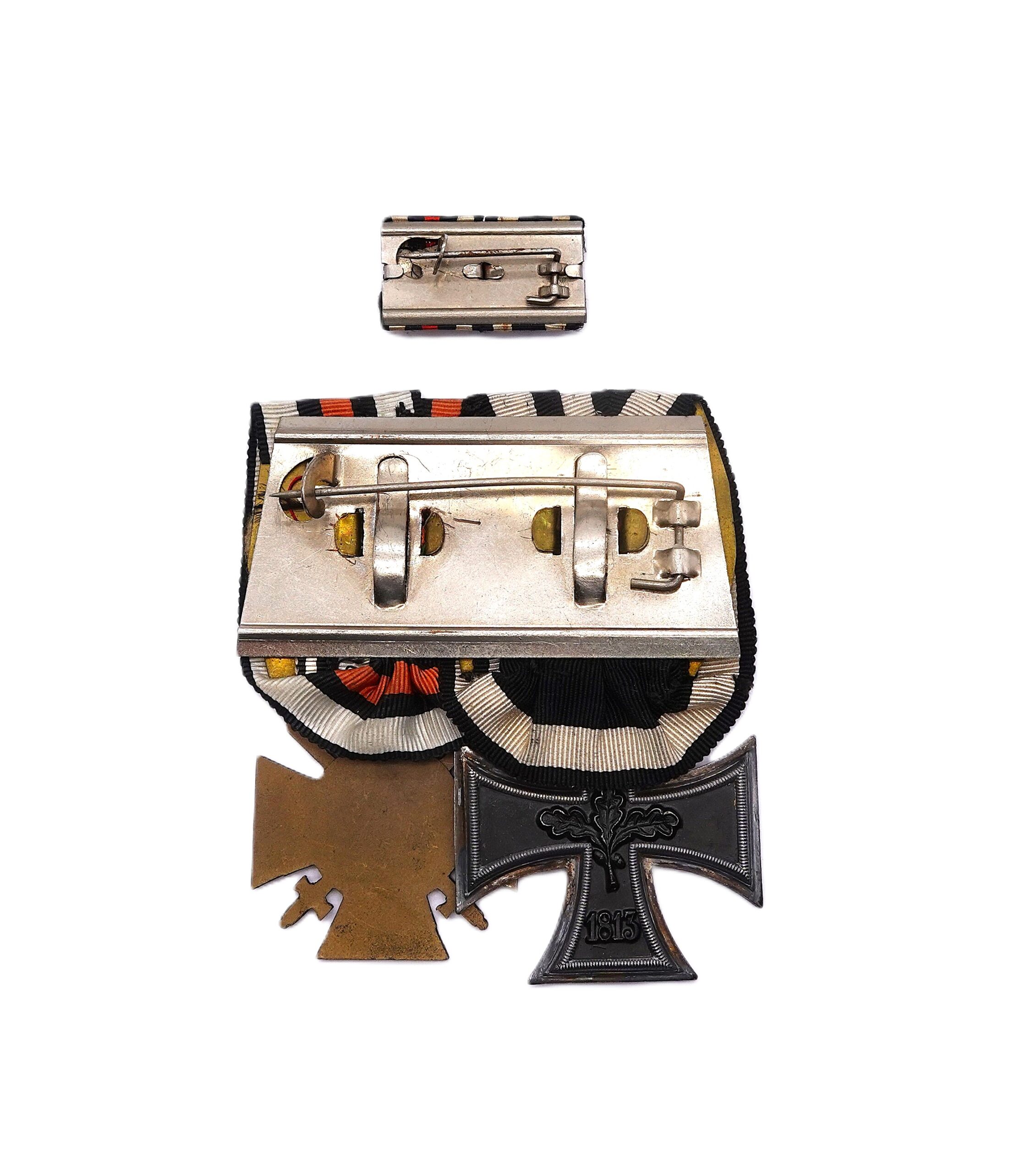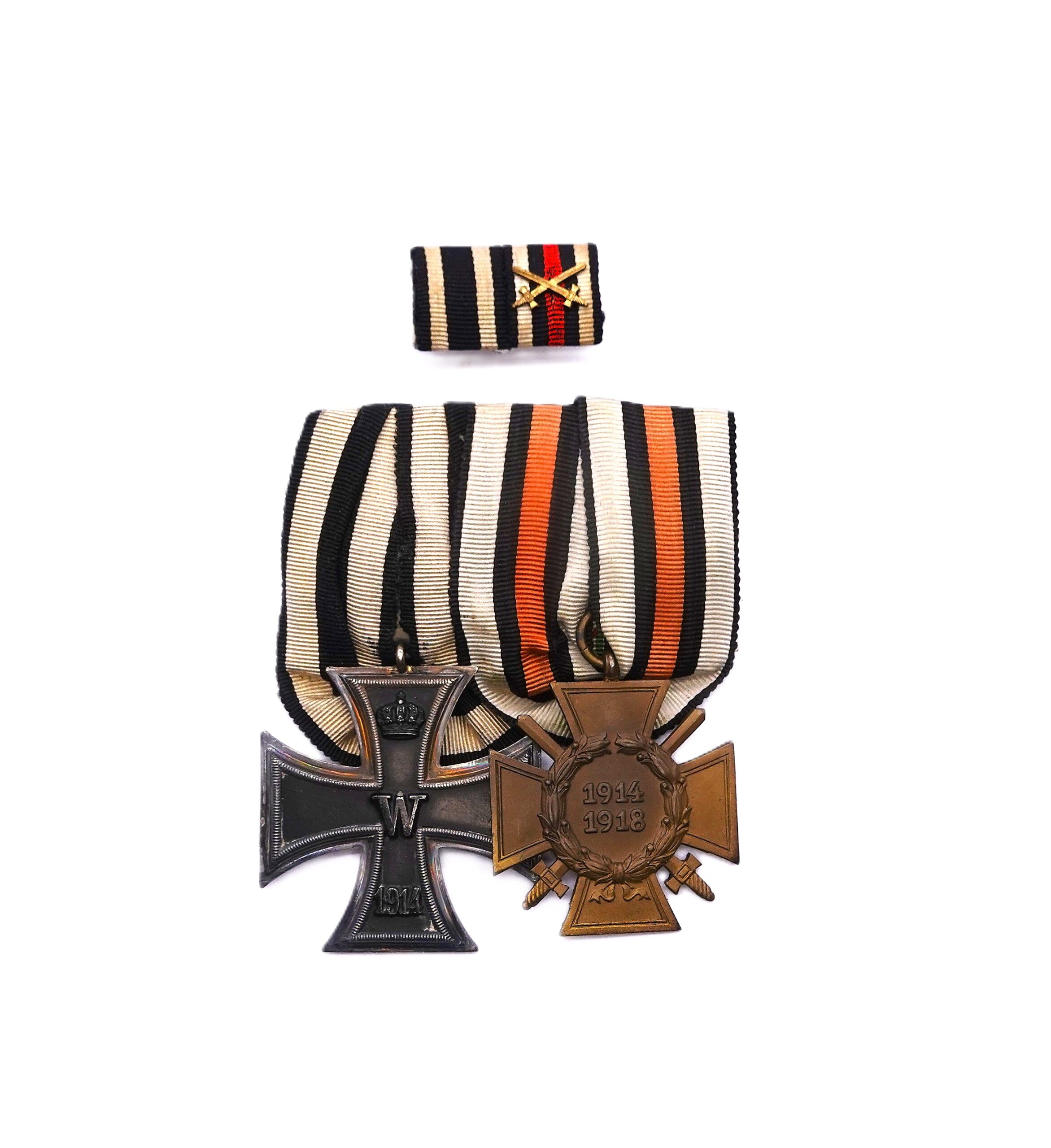 Ordensspange mit der Feldspange. Eisernes Kreuz 2. Klasse 1914 und Ehrenkreuz für Frontkämpfer. Beide Auszeichnungen magnetisch. Schöner getragener Zustand.