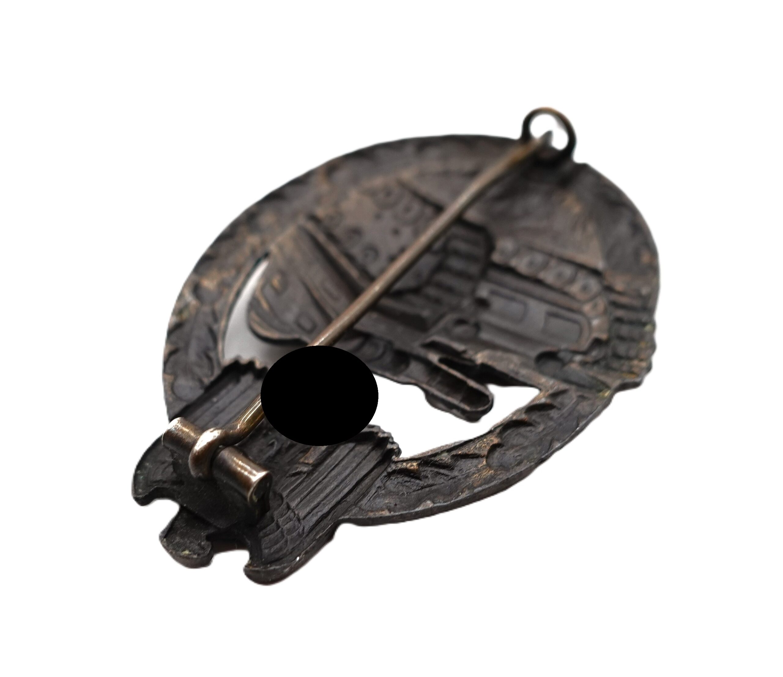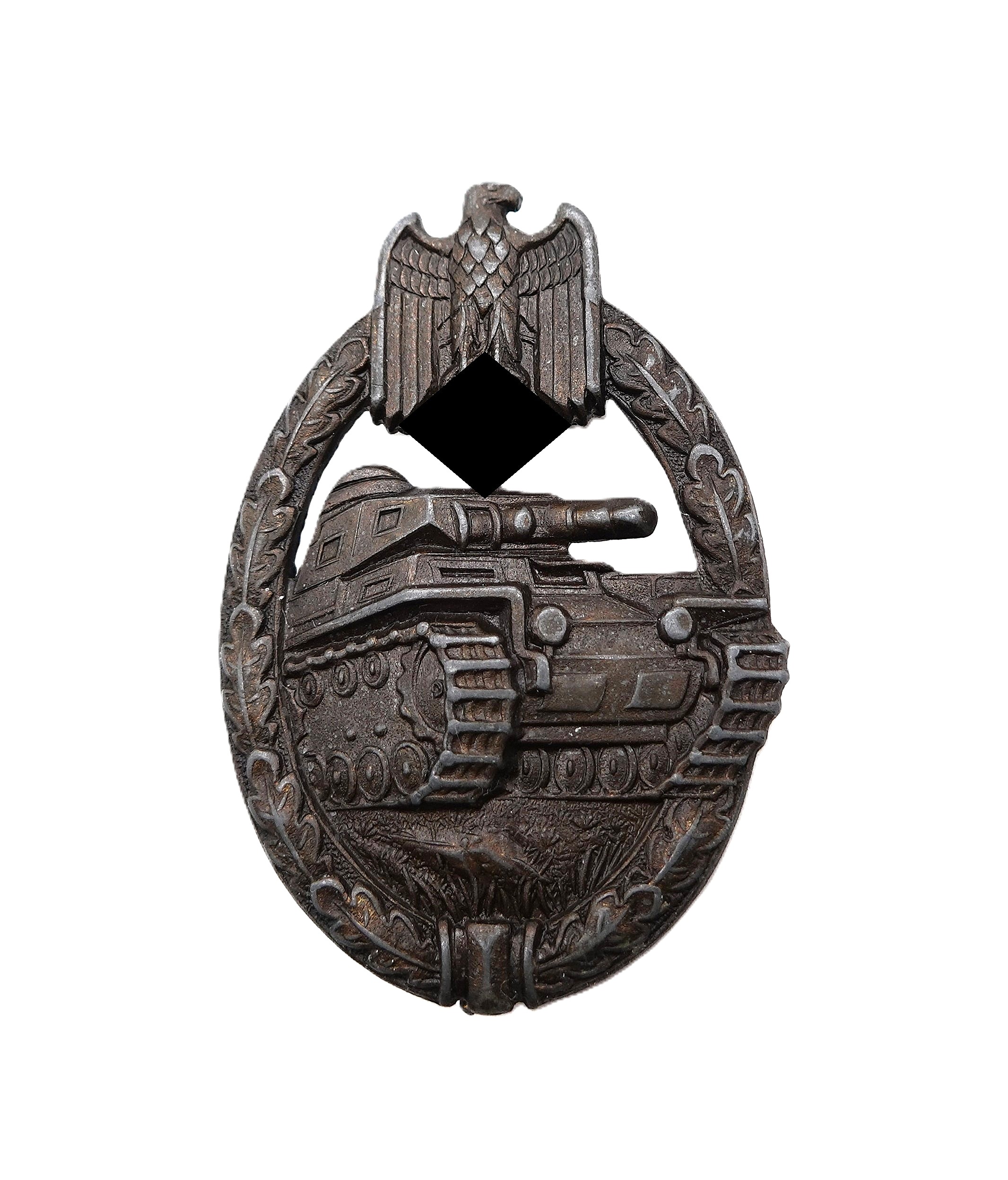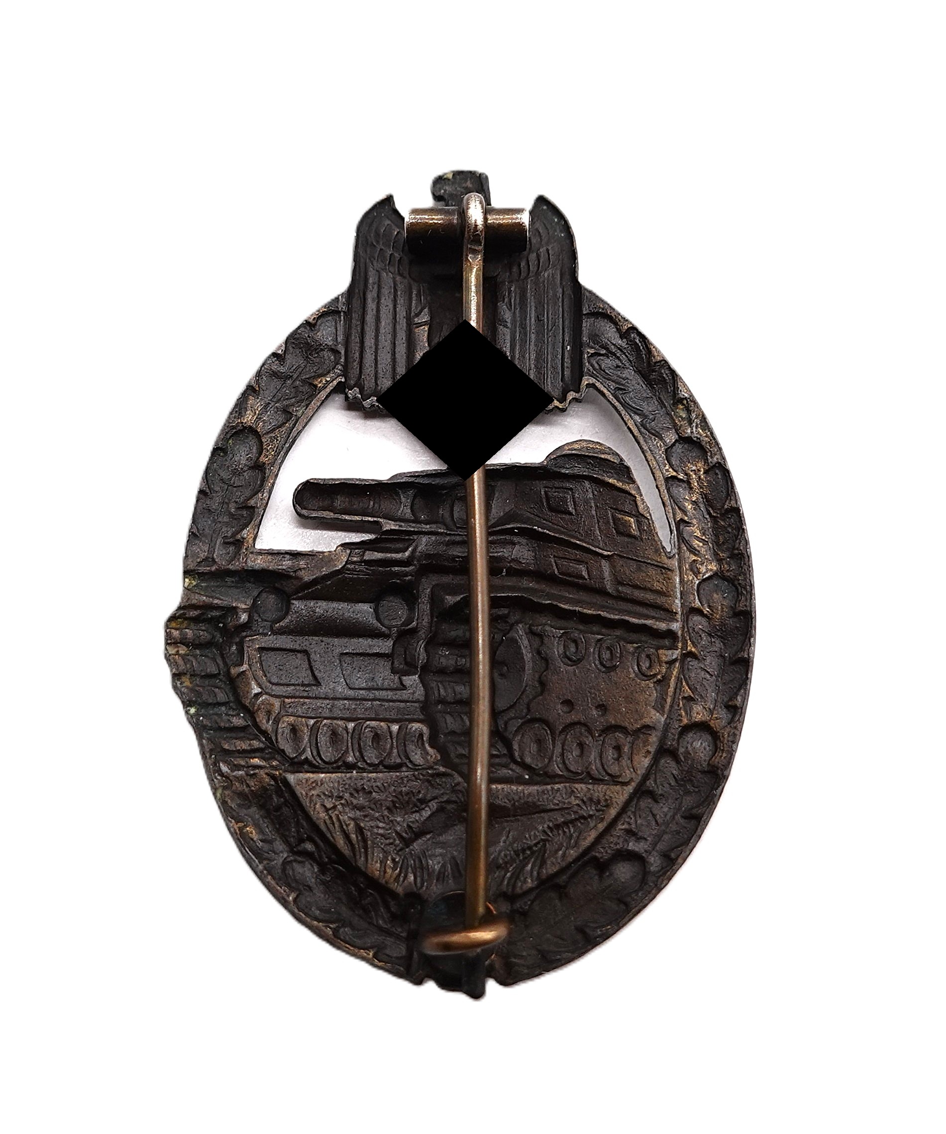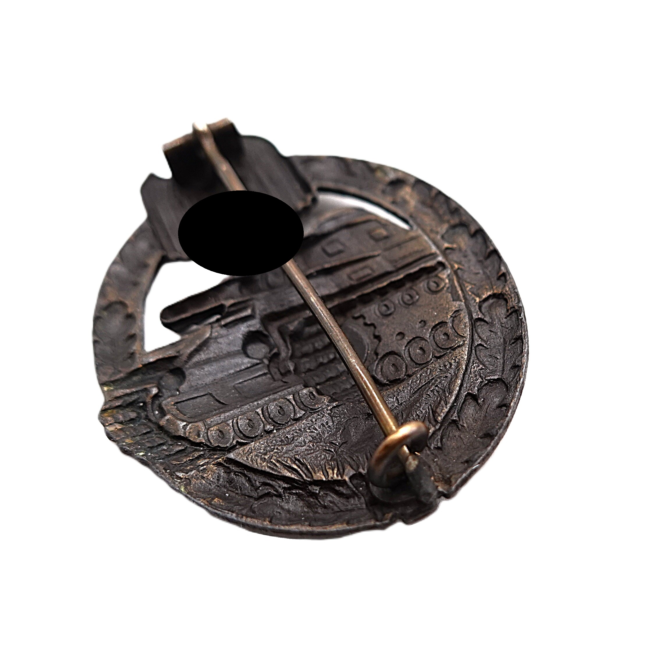 Panzerkampfabzeichen Bronze. Ohne Hersteller. Variante der Firma C. E. Juncker, Berlin. Hohlprägung aus Zink. Getragener Zustand.