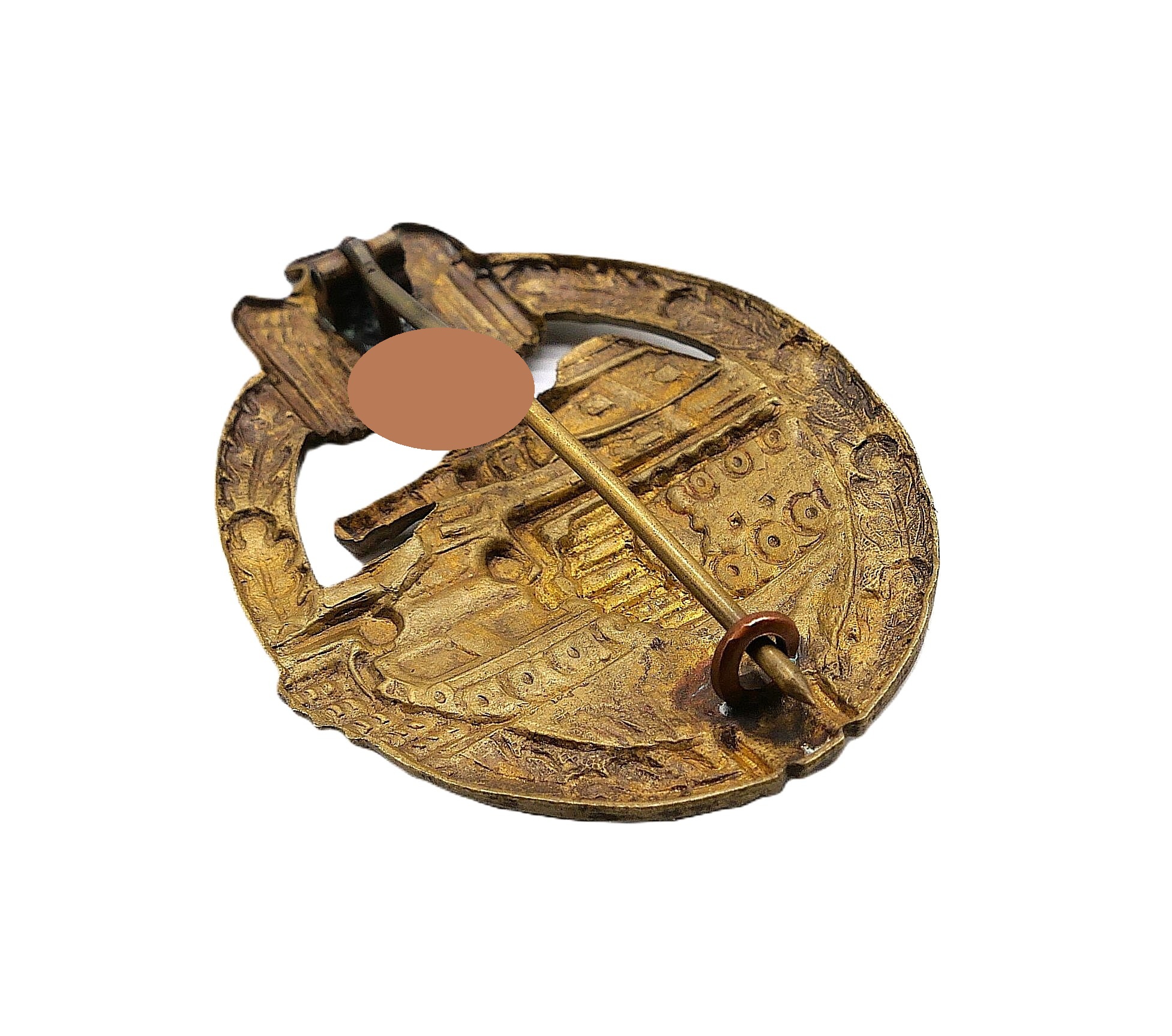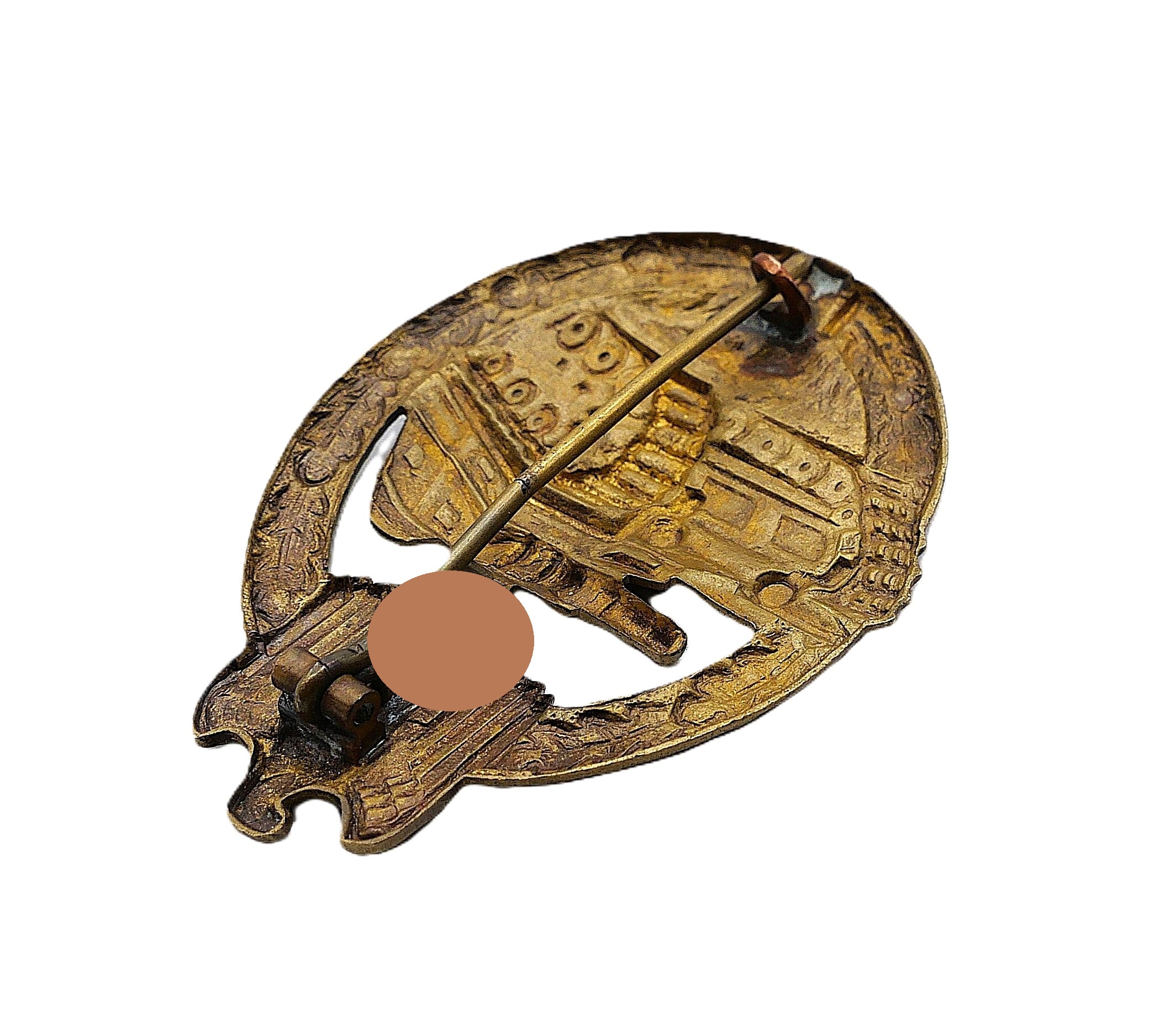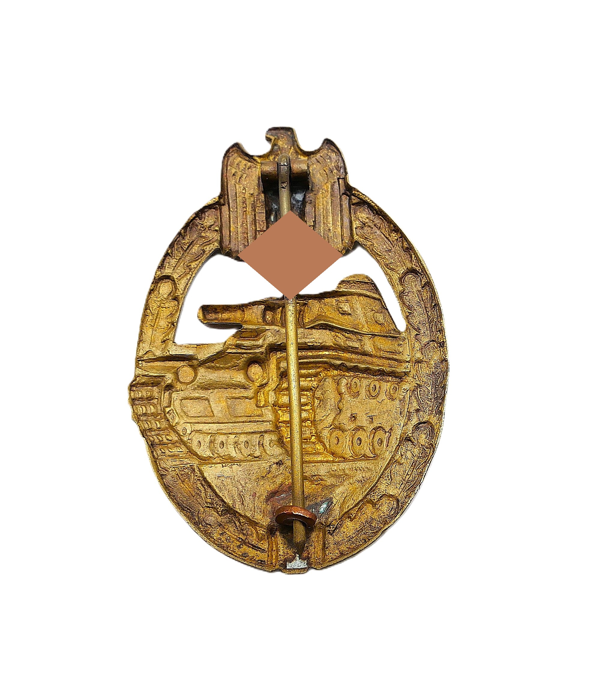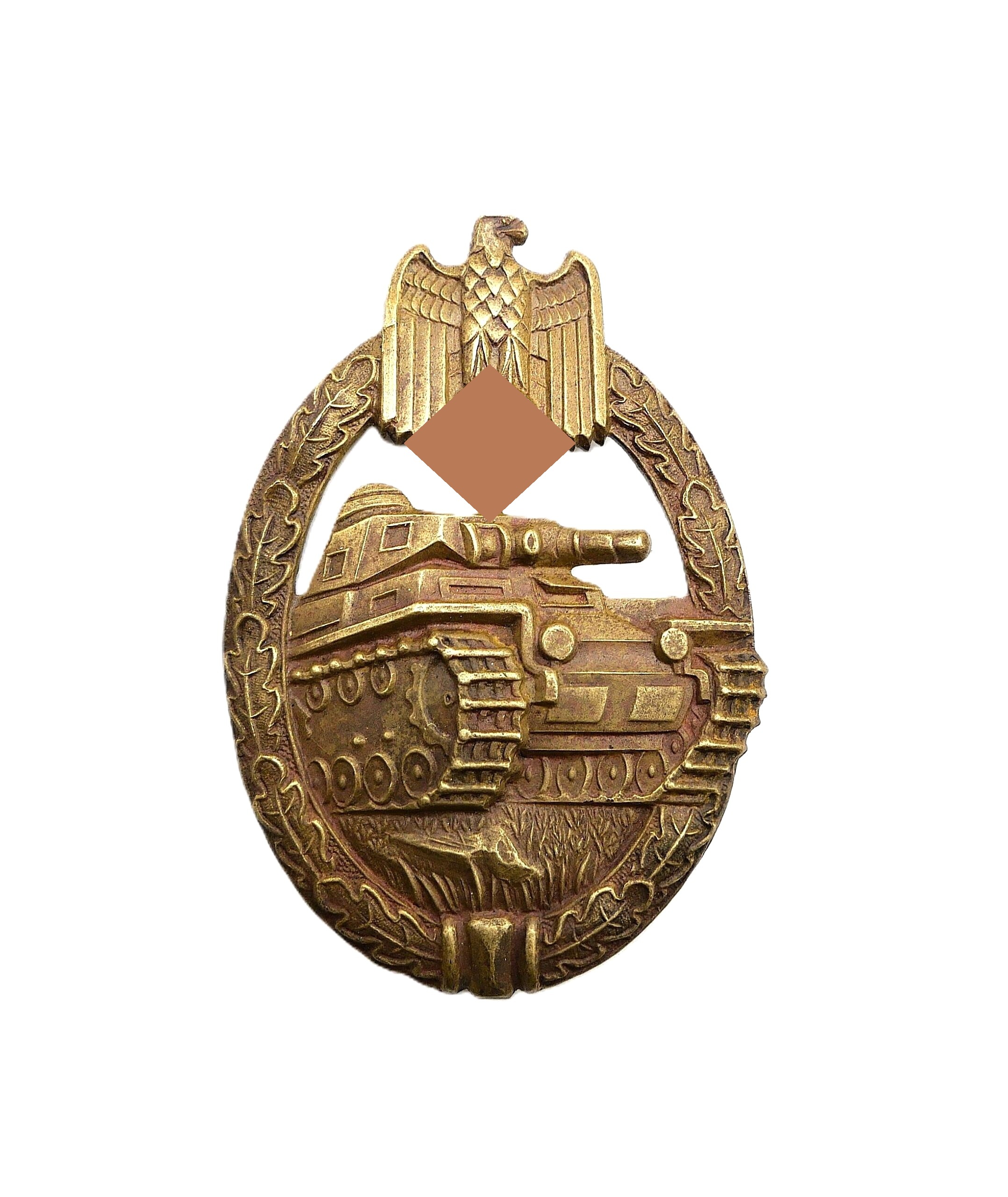 Panzerkampfabzeichen Bronze. Hersteller Karl Wurster KG, Markneukirchen. Hohlprägung aus Buntmetall. Nadel in der Mitte etwas geknickt und angebrochen. Getragener Zustand.
