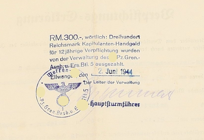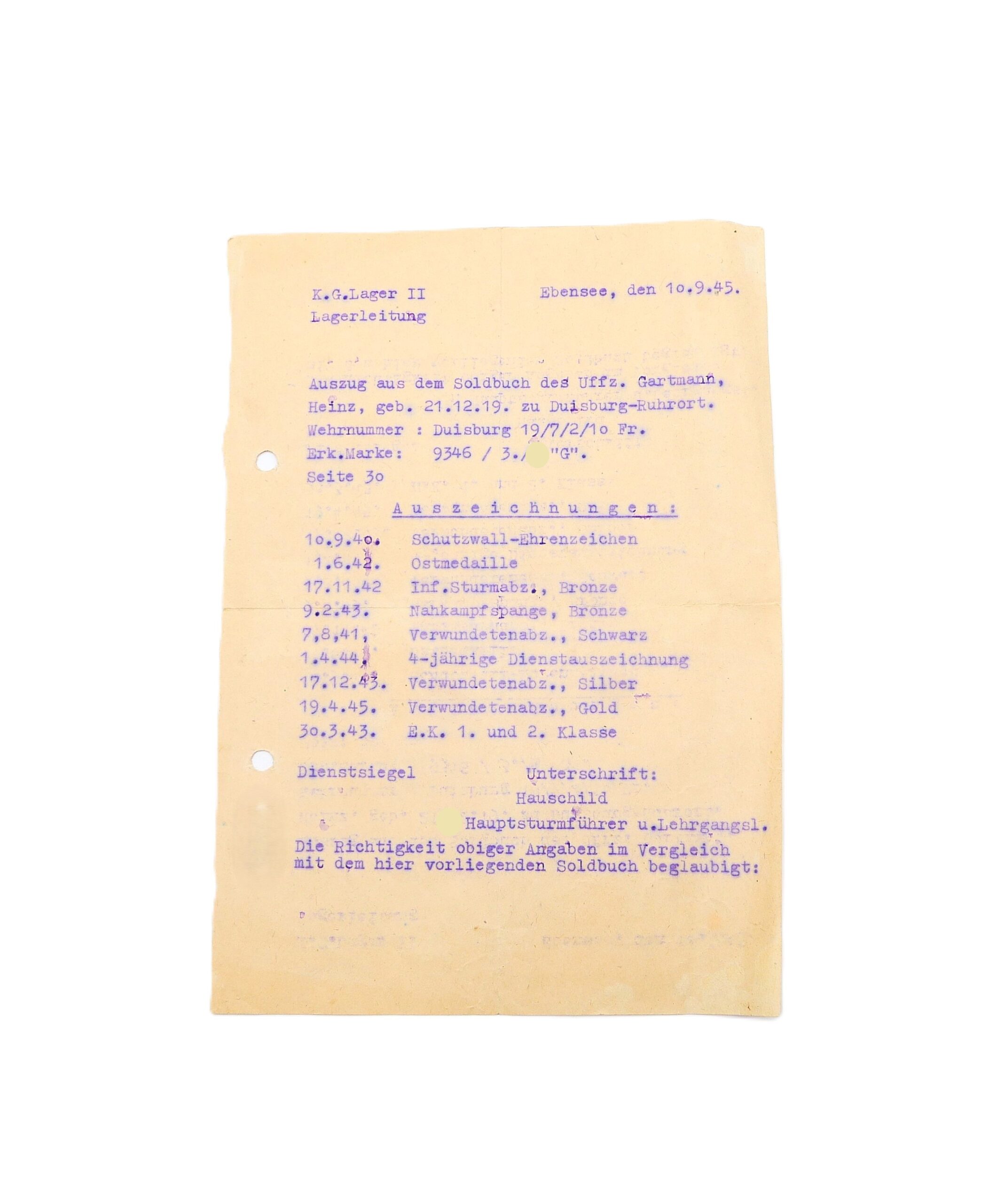 – Auszug aus dem Soldbuch über seine Auszeichnungen.