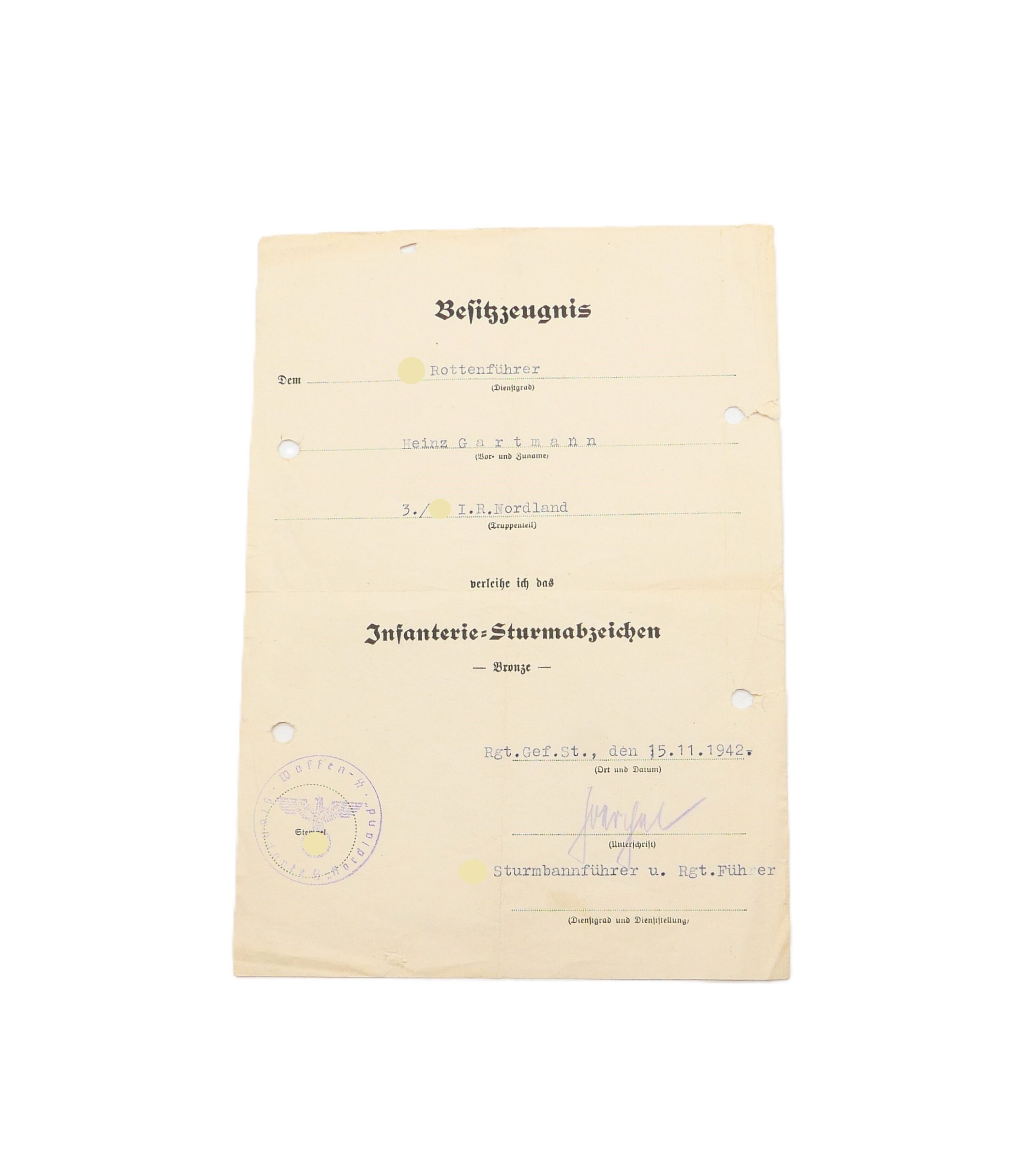 – Verleihungsurkunde zum Infanterie Sturmabzeichen Bronze. Gelocht und zweimal gefaltet. OU Wolfgang Joerchel. Zu dem Zeitpunkt noch Sturmbannführer. Ritterkreuz wurde ihm an 21. April 1944 verliehen.