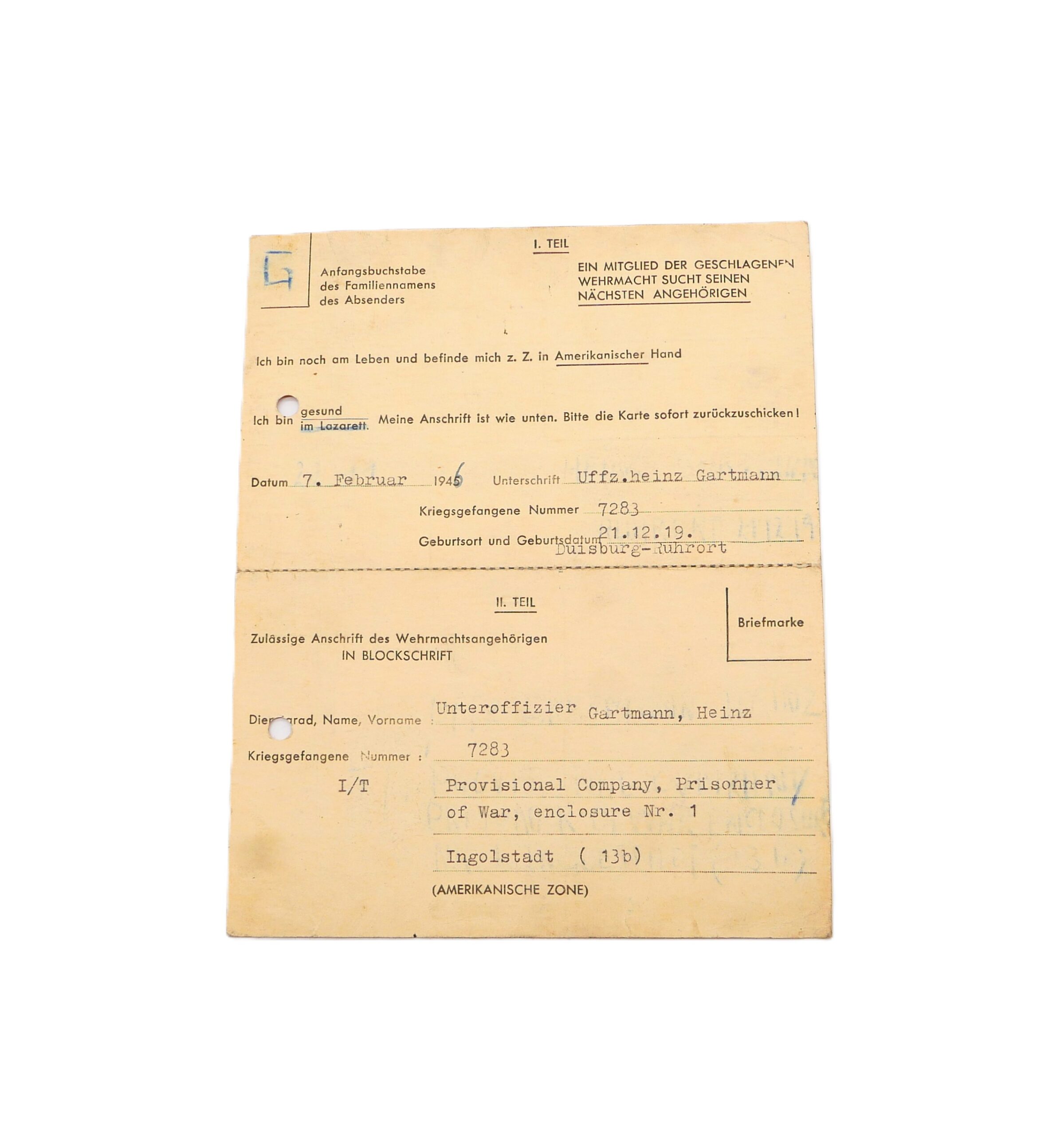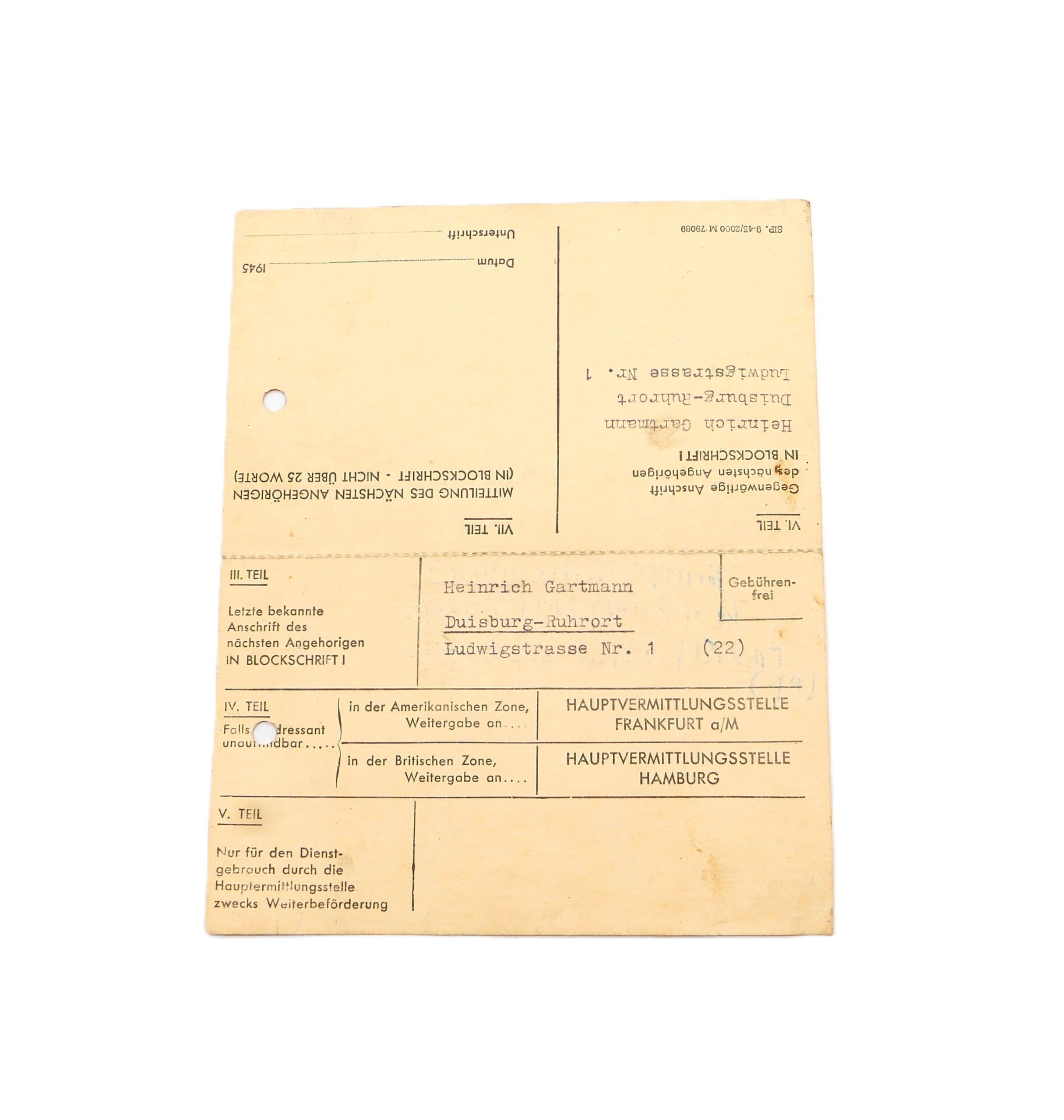 – Karte – Ein Mitglied der geschlagenen Wehrmacht sucht seinen nächsten Angehörigen.