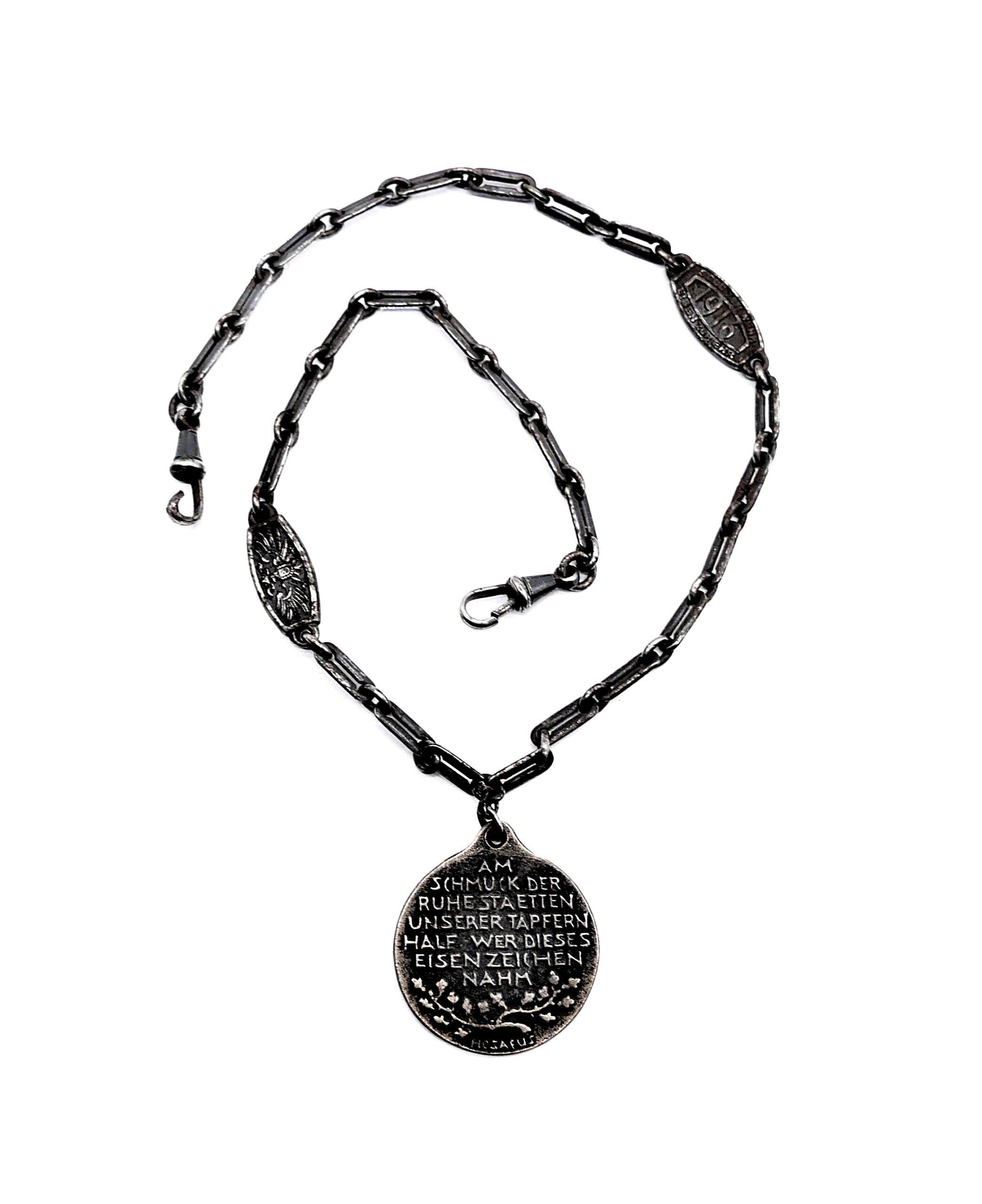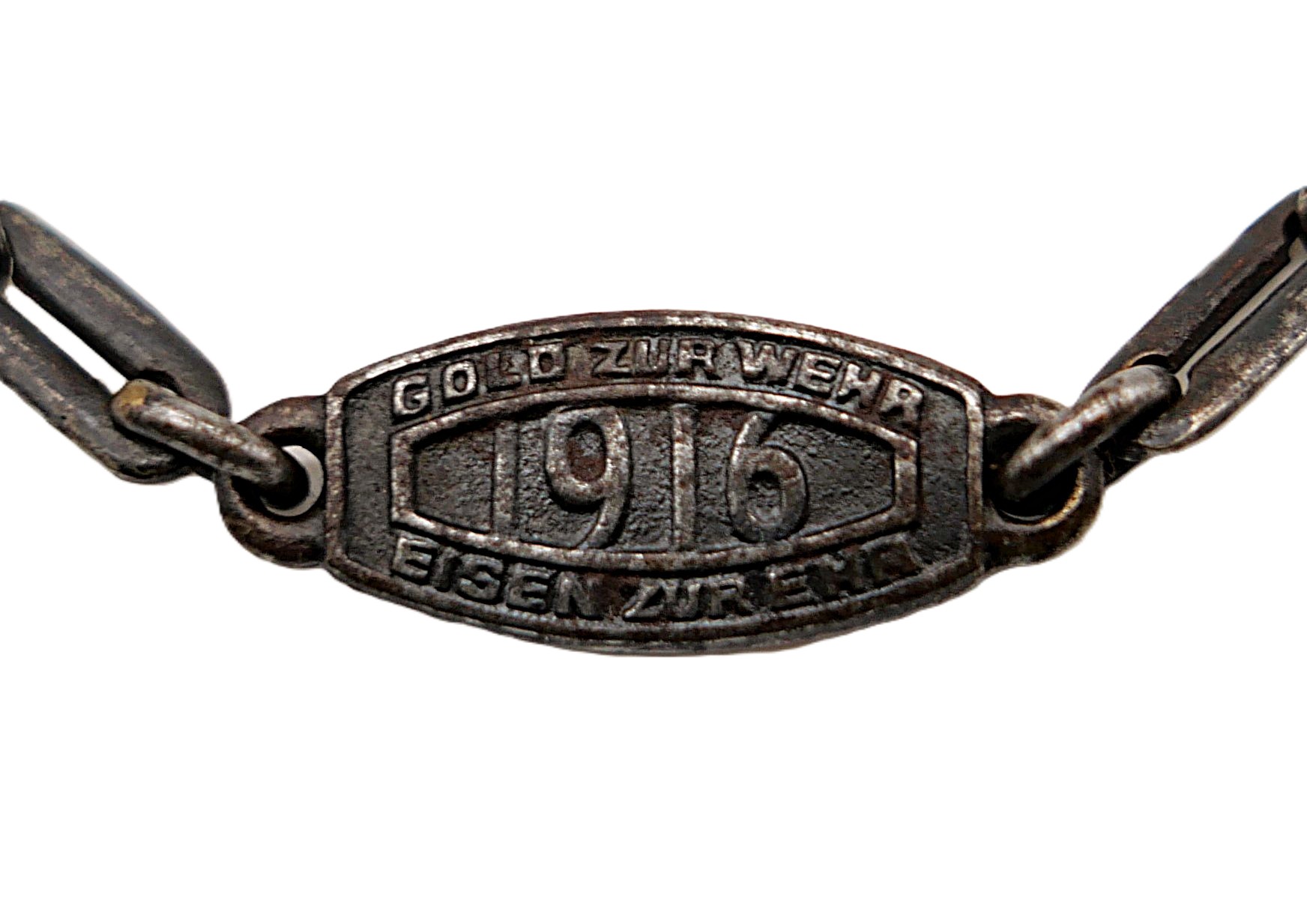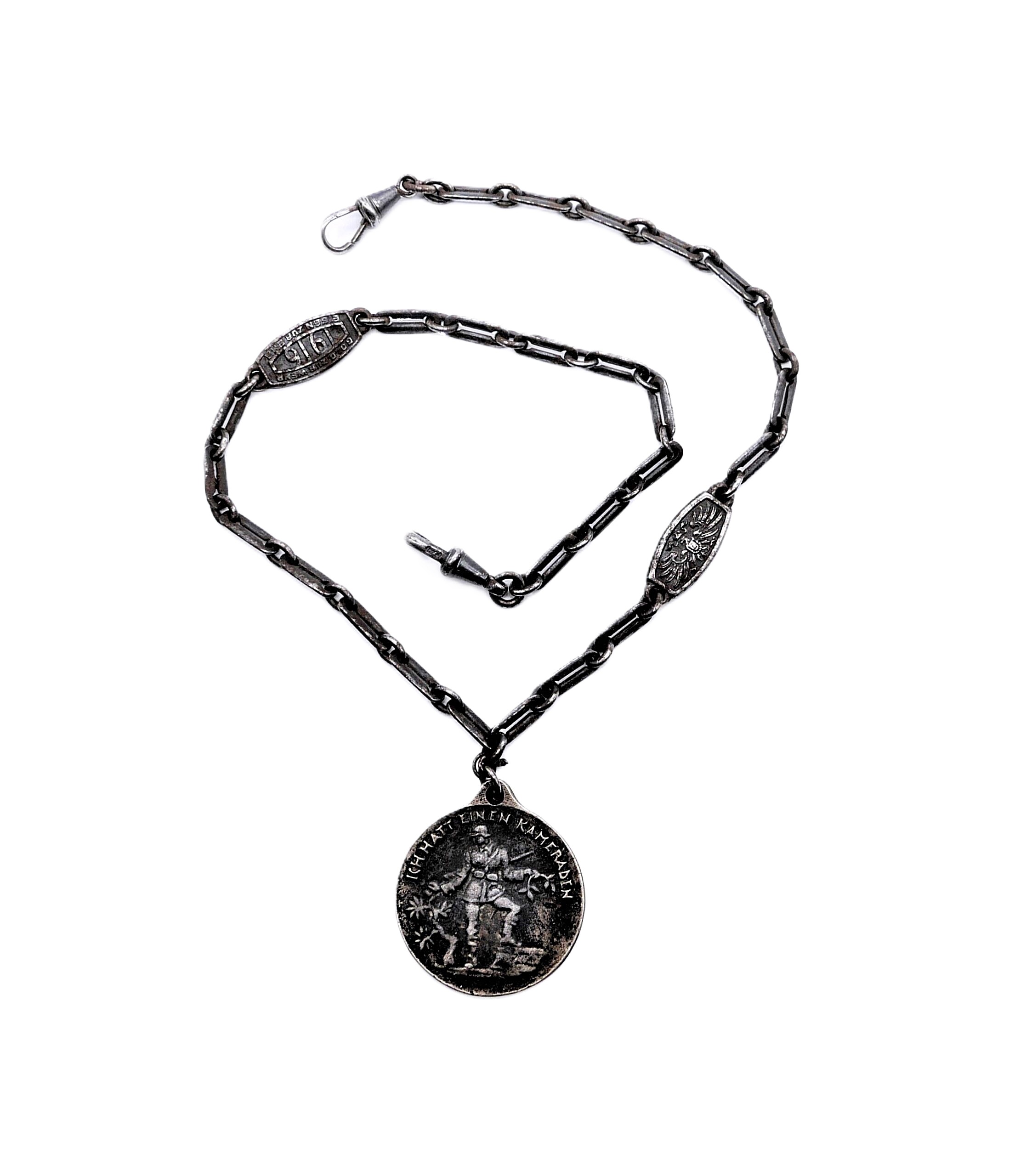 Kette mit Anhänger – Ich hatt einen Kameraden. Gold zur Ehr – Eisen zur Wehr – 1916. Getragener Zustand. Ein Verschluss defekt.