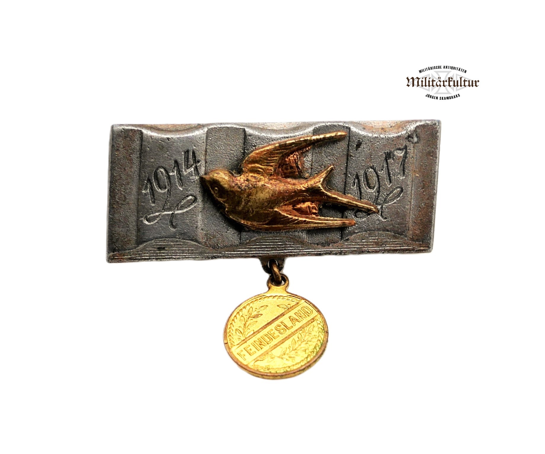 Patriotischer Schmuck mit 10 mm Medaille. Mit der Aufschrift „Andenken an Feindesland“ und einen kleinen Eisernen Kreuz. Brosche wurde aus einen Granat Führungsring hergestellt. Breite 33 mm. Oben eingraviert 1914 – 1917.