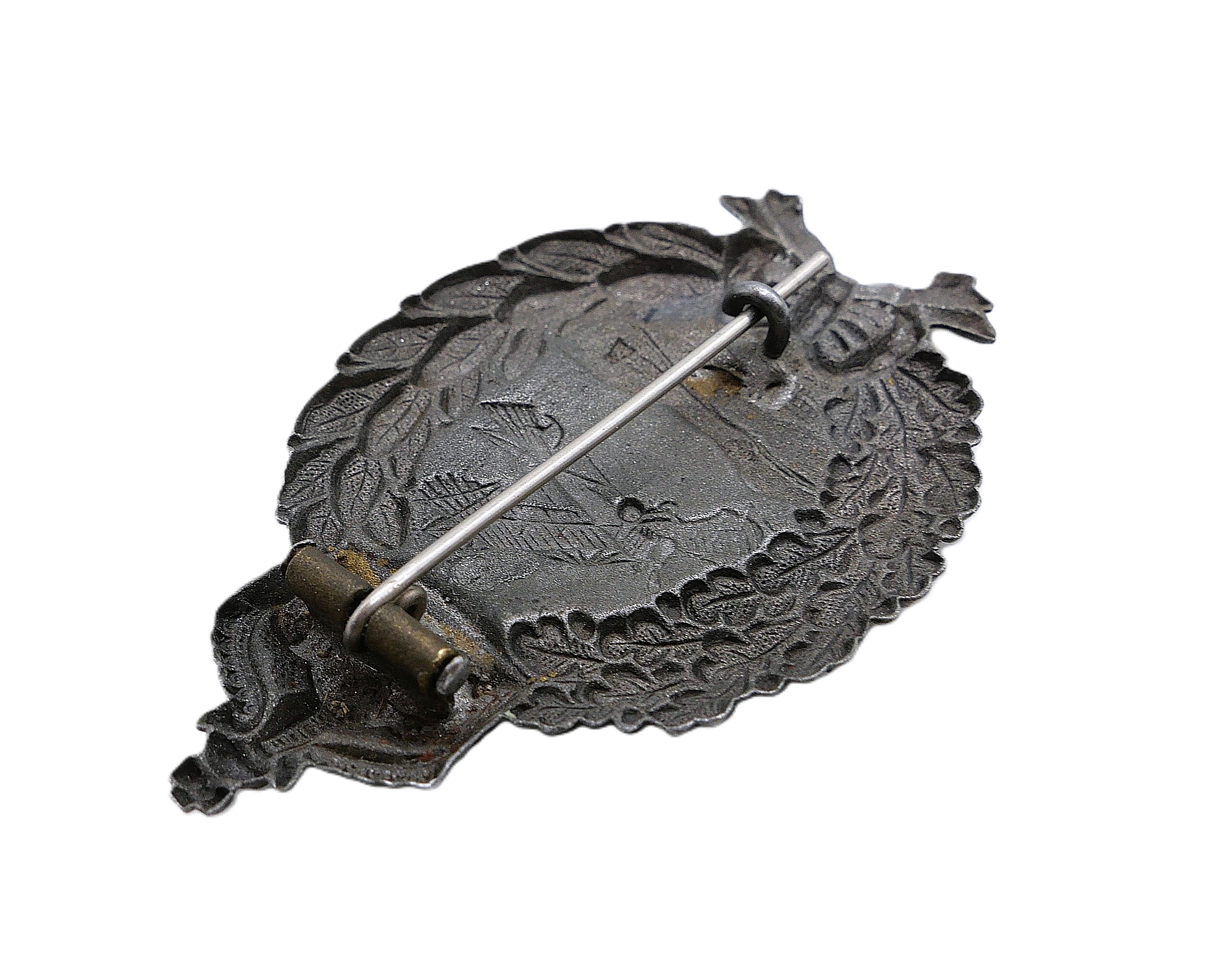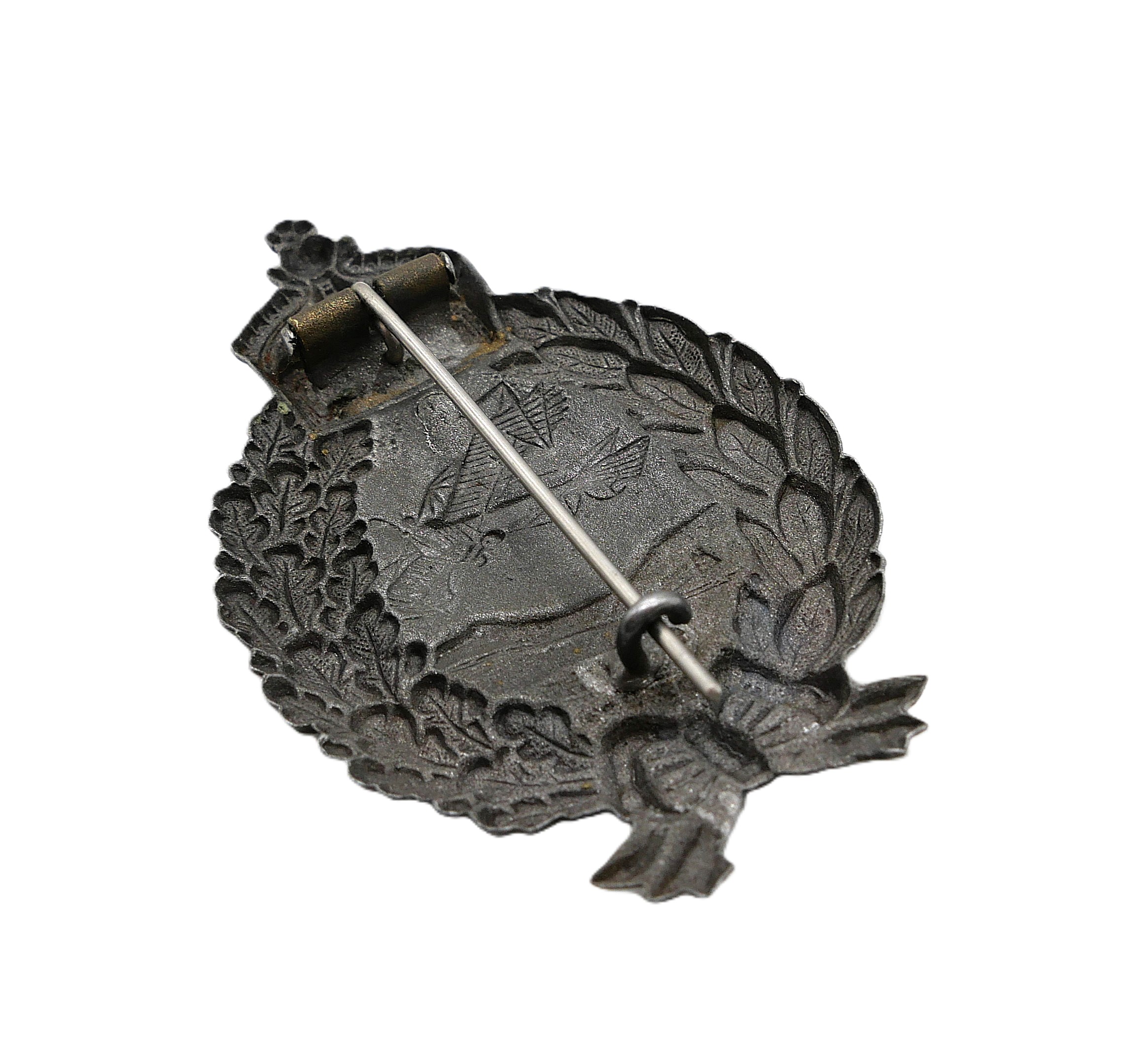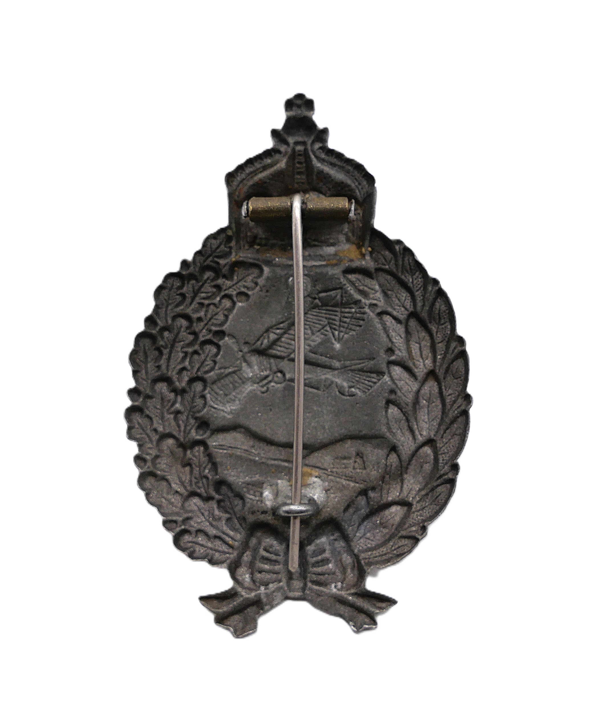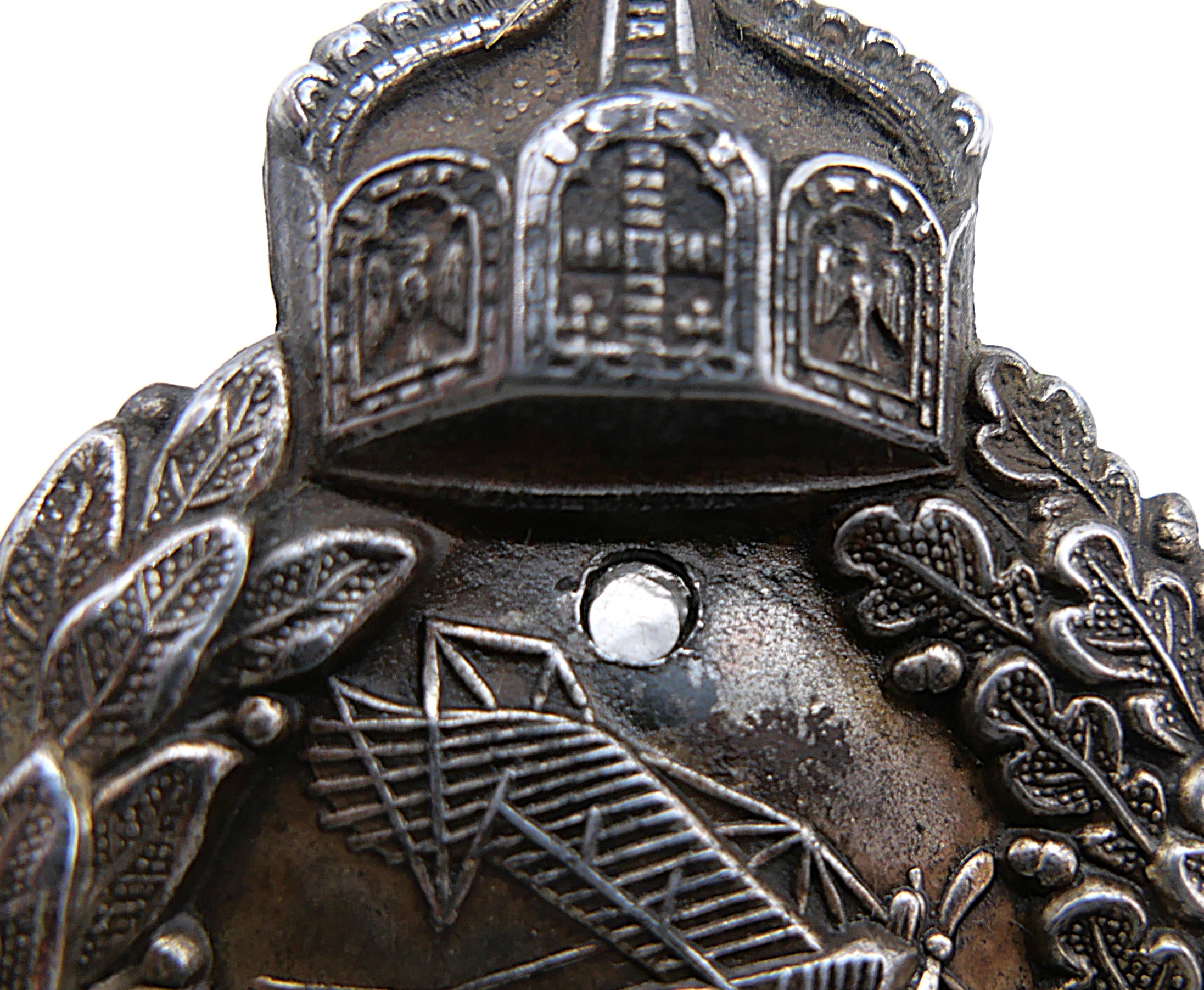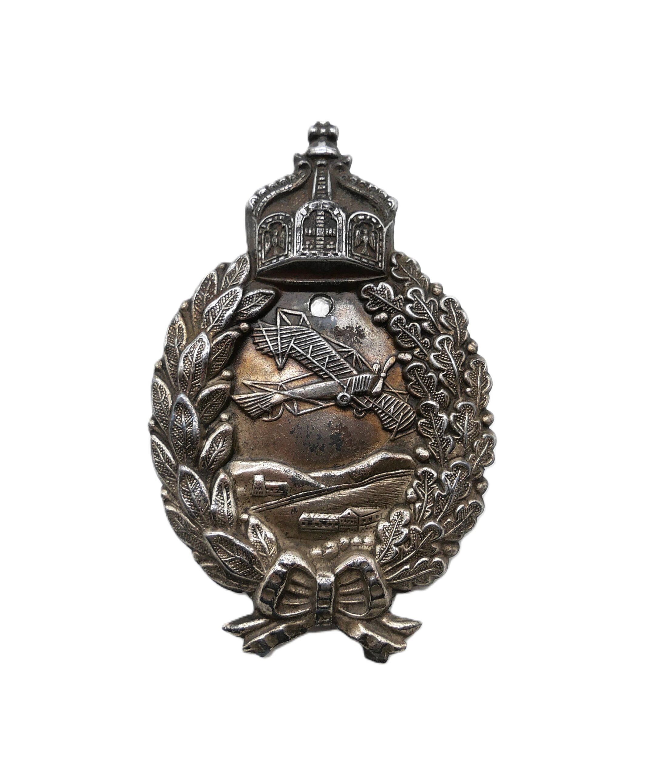 Preussen – Abzeichen für Militär-Flugzeugführer. Hohlprägung, Eisen versilbert. Zwischen Flugzeug und Krone ein Loch im Obermaterial. Getragener Zustand.
