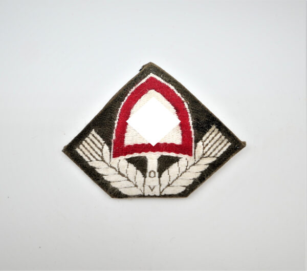 RAD Mützenabzeichen für Schiffchen und Einheitsfeldmütze. Gewebte Ausführung. Vorkonfektioniert mit Kleberesten auf der Rückseite. Getragener Zustand.