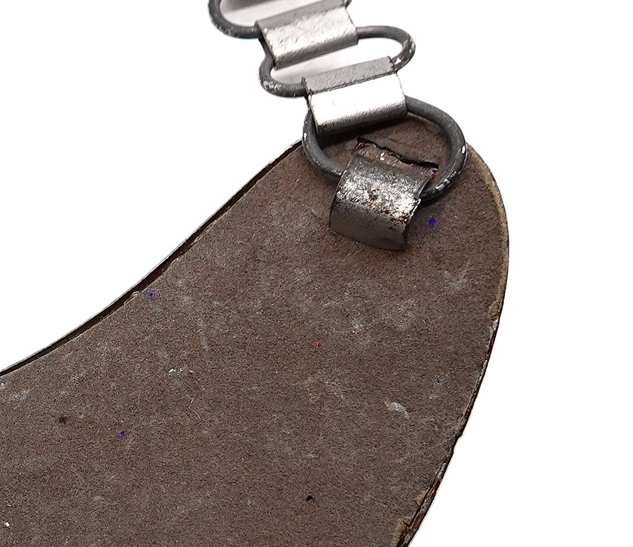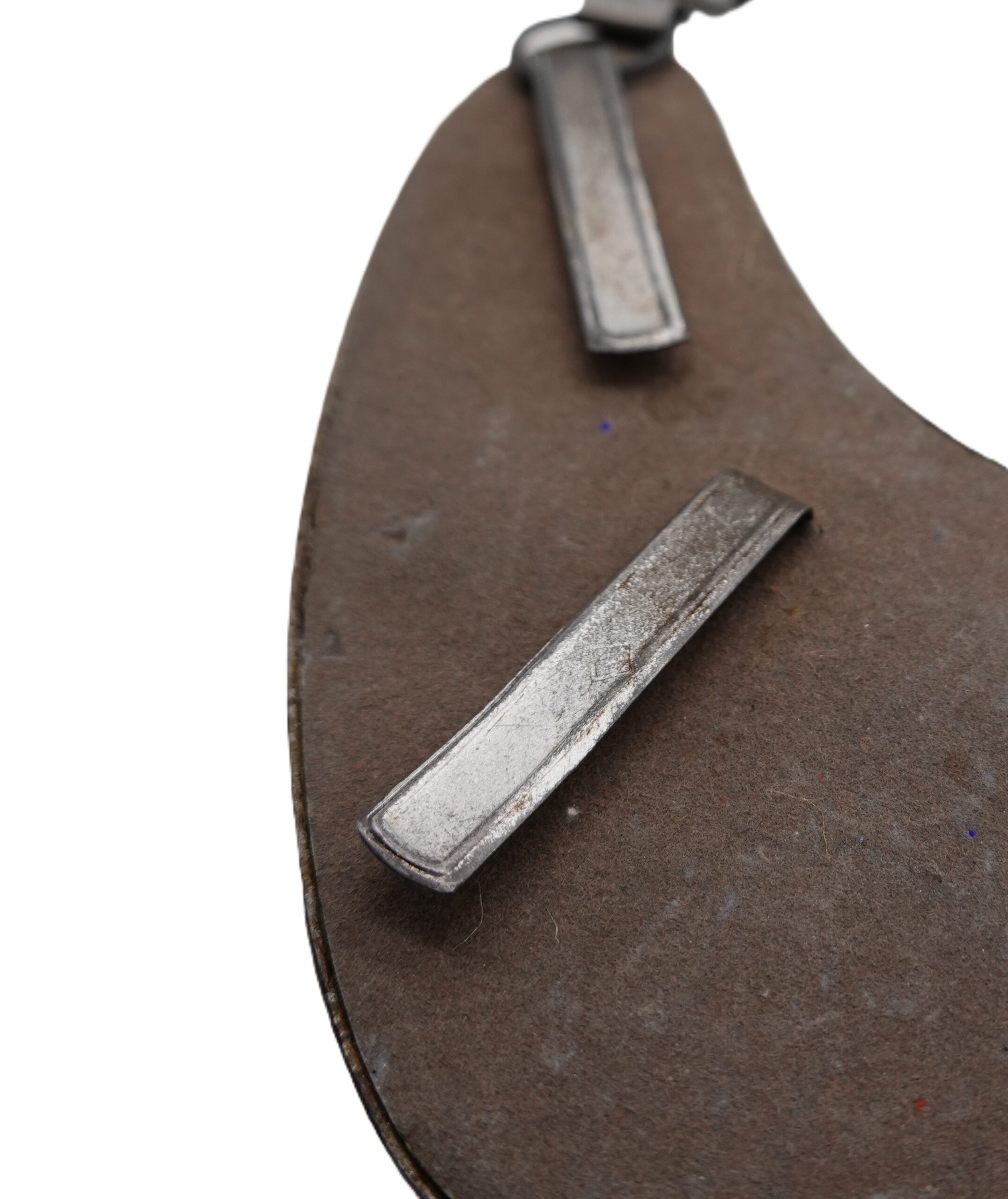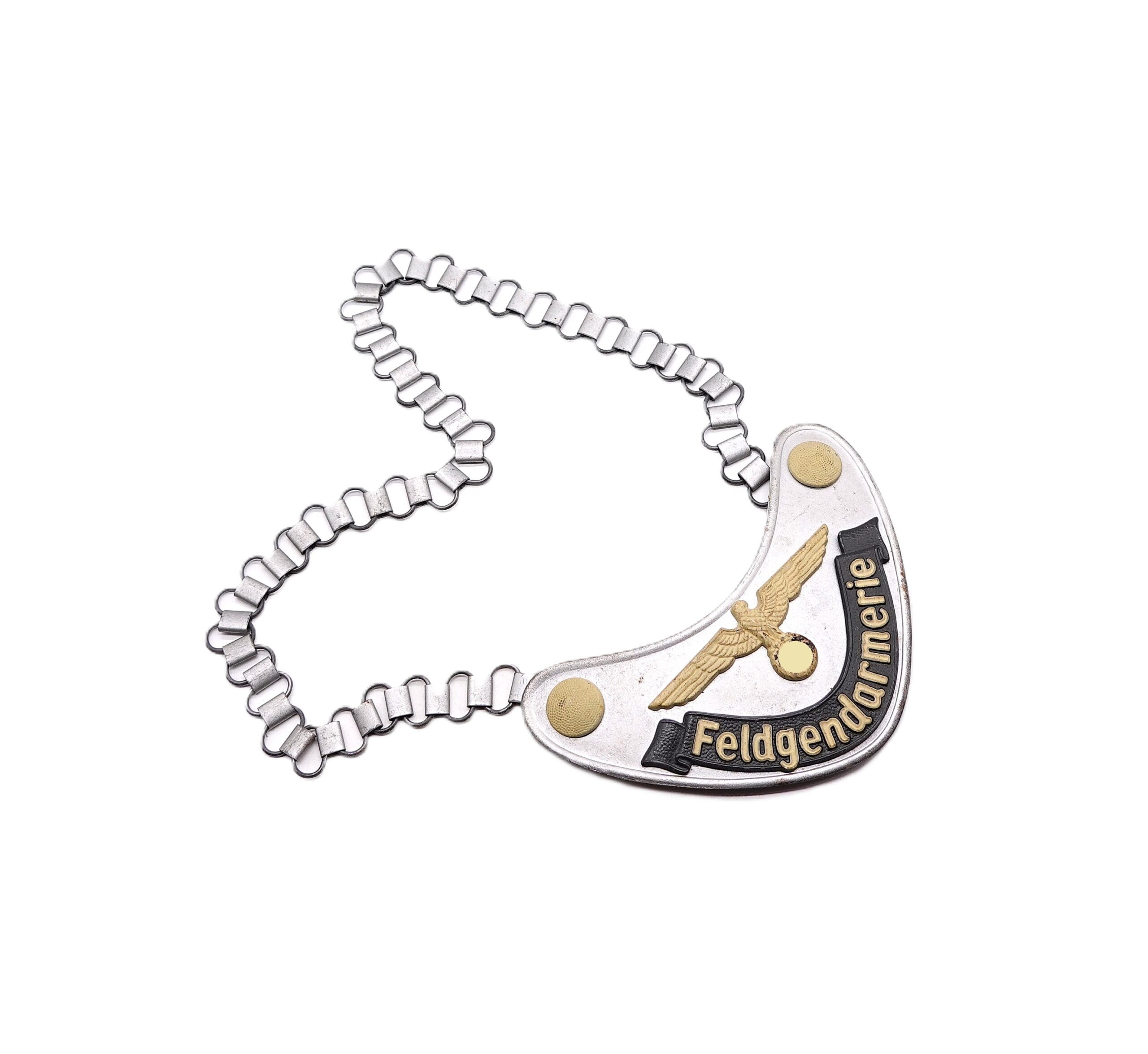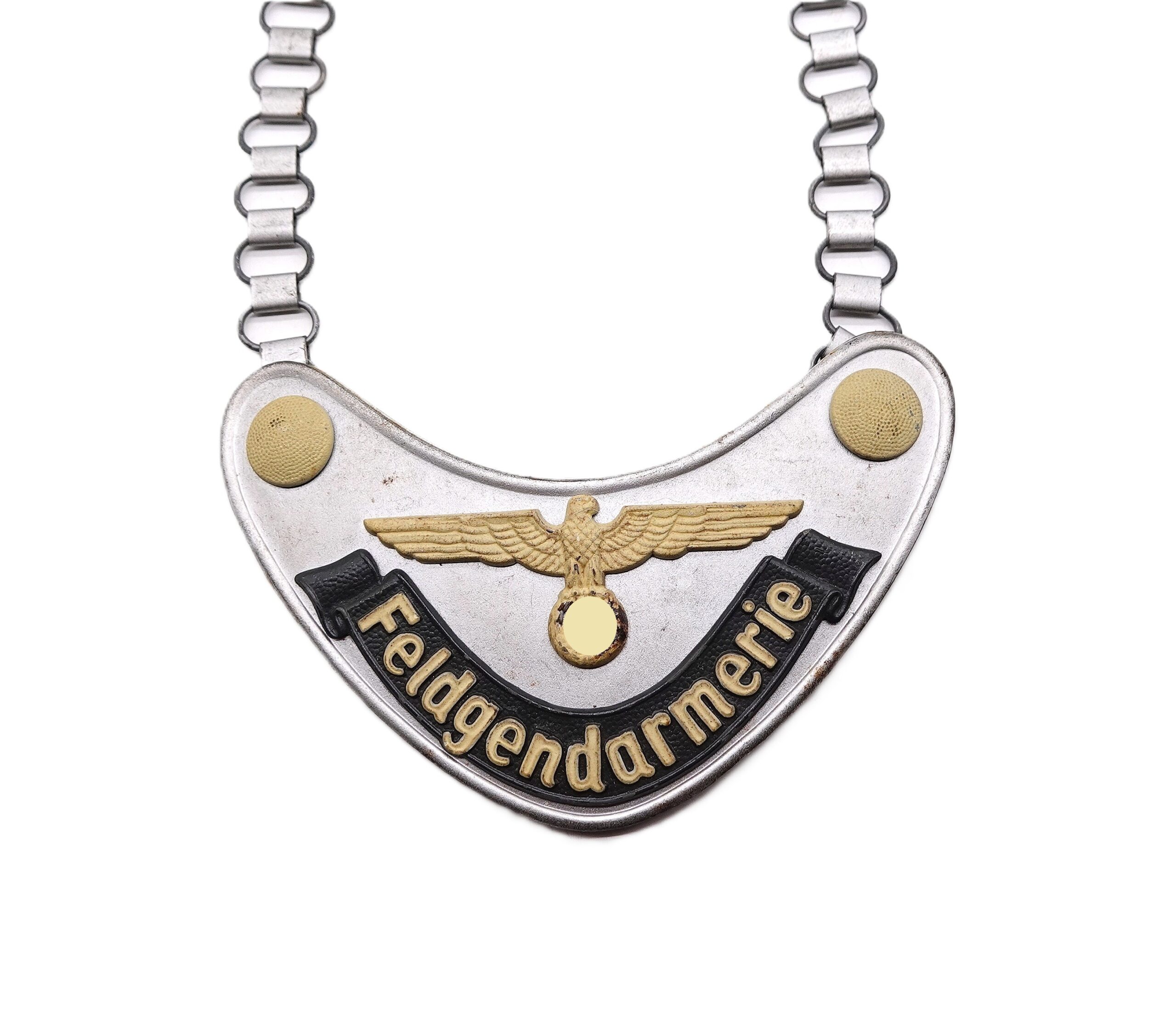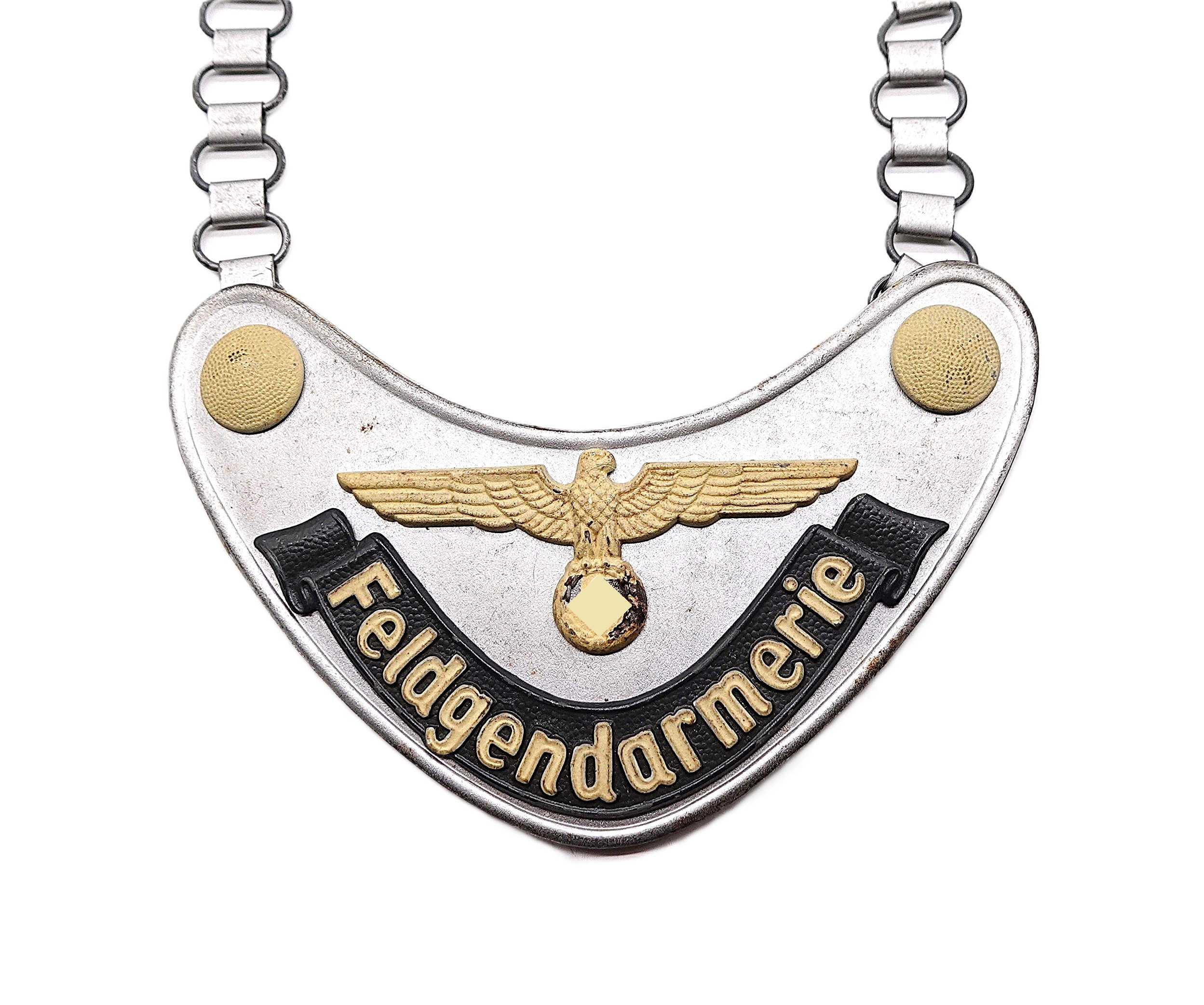 Ringkragen Feldgendarmerie. Komplett mit der Kette. Nicht markiert, aber eine gesicherte Variante des Hersteller J. C. Maedicke, Berlin. Ausführung aus Eisenblech. Adler, Knöpfe und der Schriftzug sind mit phosphoreszierender Leuchtfarbe lackiert. Rückseitig mit Pappabdeckung und Trageklammern. Kette und Schild sind magnetisch. HK und Kranz mit Abplatzern. Ansonsten ein sehr wenig getragener Ringkragen in schöner Erhaltung.