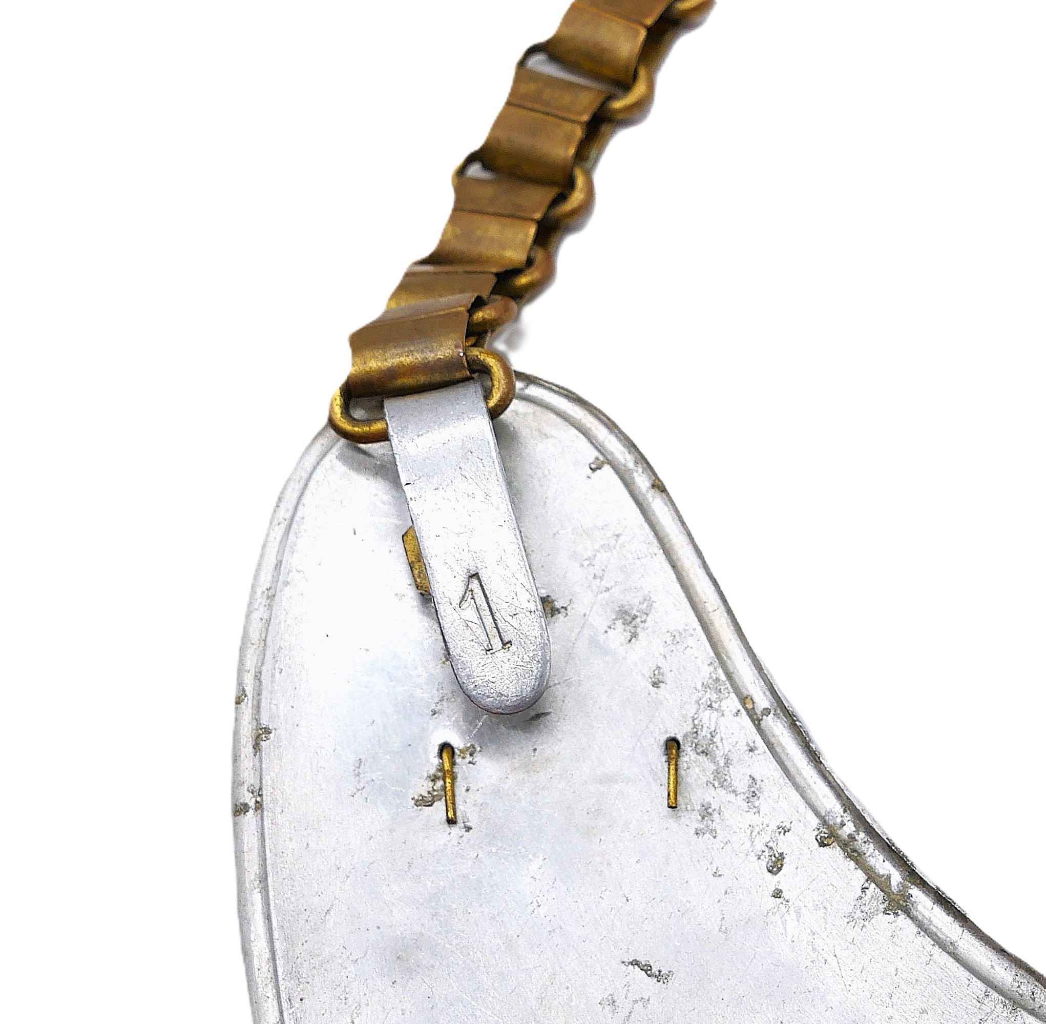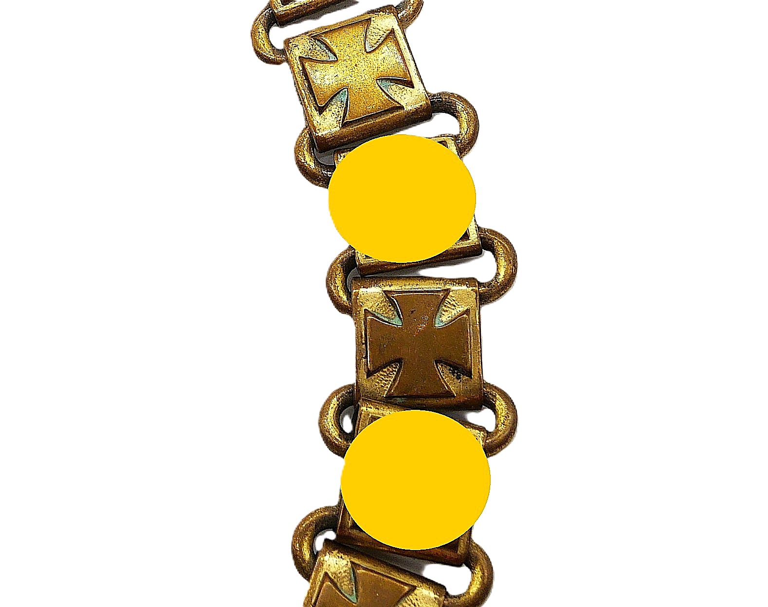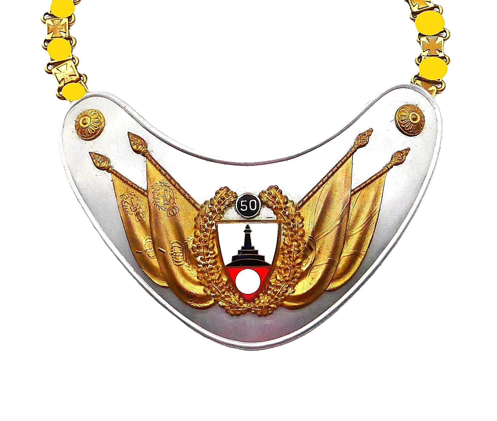Ringkragen – Reichskriegerbund – Kyffhäuser. Für Fahnenträger. Vergoldete Auflage mit der Jubiläumszahl 50. Rückseitige Tuchabdeckung fehlt. Ein Haken ist mit 1 gestempelt. Die schwarze Emaille des HK ist beschädigt. Ansonsten ein schöner, wenig getragener Zustand,