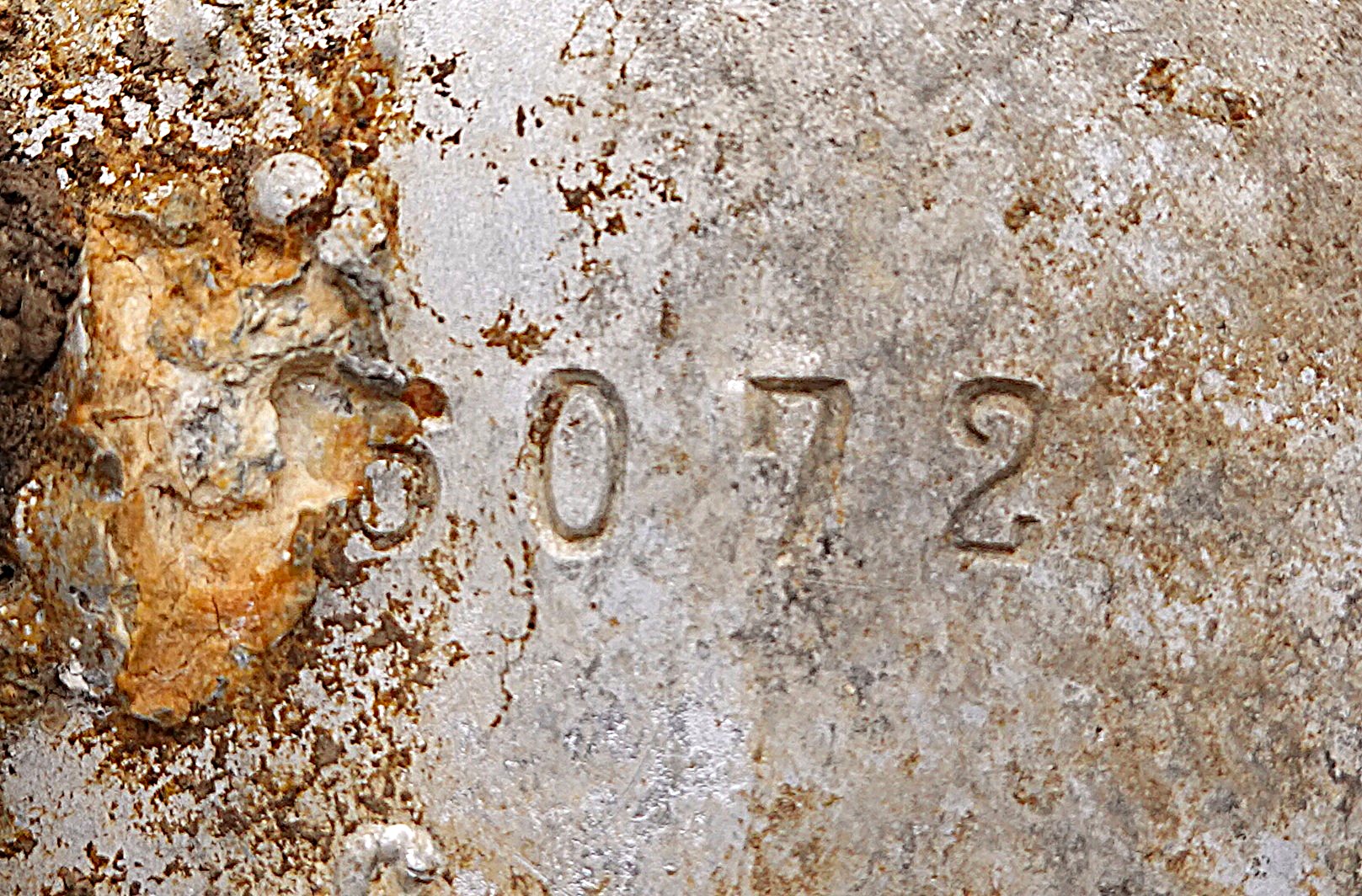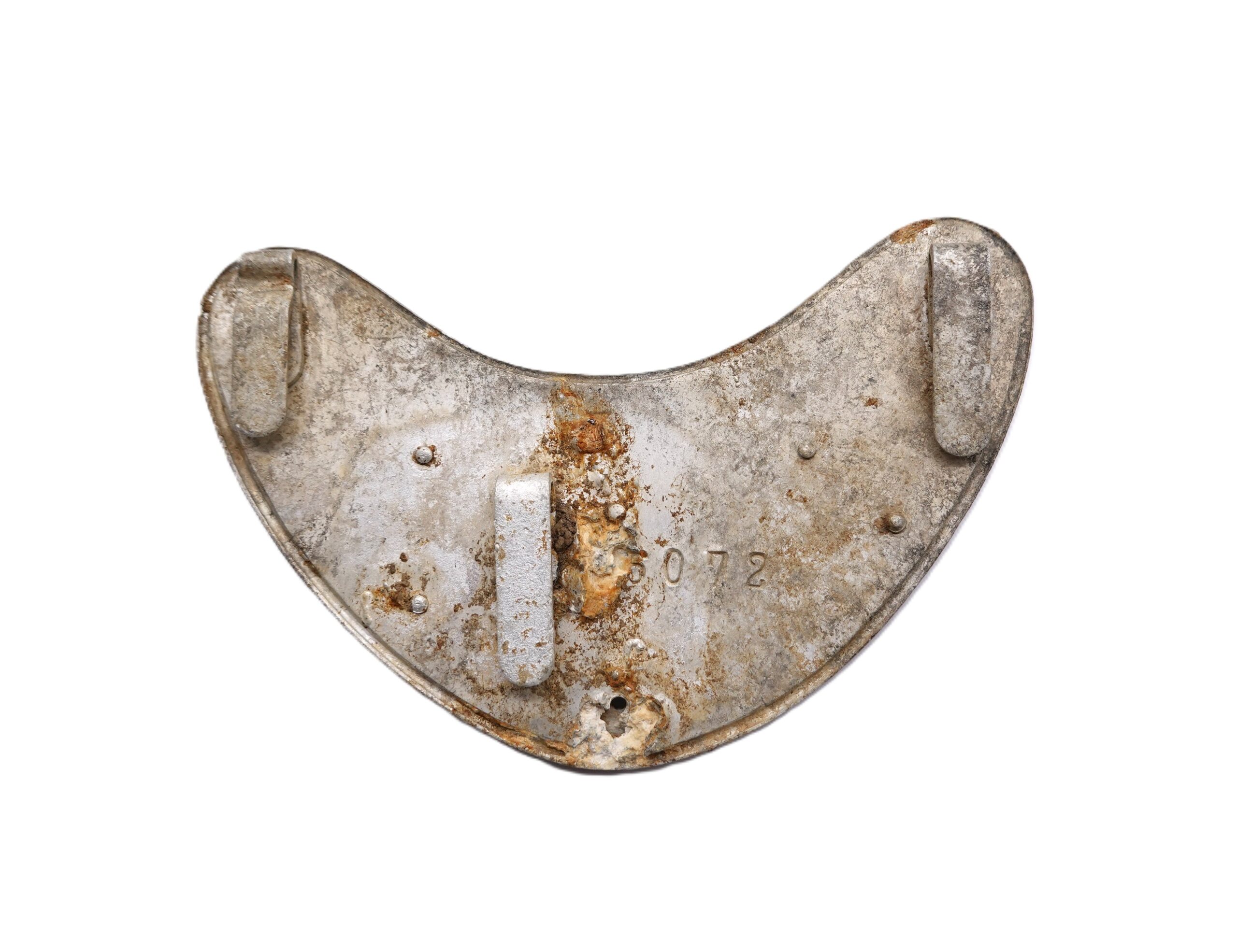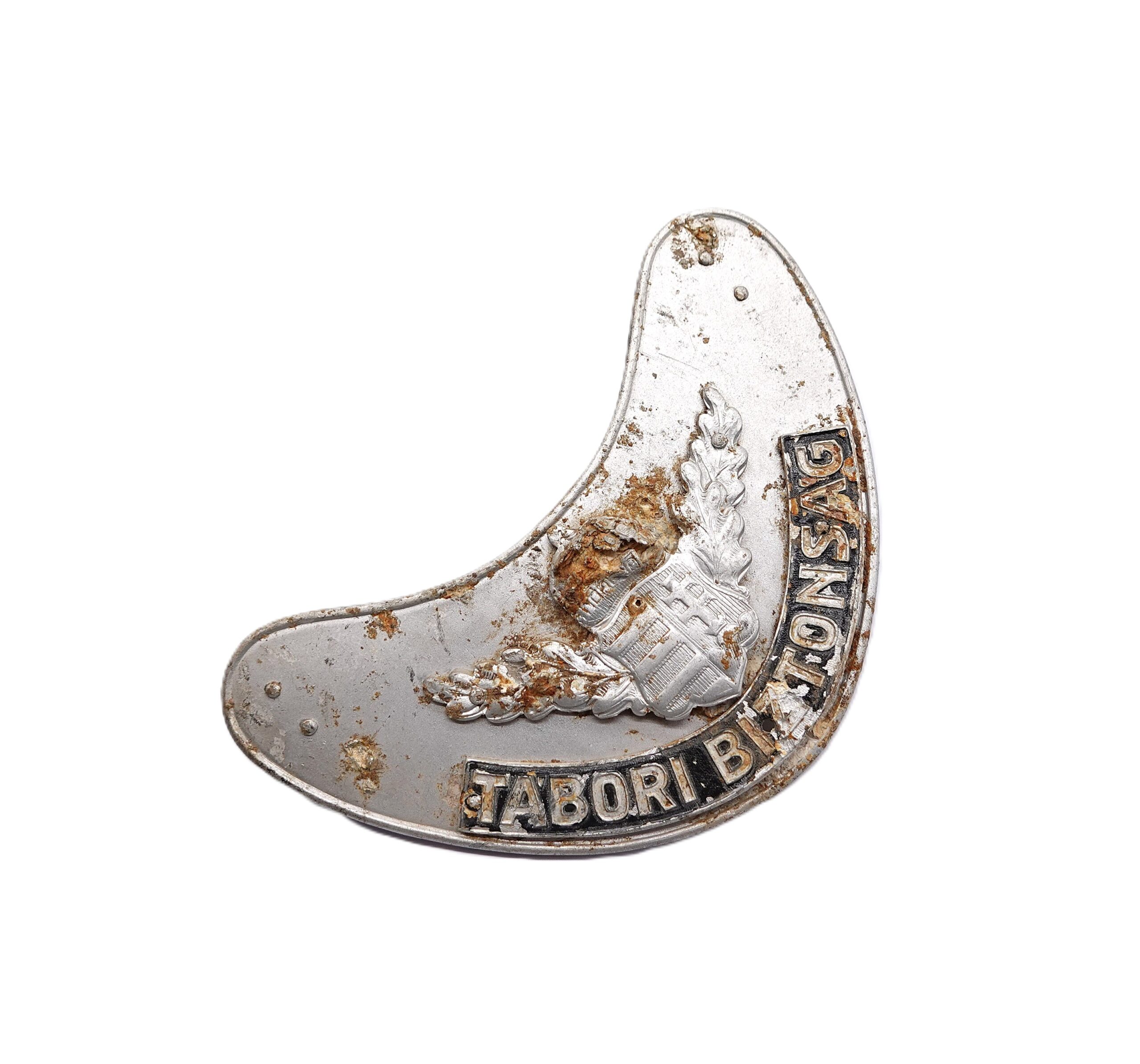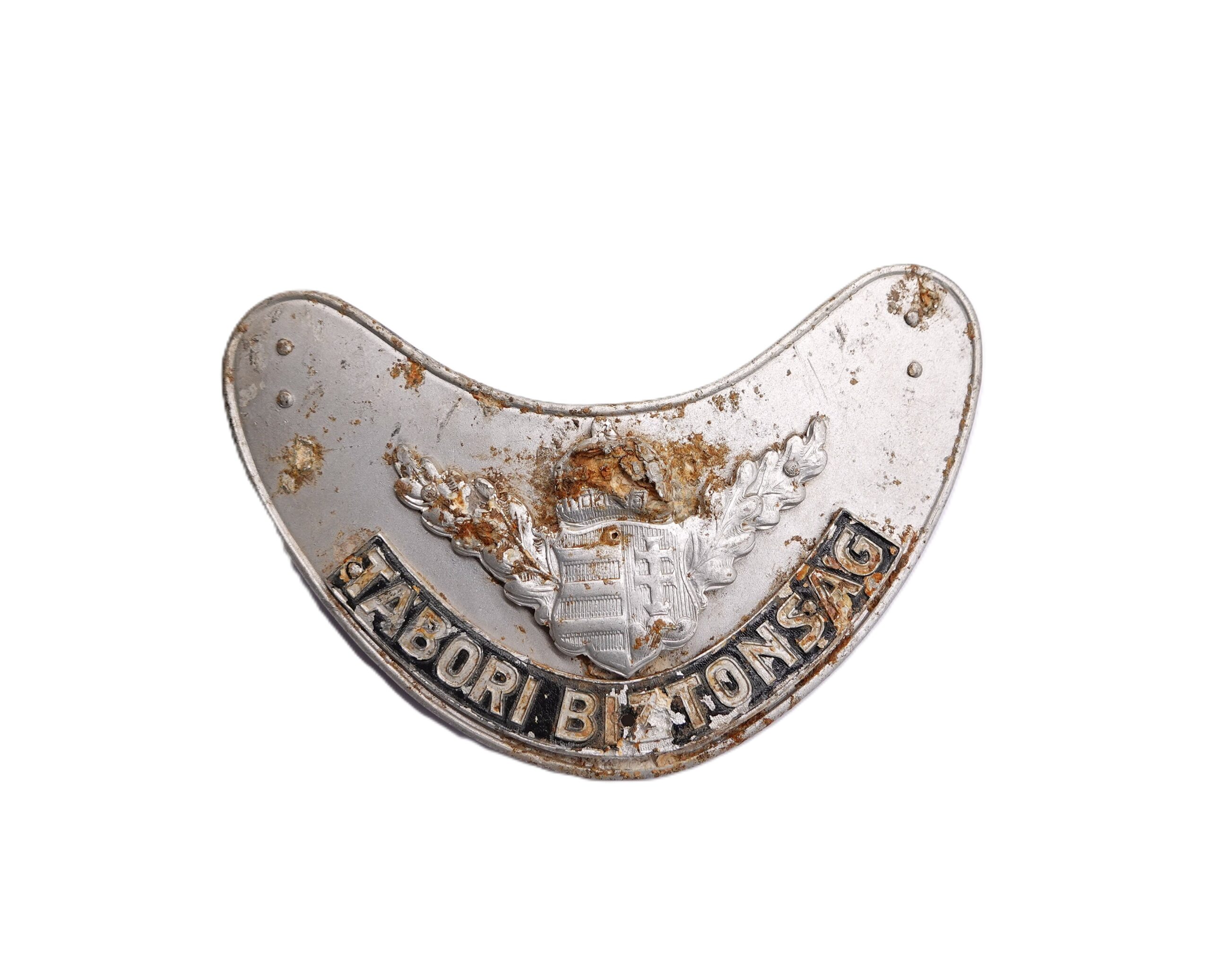 Ringkragen der Ungarischen Feldgendermerie Tabori Bizonsag. Gut erhaltener Bodenfund aus Aluminium. Ohne Kette. Mit dem aufgenieteten ungarischen Staatswappen und Schriftband. Matrikelnummer 6072.