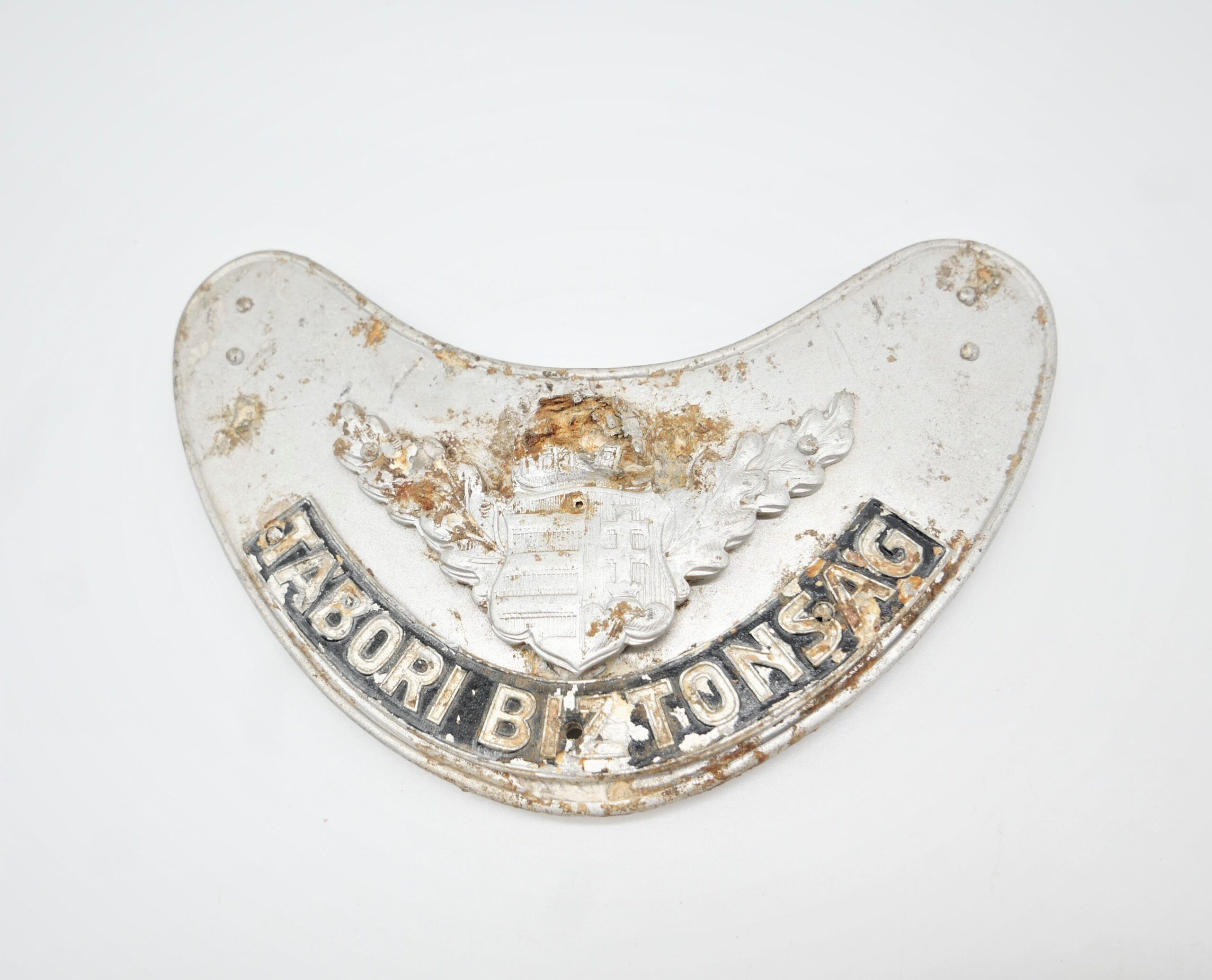 Ringkragen der Ungarischen Feldgendermerie „Tabori Bizonsag“. Gut erhaltener Bodenfund aus Aluminium. Ohne Kette. Mit dem aufgenieteten ungarischen Staatswappen und Schriftband. Von der Matrikelnummer ist nur noch ..072 lesbar.