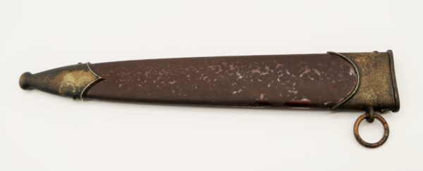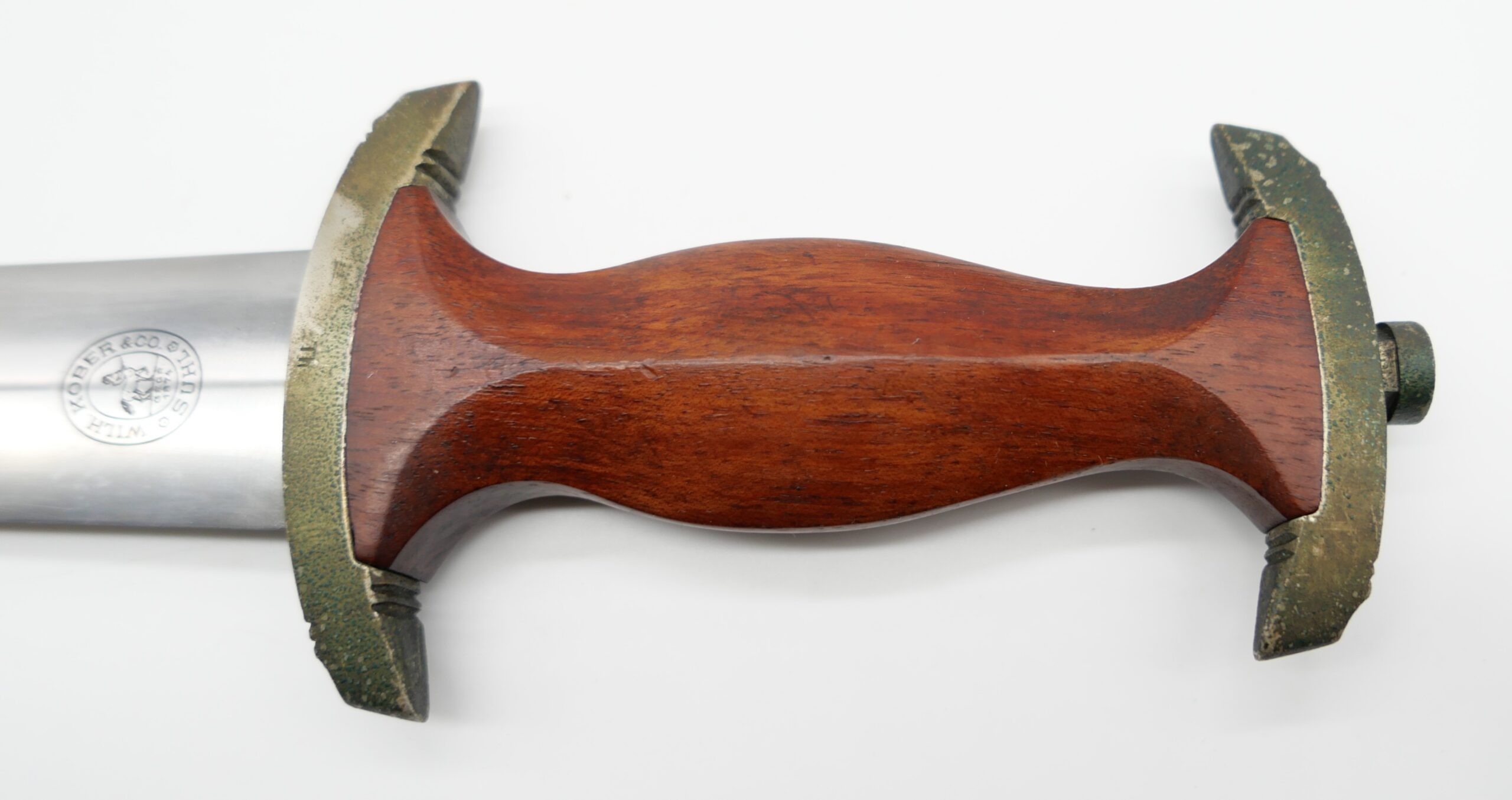 SA Dolch – Hersteller Wilh. Kober & Co., Suhl. Unberührter Fundzustand. Pastille nicht mehr ganz so schön. Auf der unteren Parierstange der Gruppenstempel Th für die SA Gruppe Thüringen. Die Klinge ist in einem guten Zustand, hat nur ein paar Abdrucke die durch die jahrelange Lagerung in der Scheide entstanden sind. Auf der Vorderseite der Klinge befindet sich die SA Devise, die Schwärzung fast vollständig erhalten. Die Scheide ist aus Eisen mit Resten der Originalbrünierung. Diese hat keine Dellen oder Beulen. Ein Dolch der verbesserungswürdig ist oder als Belegstück für die Sammlung genutzt wird. Verkauf nur an Personen ab 18 Jahre mit Altersnachweis.