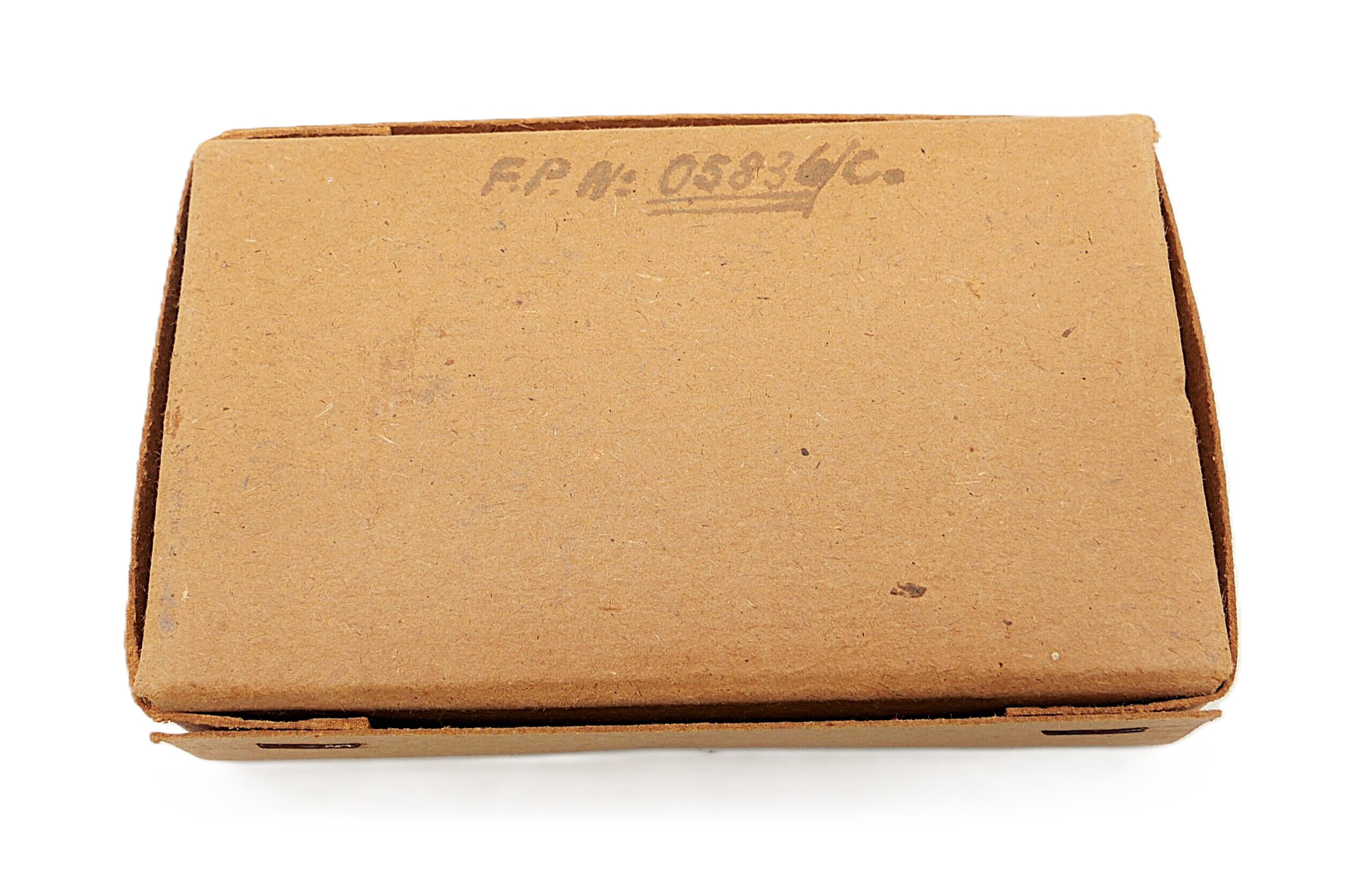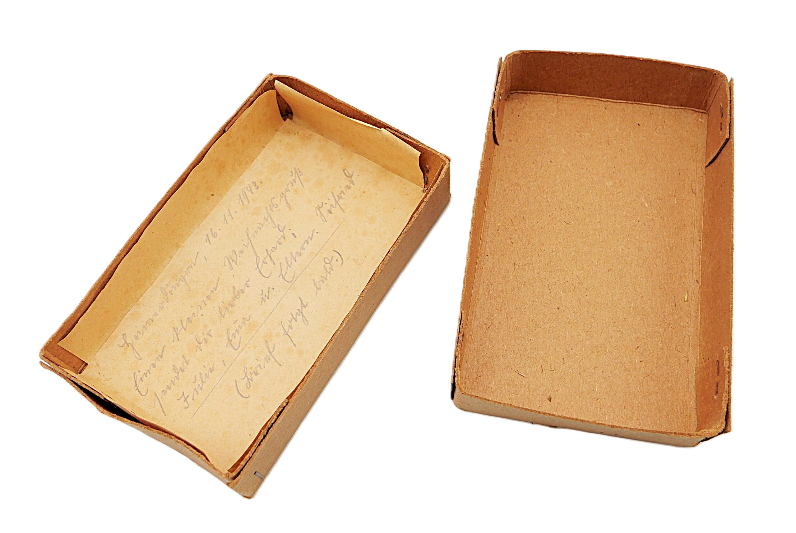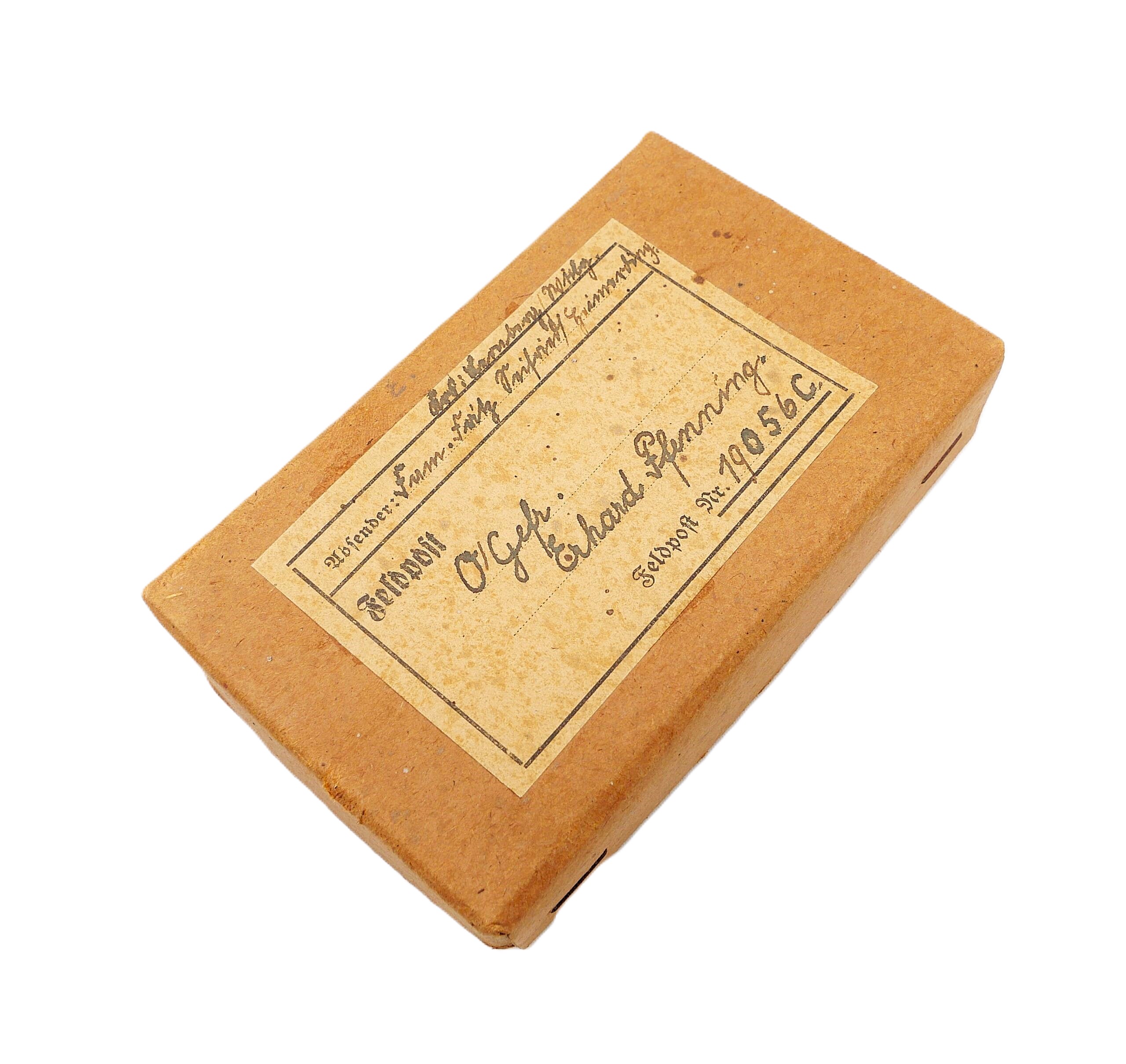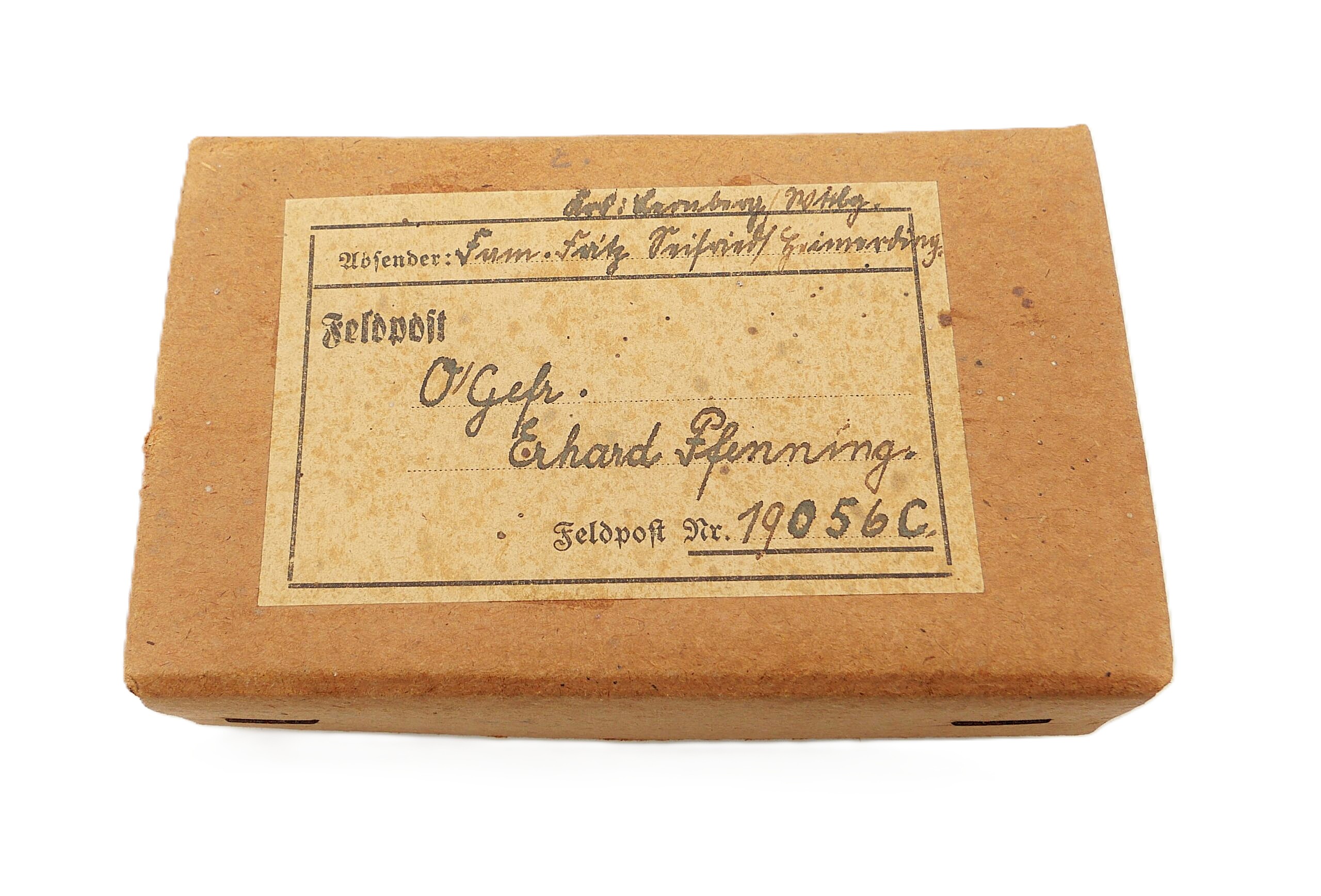 Schachtel für die Feldpost eines Obergefreiten – Feldpost-Nr. 19056C. Etwas vergilbt.