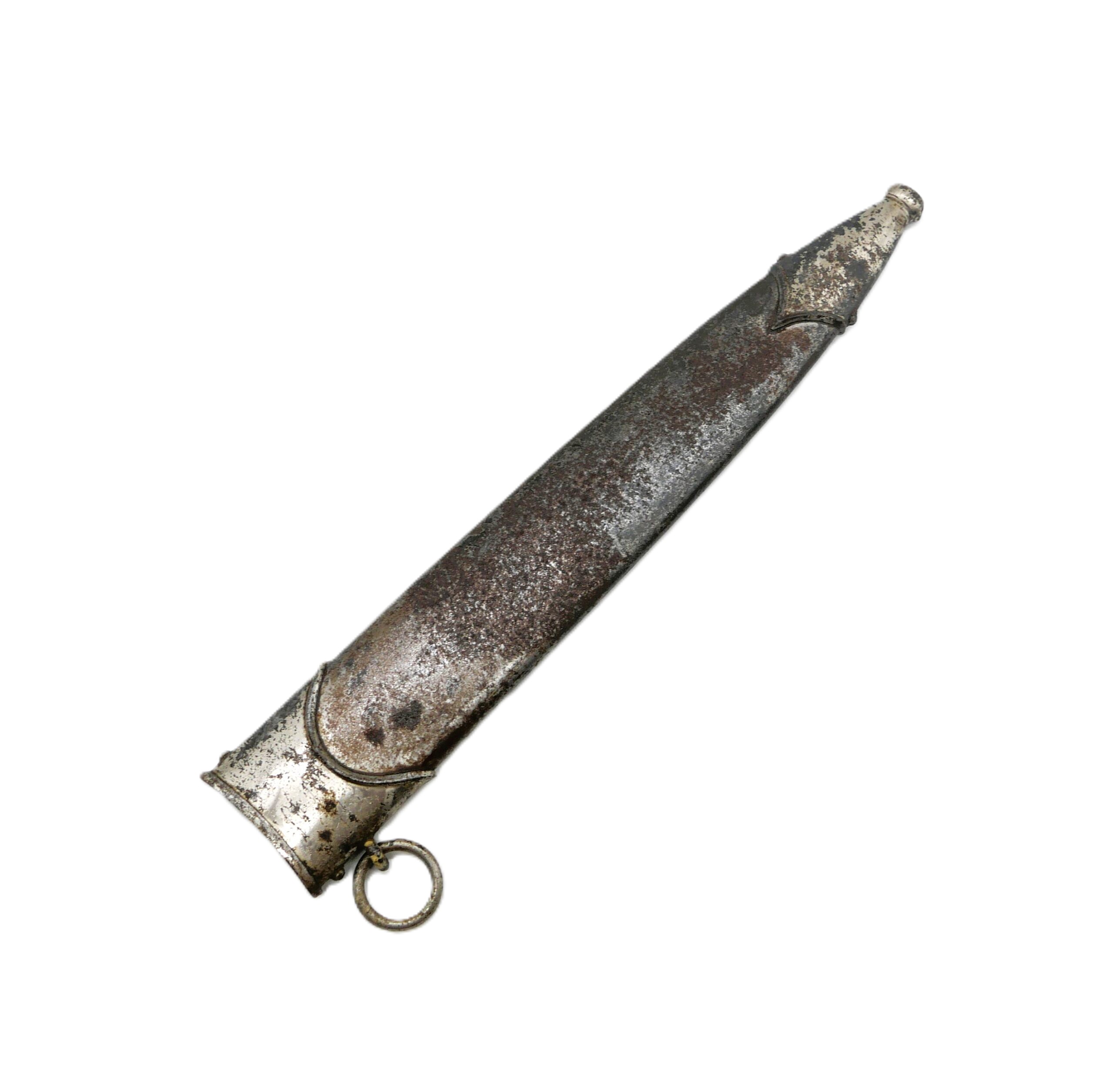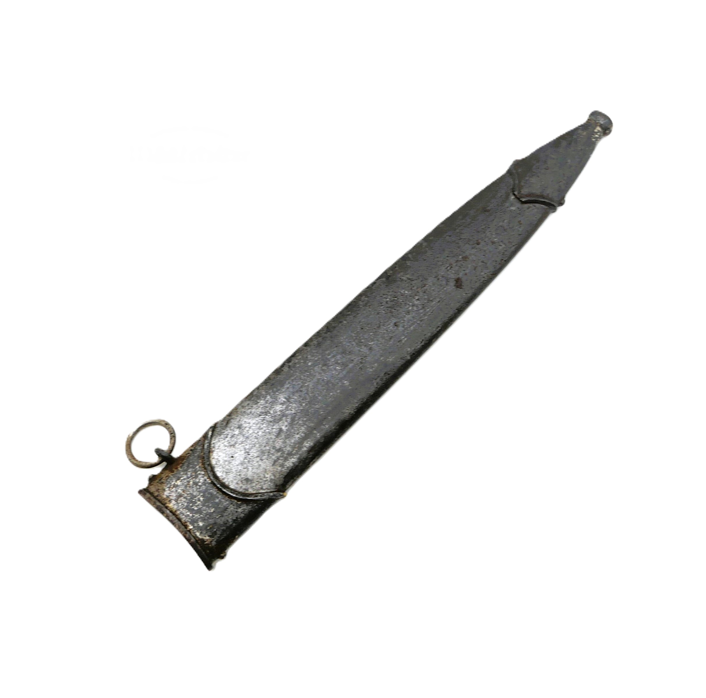 Scheide für den SA/NSKK Dienstdolch aus der späten Fertigungsperiode. Farbe ist vergangen, hat einige Rostnarben. Beim unteren Beschlag fehlt eine kleines Stück. Der Ortball eingedrückt. Gebrauchter, getragener Zustand zum Aufarbeiten. Gesuchtes Ersatzteil.