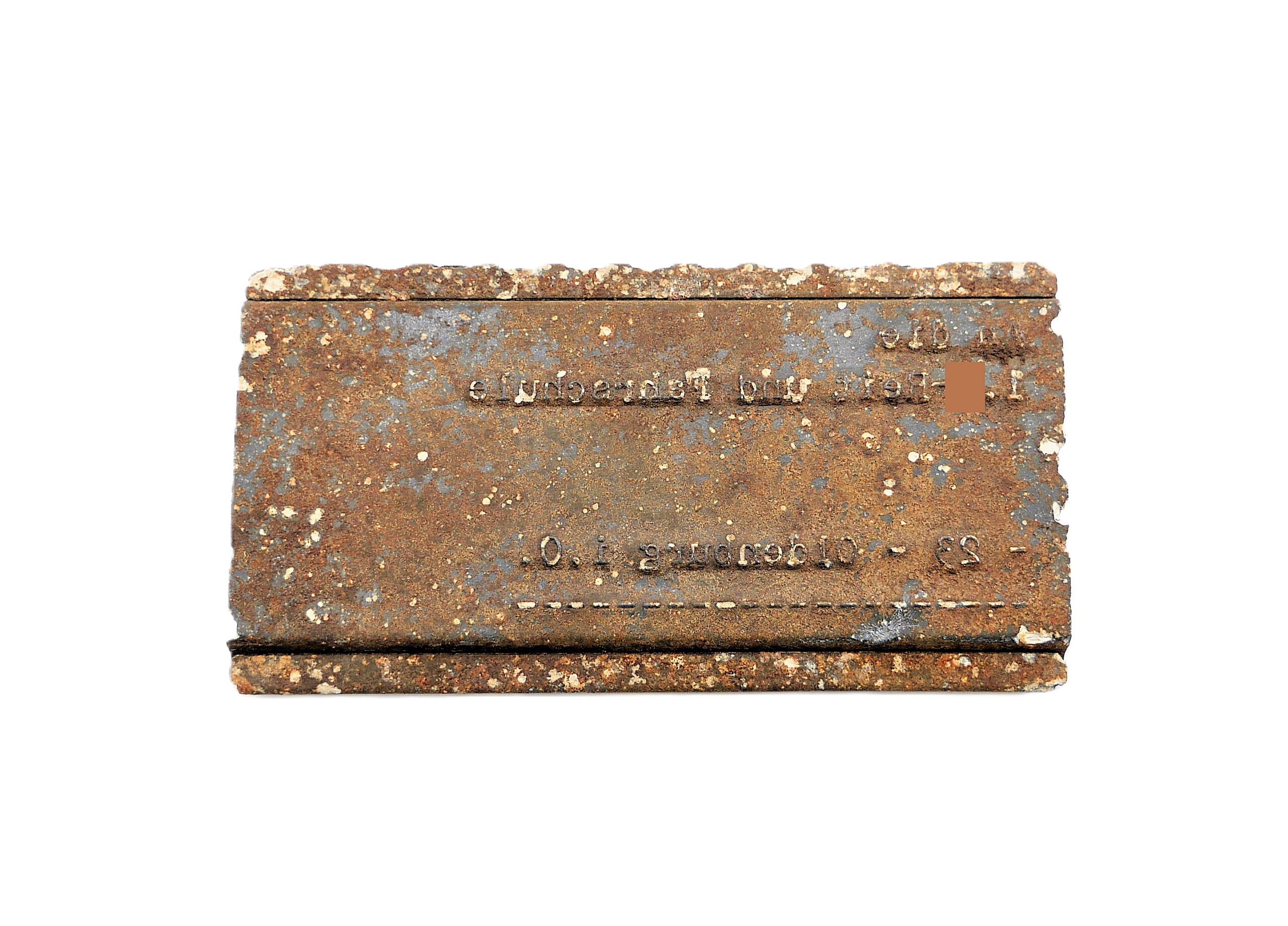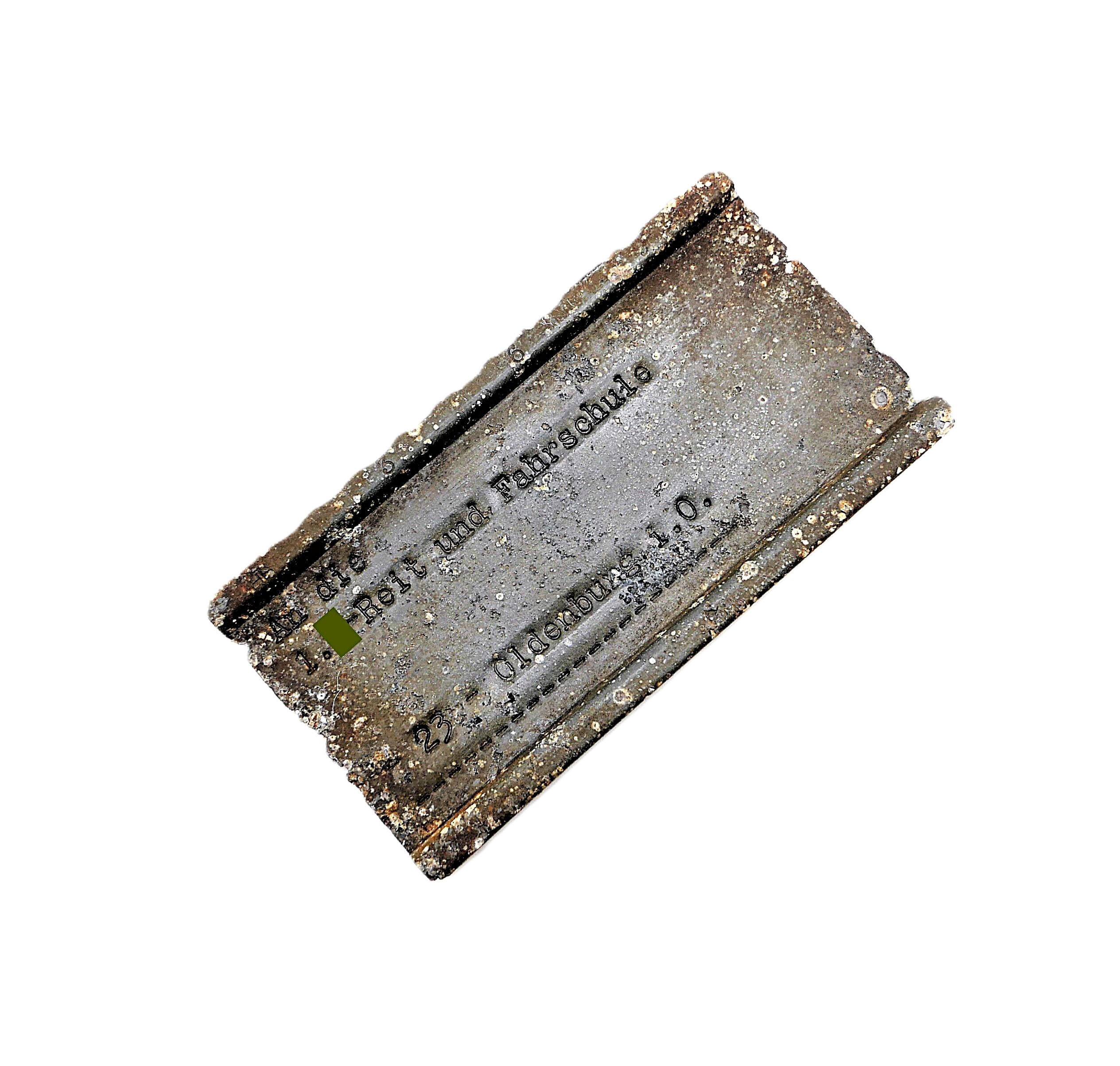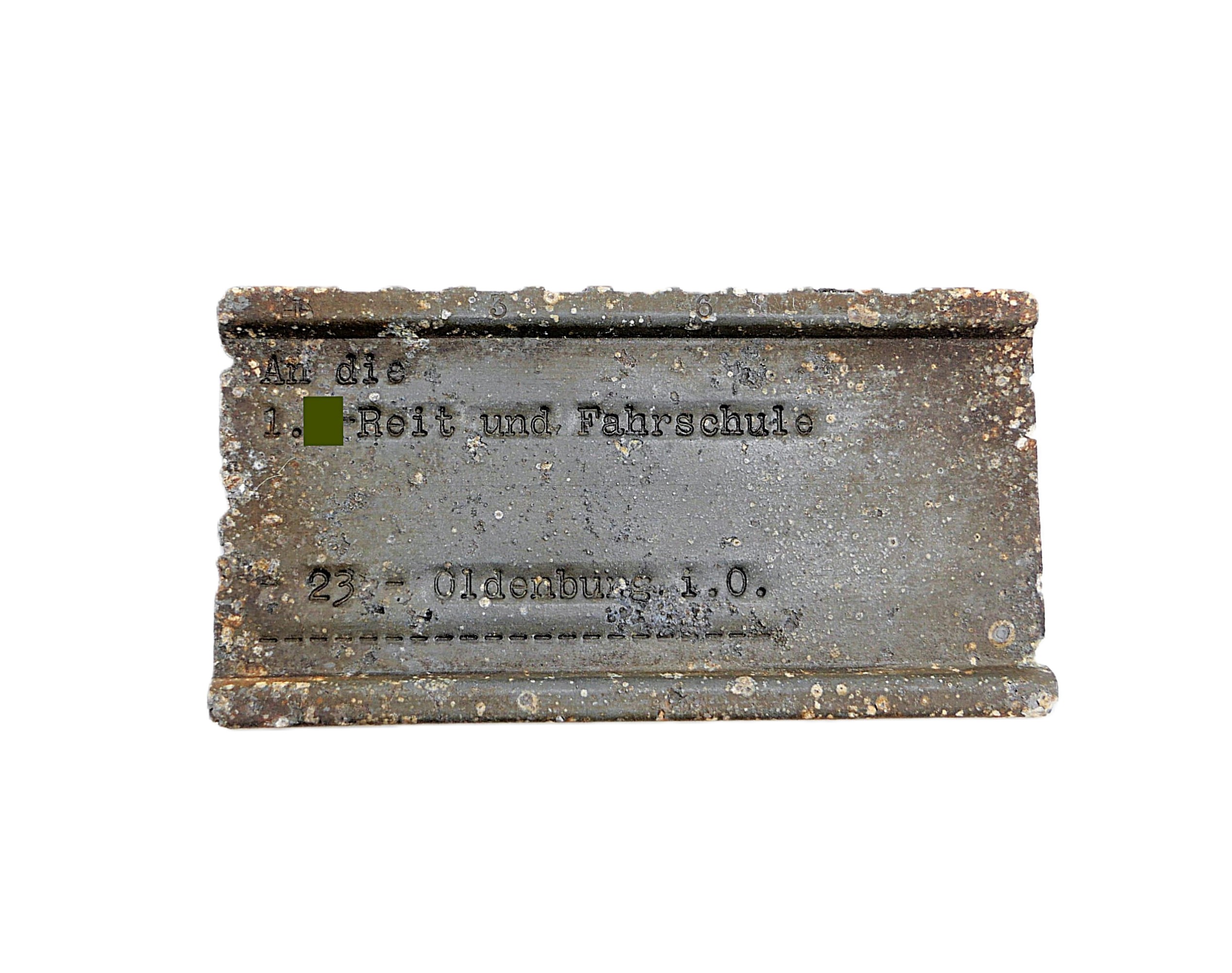 Schild aus Metall. ADREMA Karteikartensystem. Darauf eingeschlagen: An die 1. SS Reit- und Fahrschule 23 – Oldenburg i. O. Masse: 8,8 cm x 4,7cm. Gut erhaltener Bodenfund.