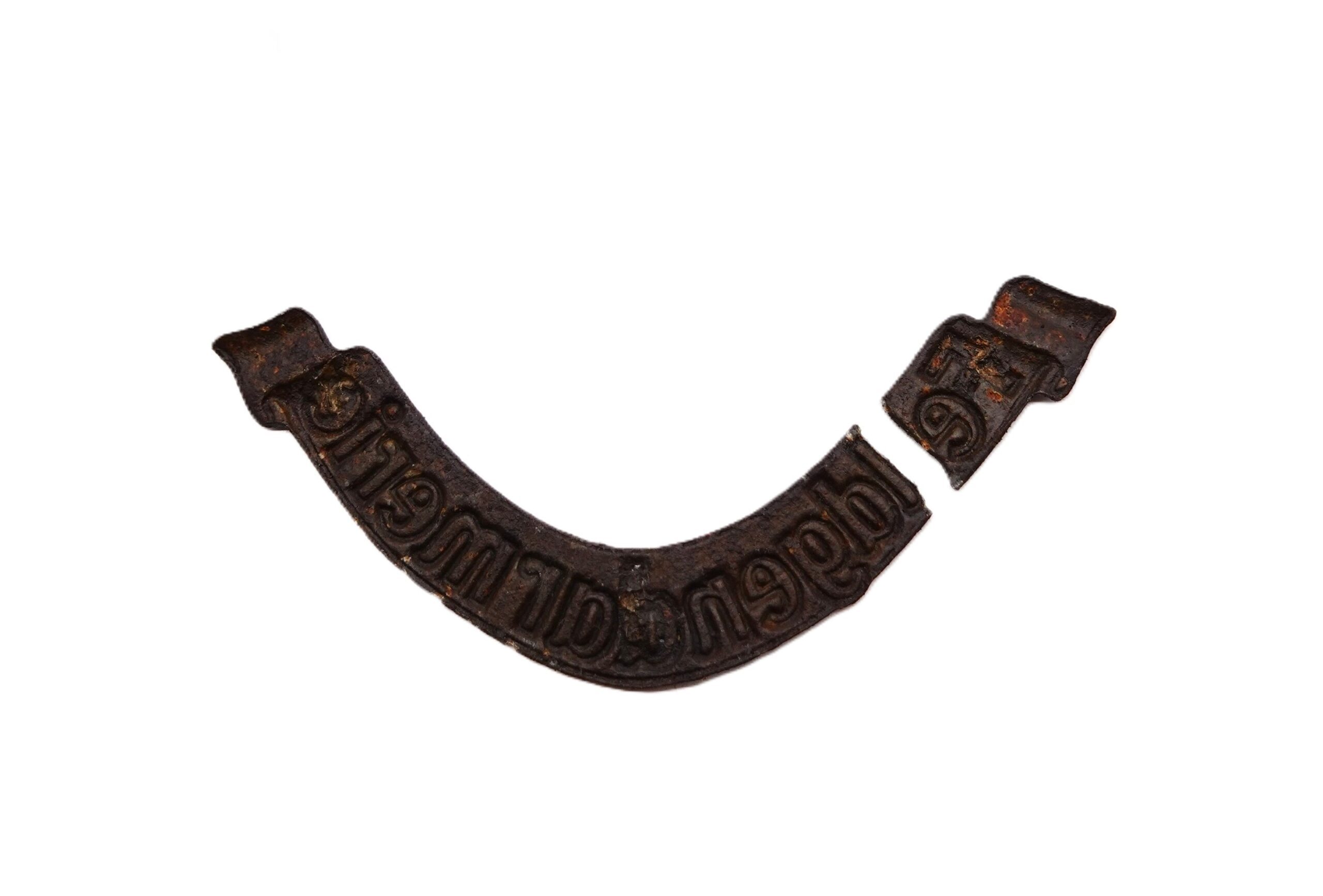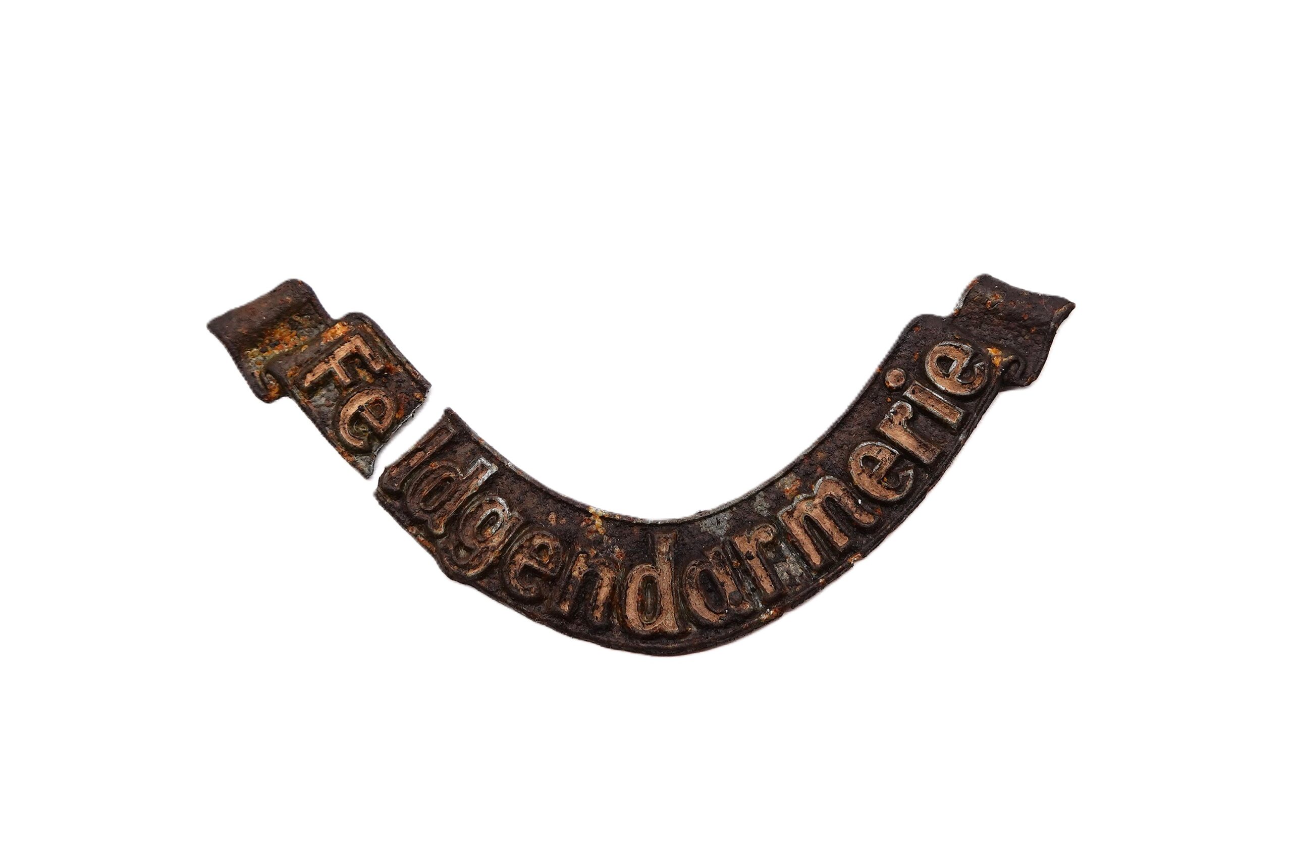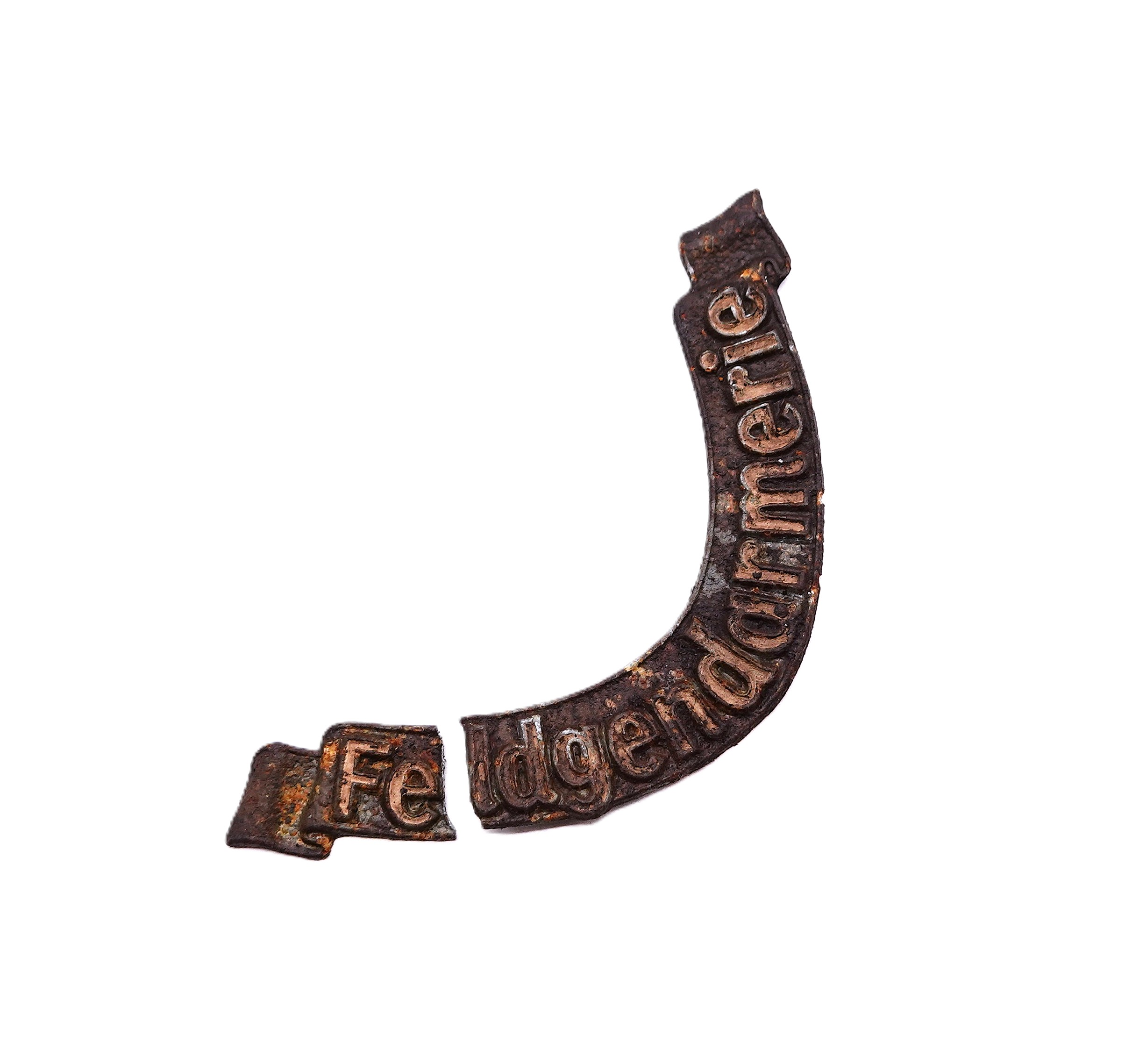 Schriftzug „Feldgendarmerie“. Seltenes Ersatzteil für den Ringkragen. Ist einmal gebrochen und die Splinte fehlen. Bodenfund.