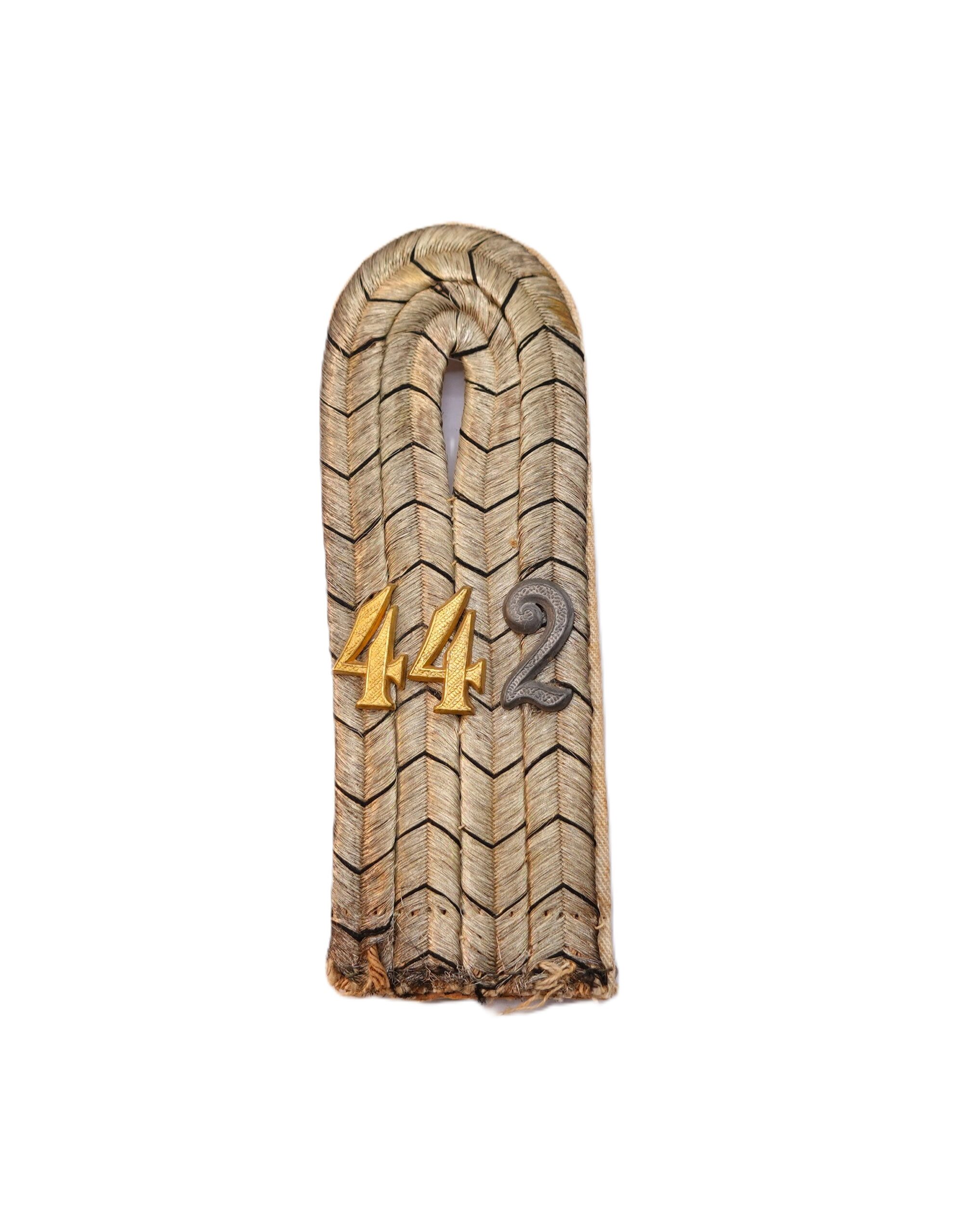 Schulterklappe zum Einnähen. Infanterie Regiment (I. R.) 442. Eine Zahl wurde wohl mal getauscht. Für einen Leutnant. Getragener Zustand.