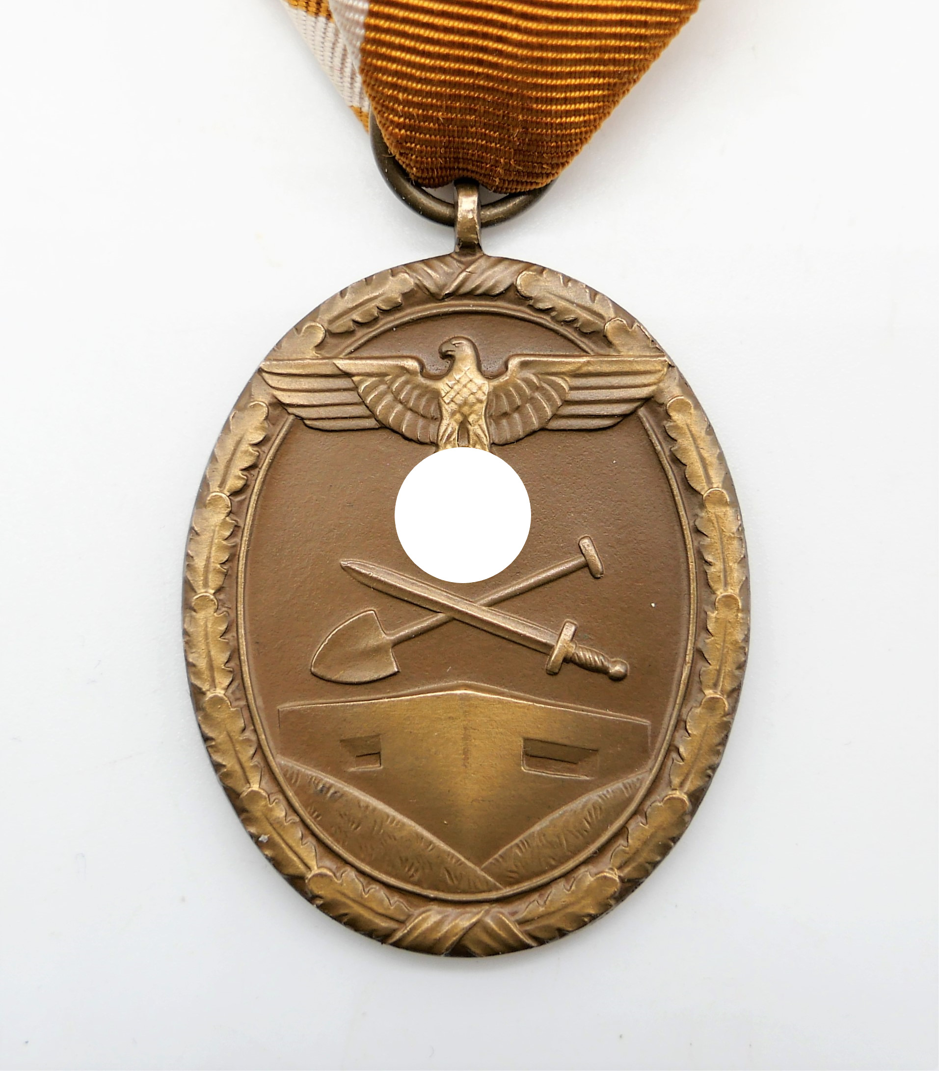 Schutzwall – Ehrenzeichen am 9 cm langen Bandabschnitt und der Verleihungstüte. Auf der Rückseite der Tüte ist der Hersteller Hermann Wernstein, Jena-Löbstedt aufgedruckt. Ausführung in Buntmetall. Schönes Set.