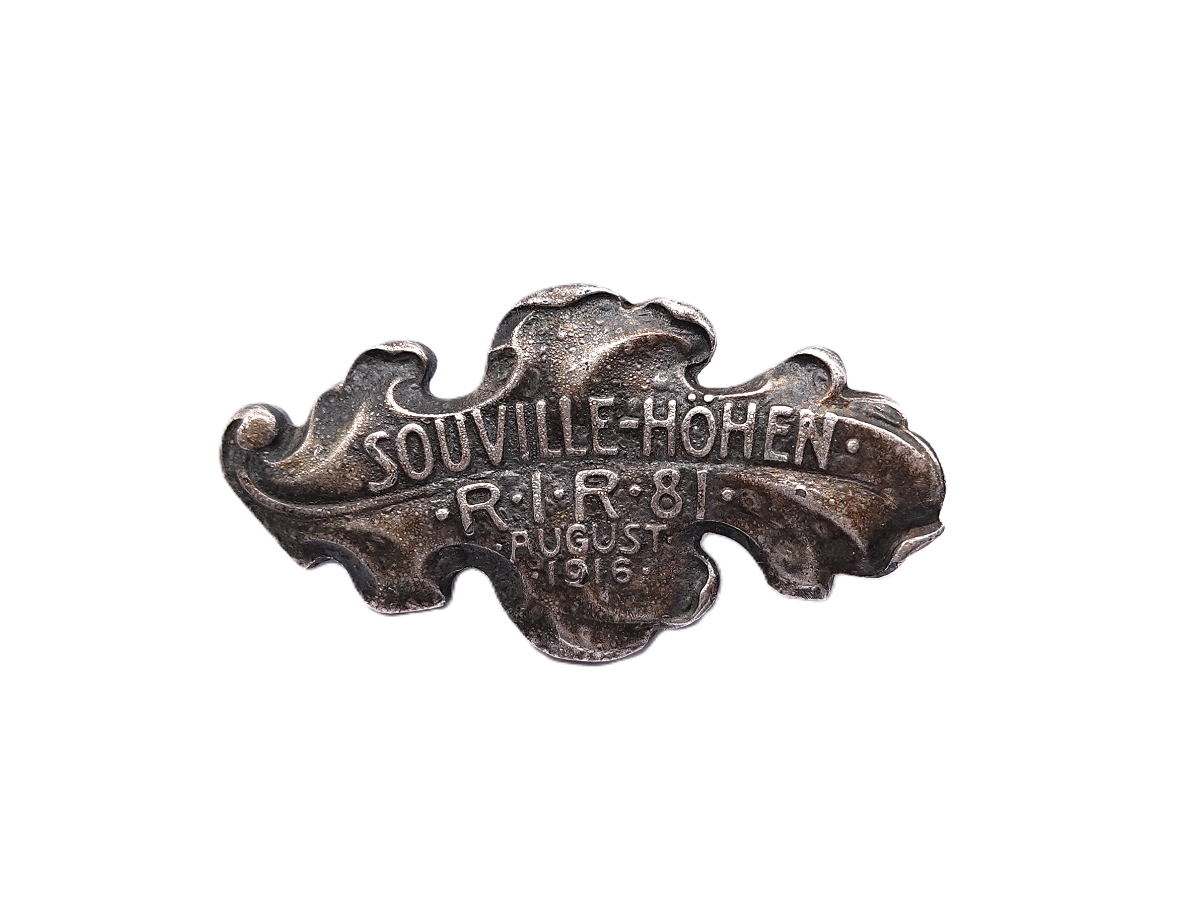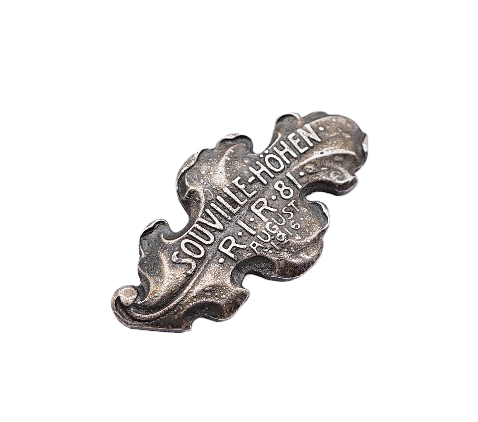 Souville-Höhen – Eichenlaubspange für das Reserve-Infanterie-Regiment – RIR 81. Für die Teilnahme an den Gefechten bei Souville im August 1916. Zinkausführung ohne Hersteller. Getragener Zustand.